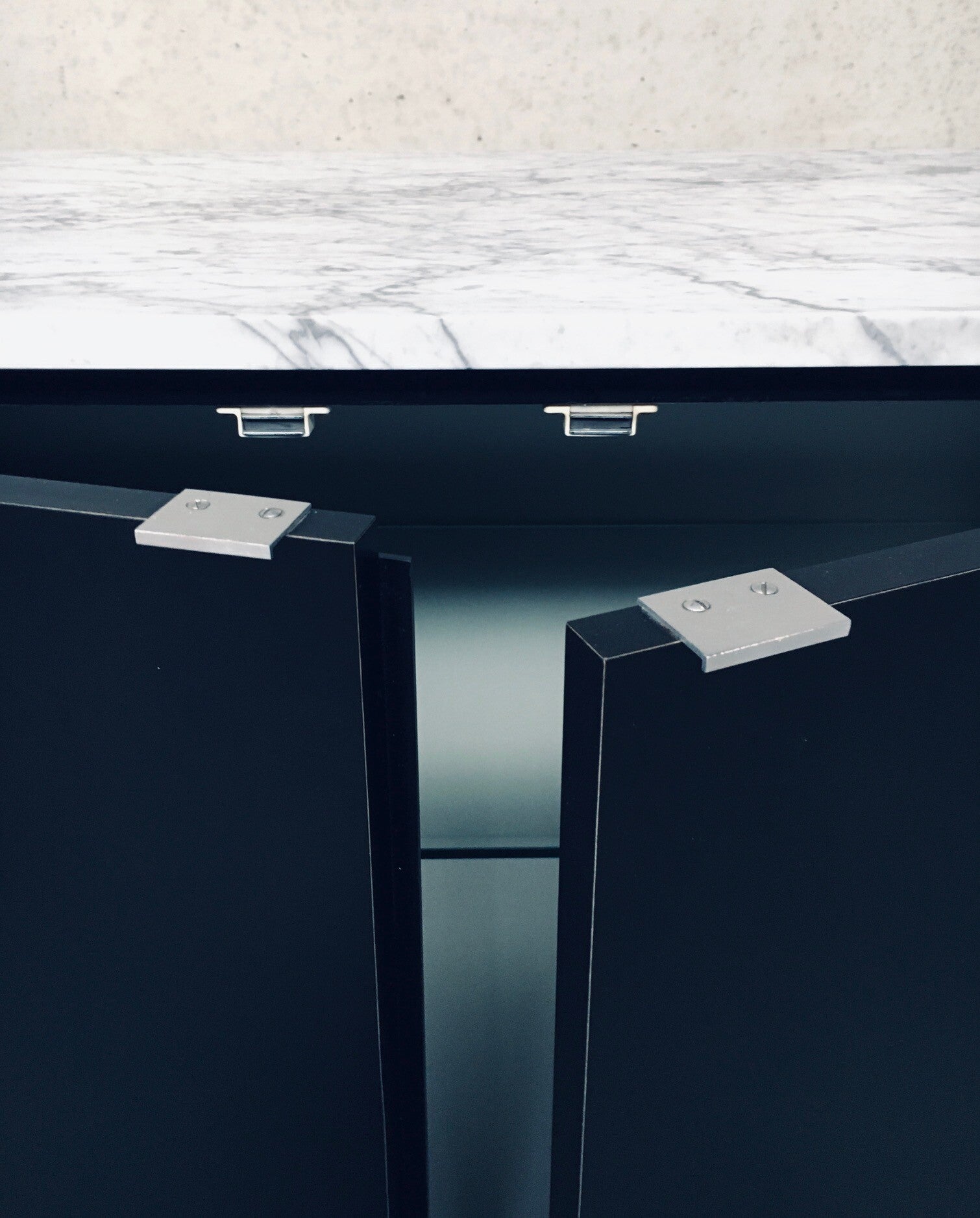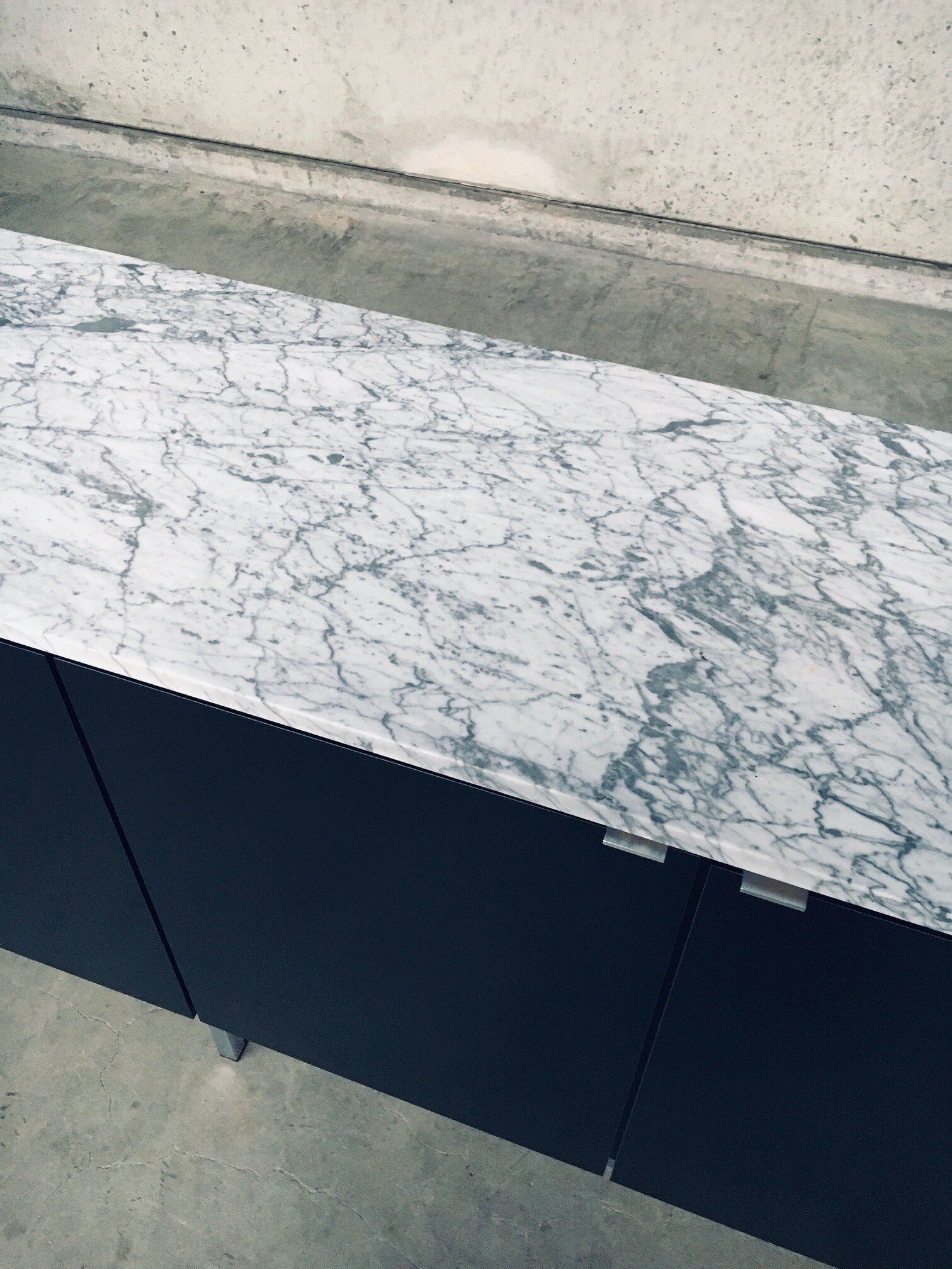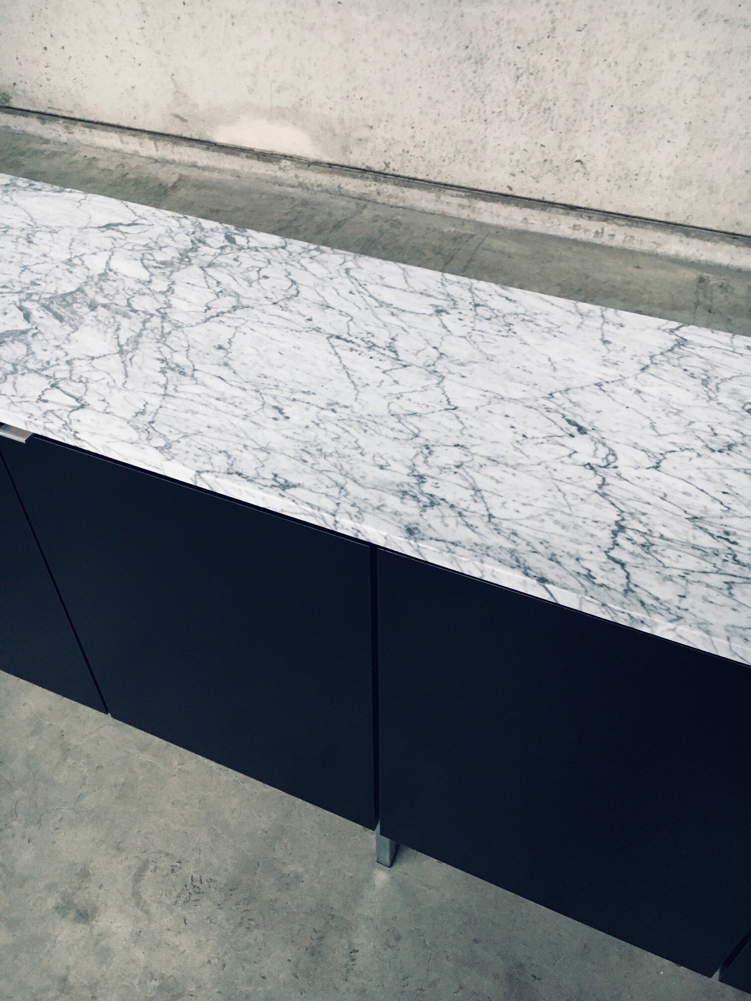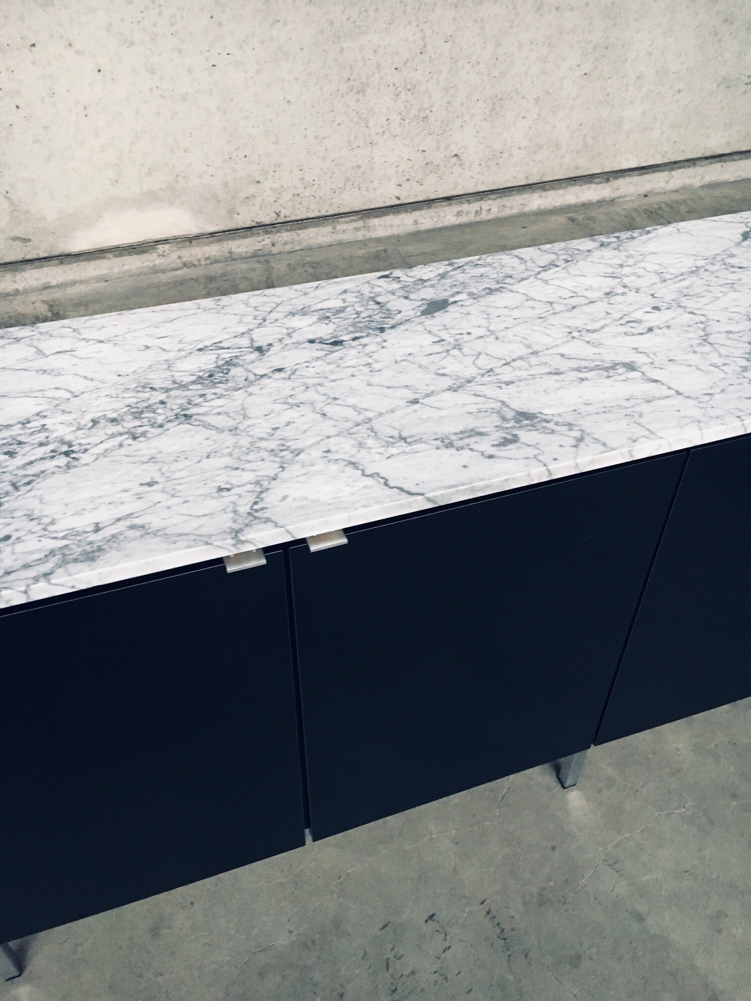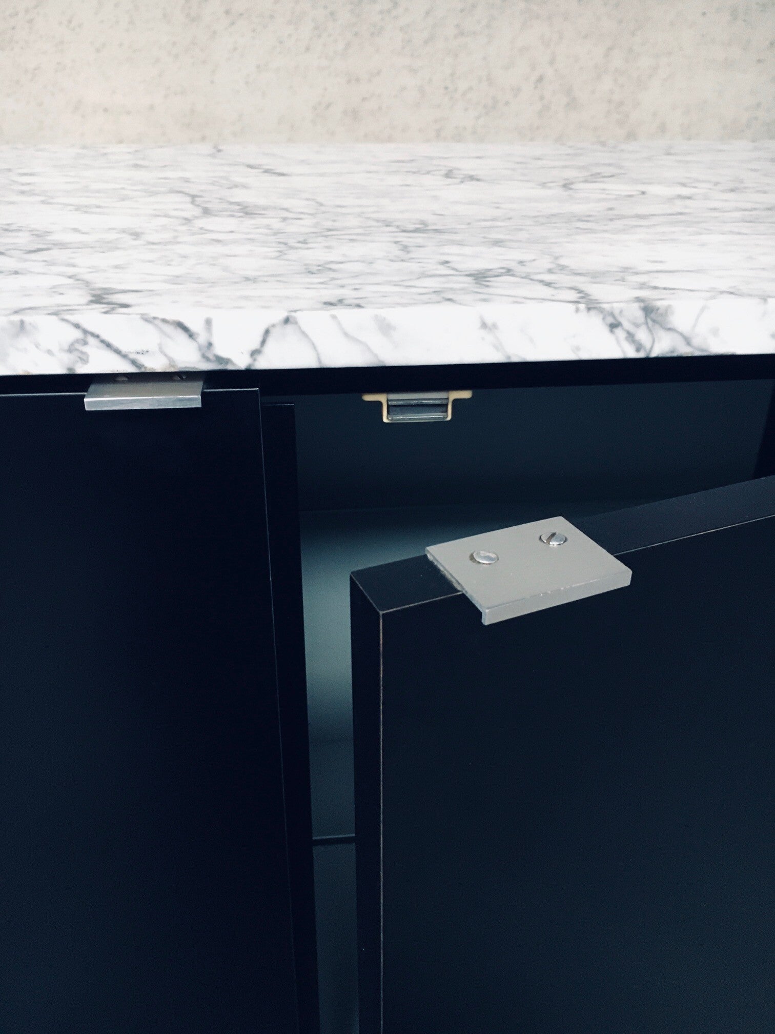 Vintage Midcentury Modern Design Credenza by Florence Knoll for Knoll International. Made in the 1970's period. A design classic from Knoll. Rare 6 door XL version in black with white solid carrara marble top. A Glass tray in the left and right parts. The middle part has no subdivisions. This cabinet comes in very good, original condition with minor wear marks for it's age and use. This measures 83,5cm high x 294cm wide x 48cm deep.