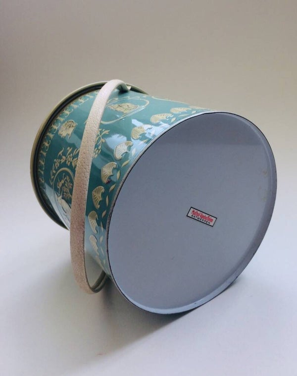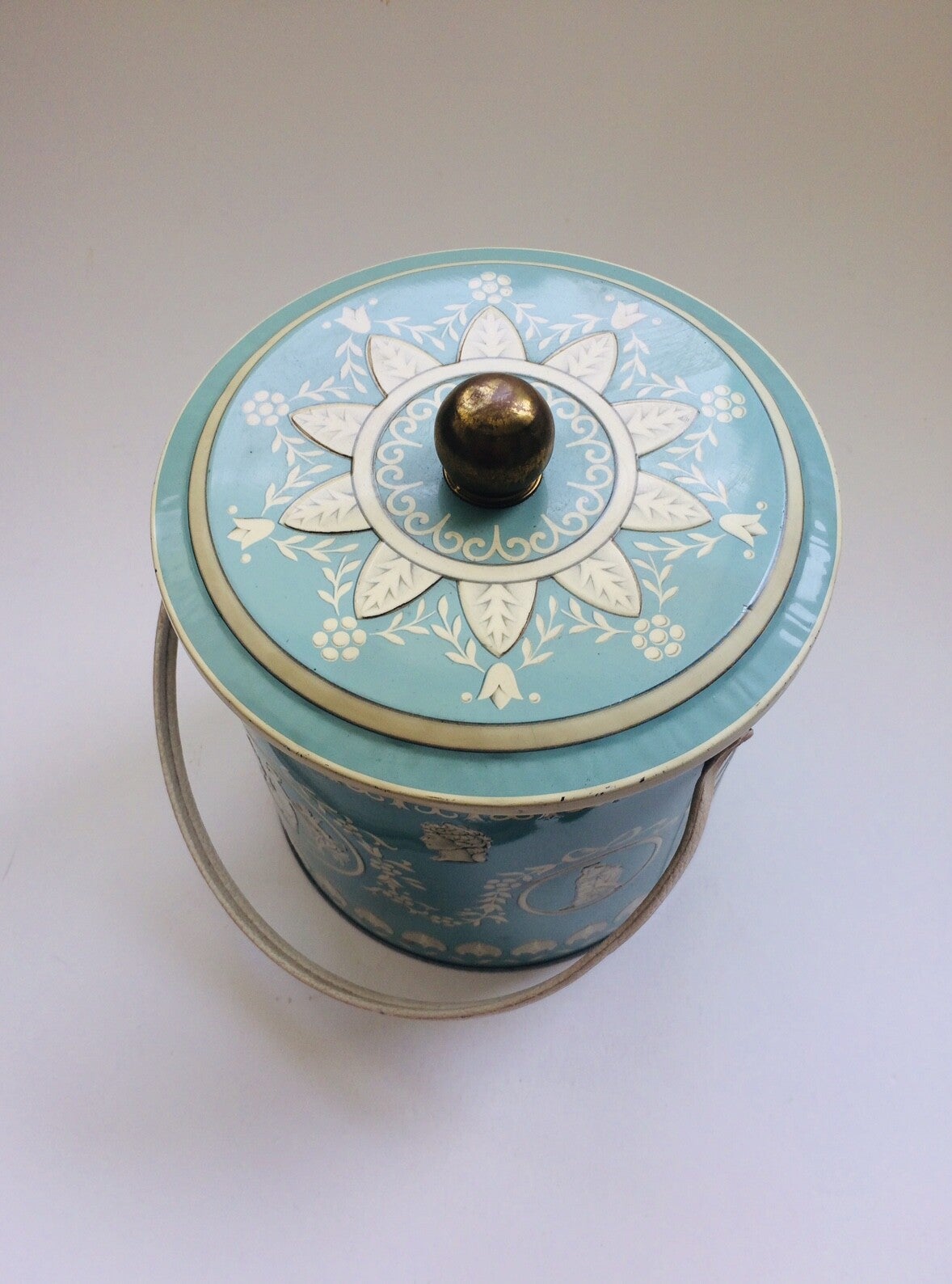 Vintage tin metal container with lid in Classical Roman Style by Mathot-Vanhoffelen, Belgium, 1960's. In very good condition. 18cm x 18cm x 19cm.