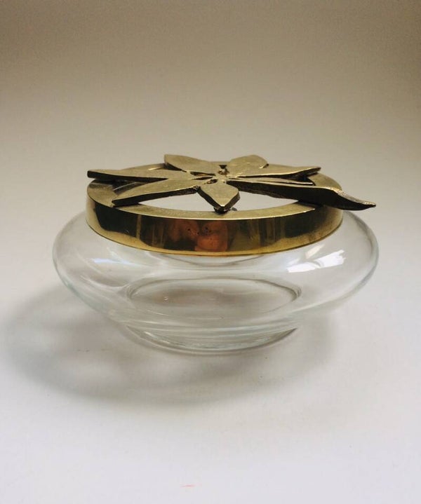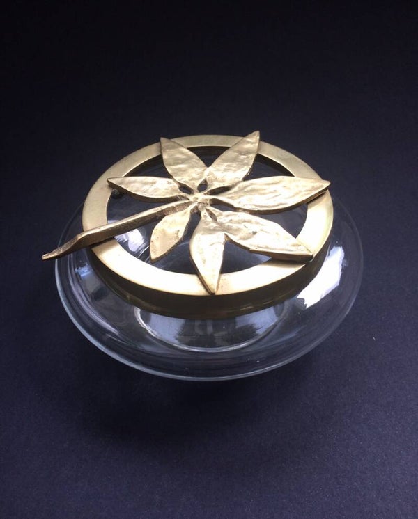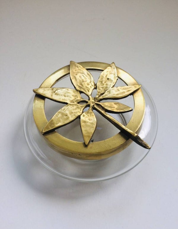 Vintage Hollywood Regency Style brass & glass Pot-Pourri bowl with heavy brass leaf shape top. Made in the 1970's. In very good condition. 16cm x 16cm x 7cm.