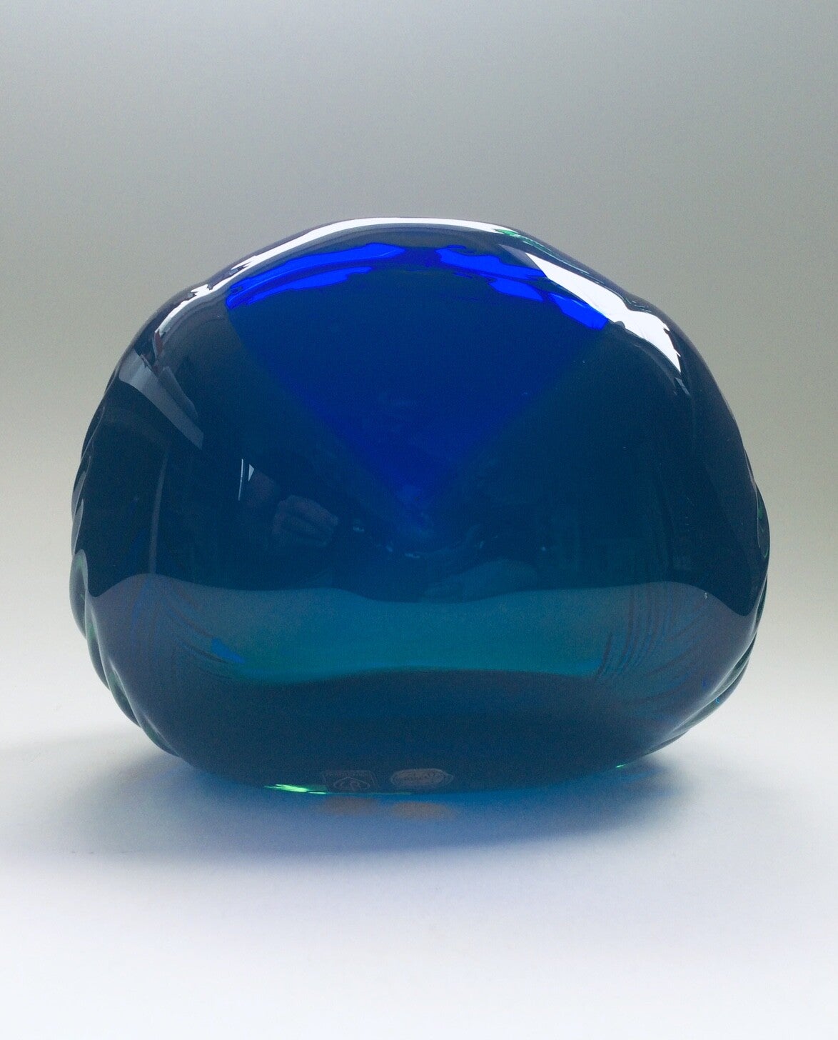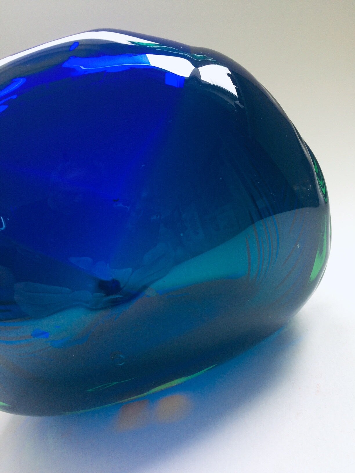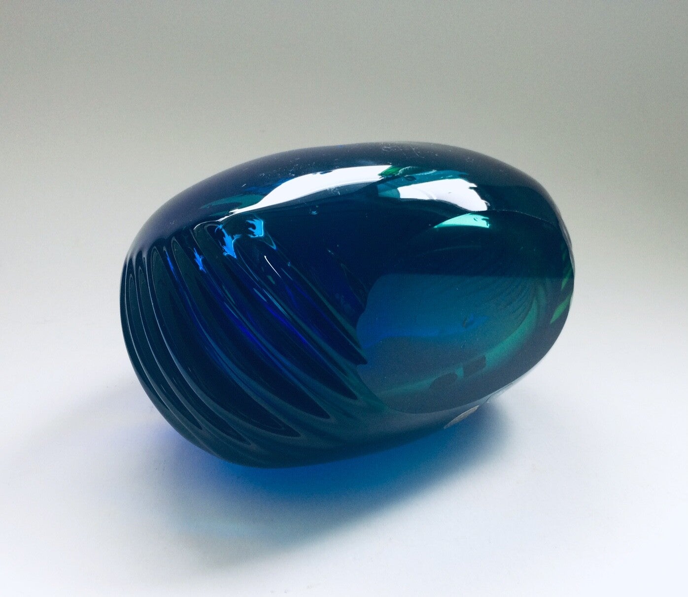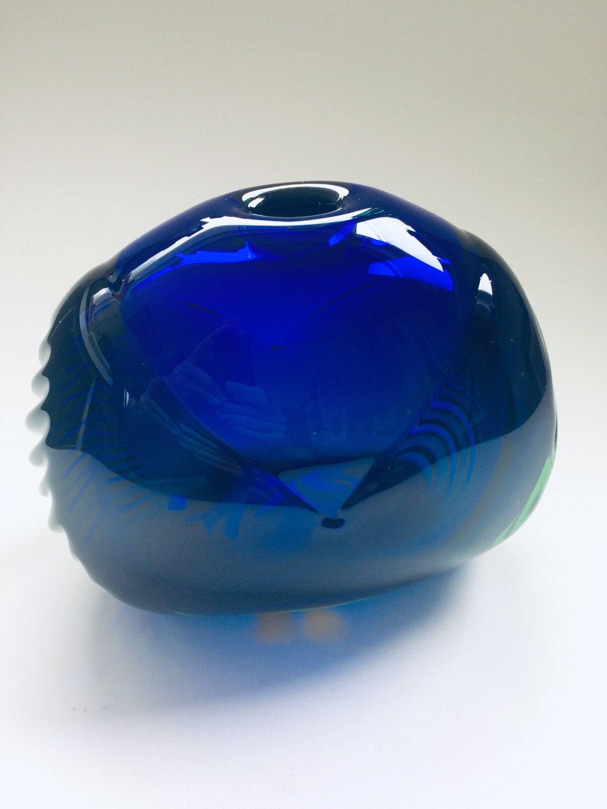 Vintage Midcentury Modern Bohemian Art Glass Vase by Skrdlovice - Beranek Ladislav Oliva. Bohemia Glass. Made in Czechoslovakia, 1960's. Heavy handblown glass vase in dark green & blue colors. With original labels. A true Art piece. In very good condition. 20cm x 17cm x 12cm.