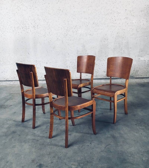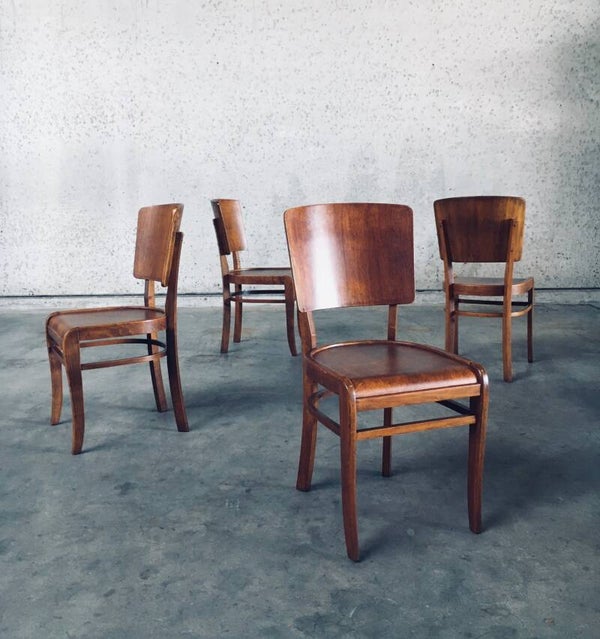 Vintage Art Deco Design Café / Pub model Chair set of 4. Made in Belgium, 1930's / 40's period. Beautifull designed and made chairs in a very lightweight birch wood. Bentwood and shaped frame with a very nice patina. These 4 chairs come in very good, all original condition with normal signs of wear from their age and use. Each chair measures 87cm high x 42cm wide x 45cm deep. Seat height measures 45cm.