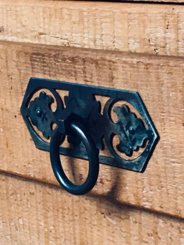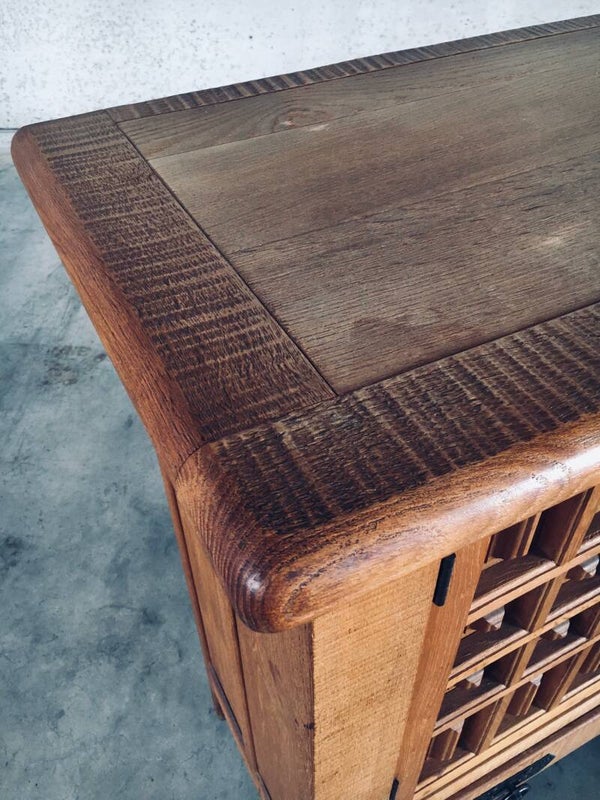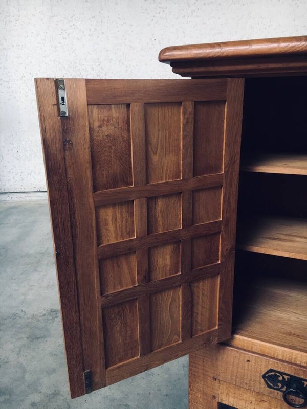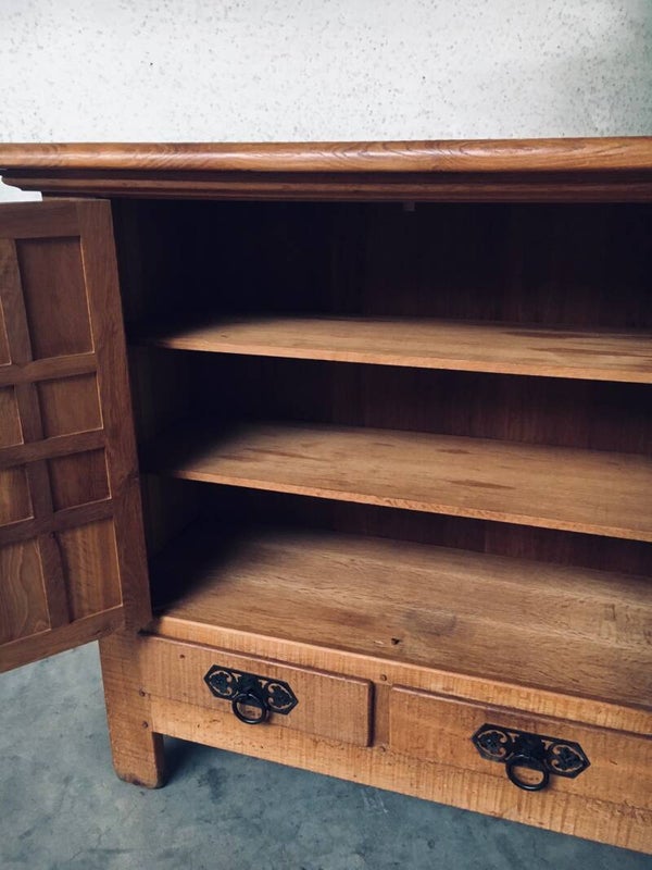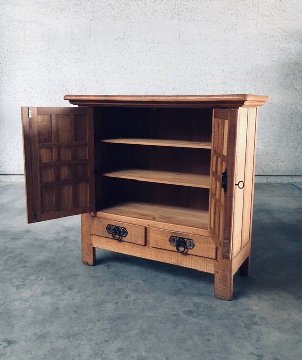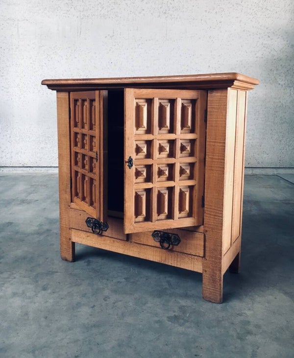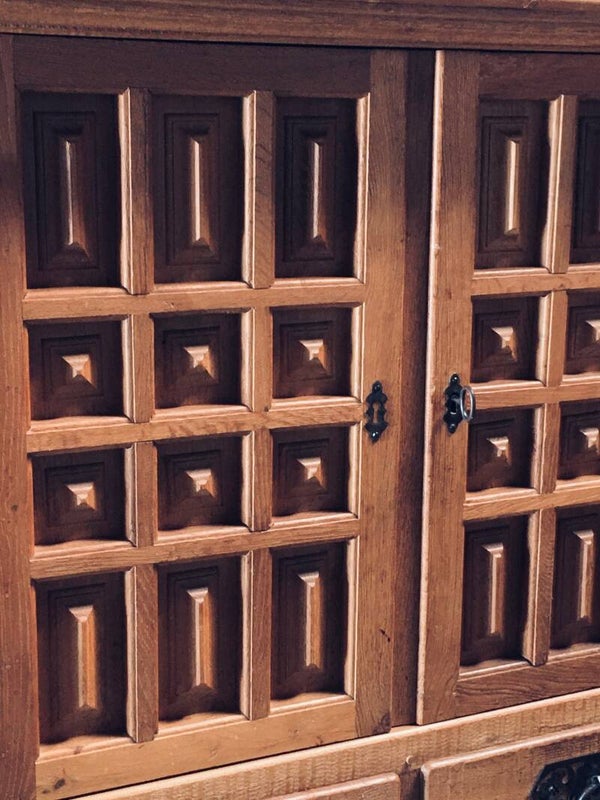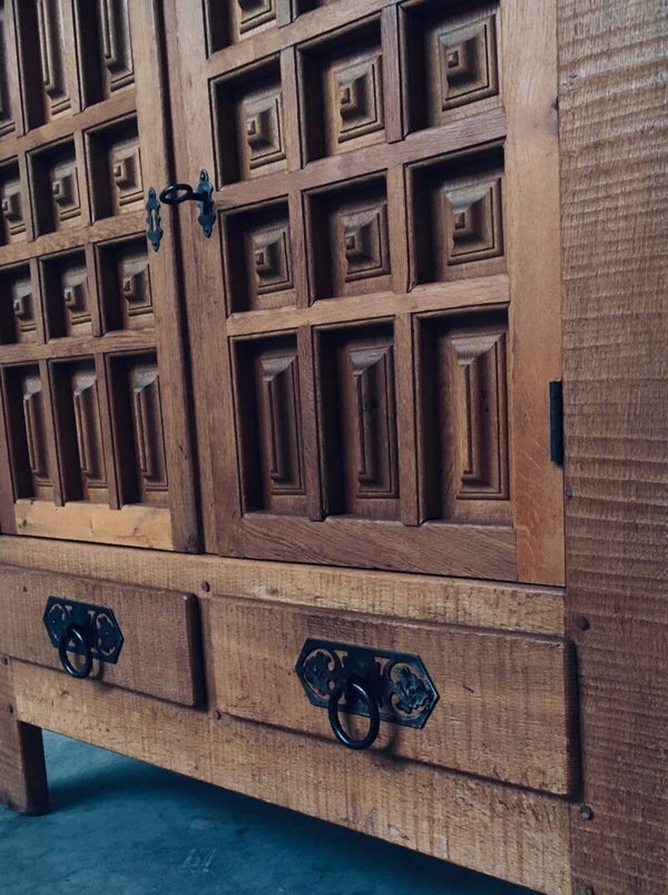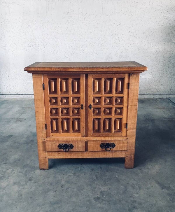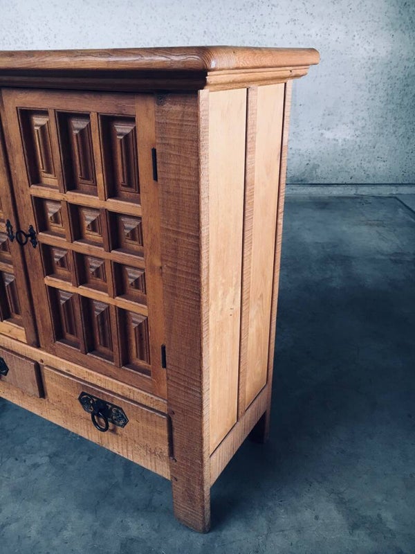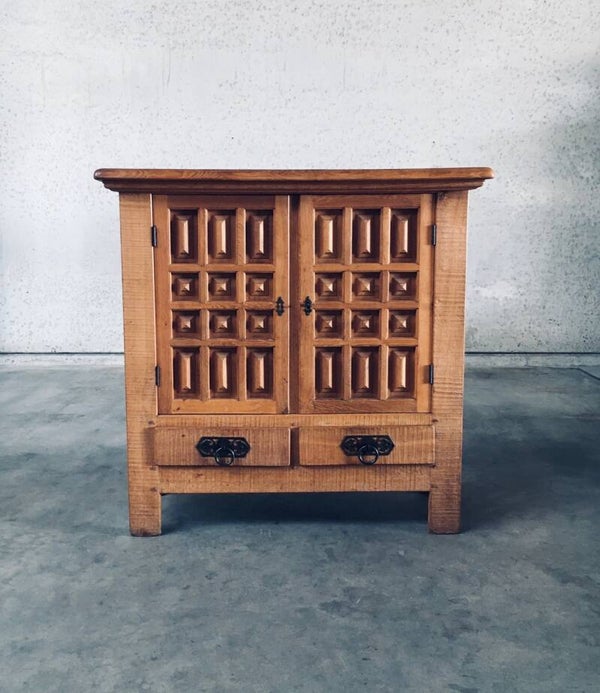 Vintage Spanish Brutalist Design Carved Oak high cabinet. Made in Belgium, 1960's period. Spanish in style, with typical carved geometric front doors. In solid oak, with original steel drawer pulls and keys. Two door front and 2 bottom drawers with 2 shelves on the inside. This comes in very good, all original condition. With minor wear from it's age and use. Measures 135,5cm high x 138cm wide x 57cm deep.