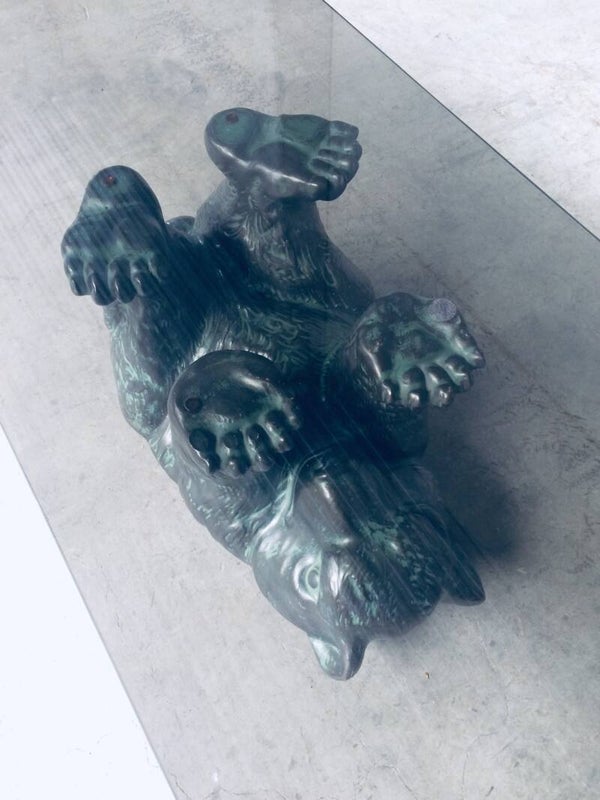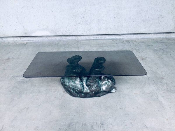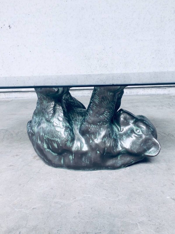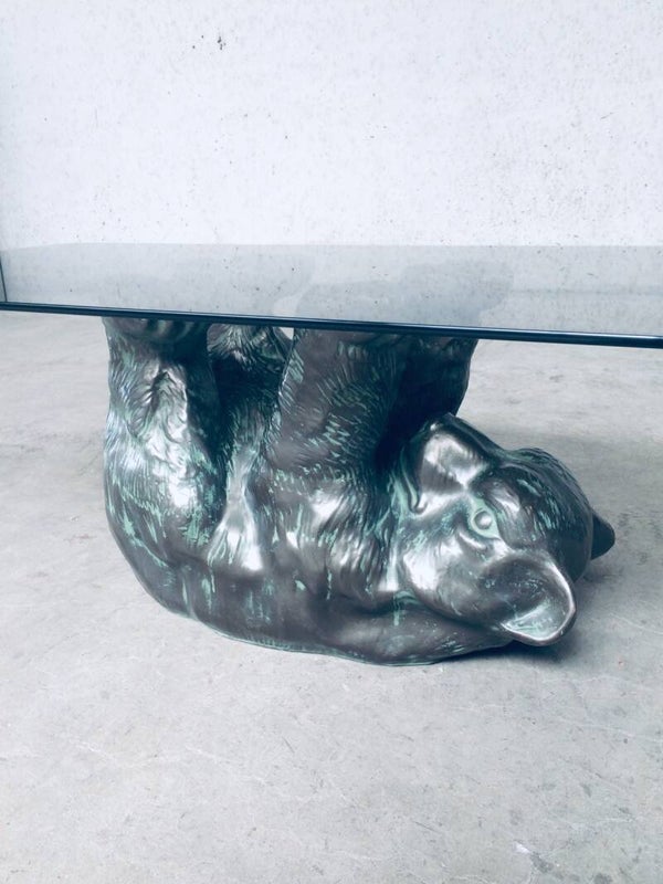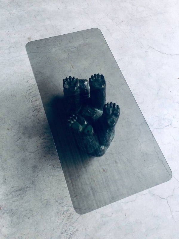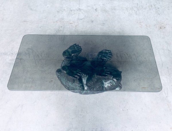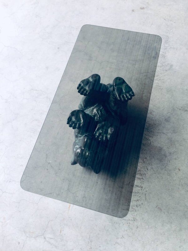 Vintage Midcentury Modern Unique Design Sculptural Black Bear Coffee Table. Made in the late 1970's - early 1980's. Molded Black Bear is finished in a Bronze finish. Smoke glass top with rounded corners. Comes in very good condition. 120cm x 57,5cm x 41,5cm.