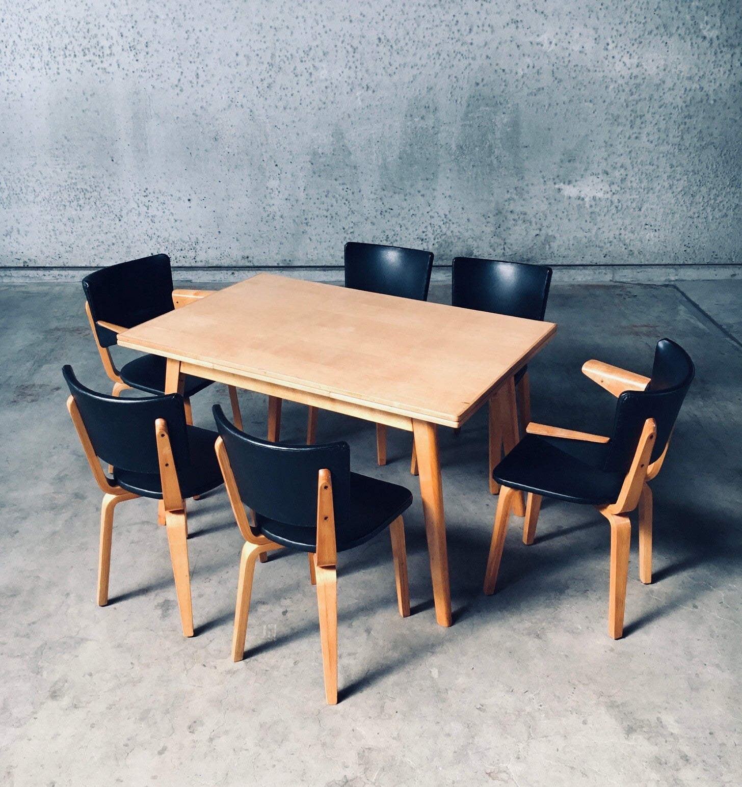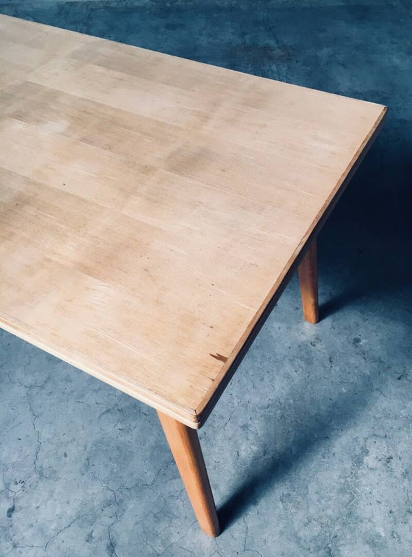 Vintage Midcentury Modern Dutch Design Extendable Dining or Kitchen Table by Cor (Cornelius Louis) Alons for C. De Boer / Gouda Den Boer. Designed in 1949. Made in the Netherlands, 1950's period. Plywood / Multiplex constructed birch wood table that has 2 extensions. The 2 extensions have their original darker yellow varnish color, the rest of the table has faded to a very nice pale yellow wood color. The table is all original, with normal wear and marks from it's use and age. The table measures 76cm high x 125cm wide x 83cm deep. With extensions, this measures 207cm wide.
