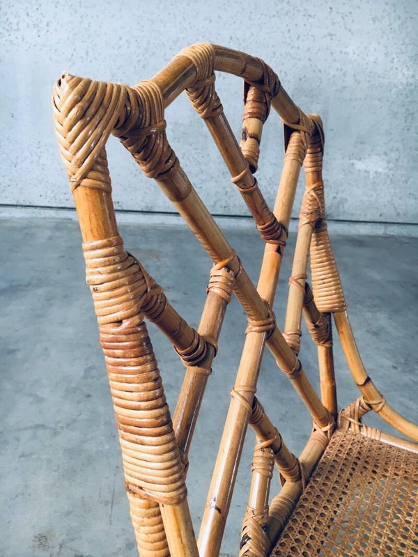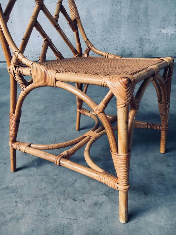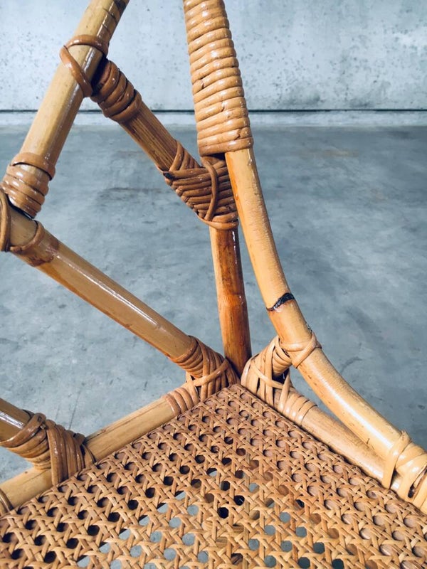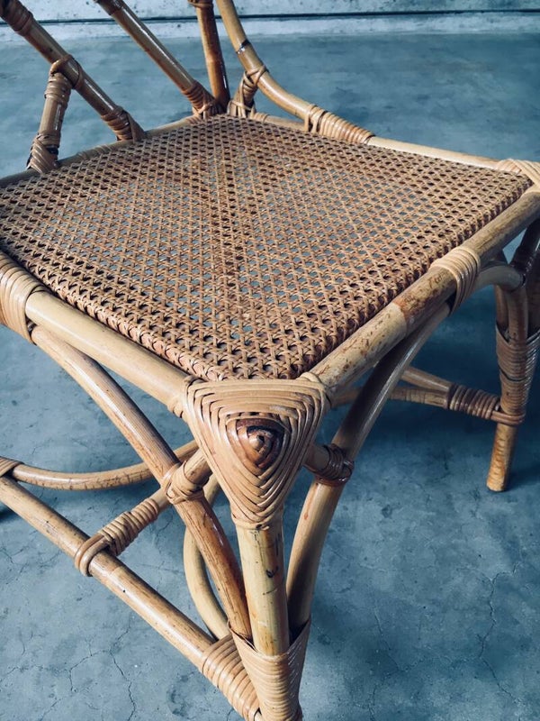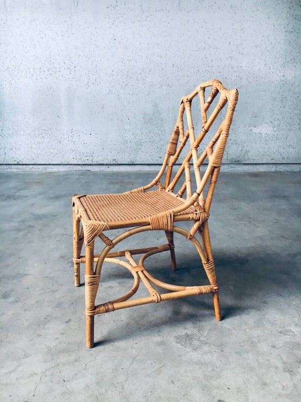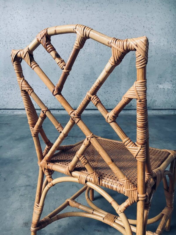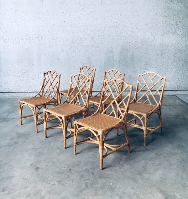 Vintage Midcentury Design Bamboo Rattan Wicker Chairs with Cane Seating in Chippendale Style. Made in Italy, 1960's. Set of 6 chairs made in bamboo with webbing cane seats. All chairs are in very good, all original condition, with normal signs of their use and age. Each chair measures 94cm high x 51cm wide x 57cm deep. Seat height measures 46cm.