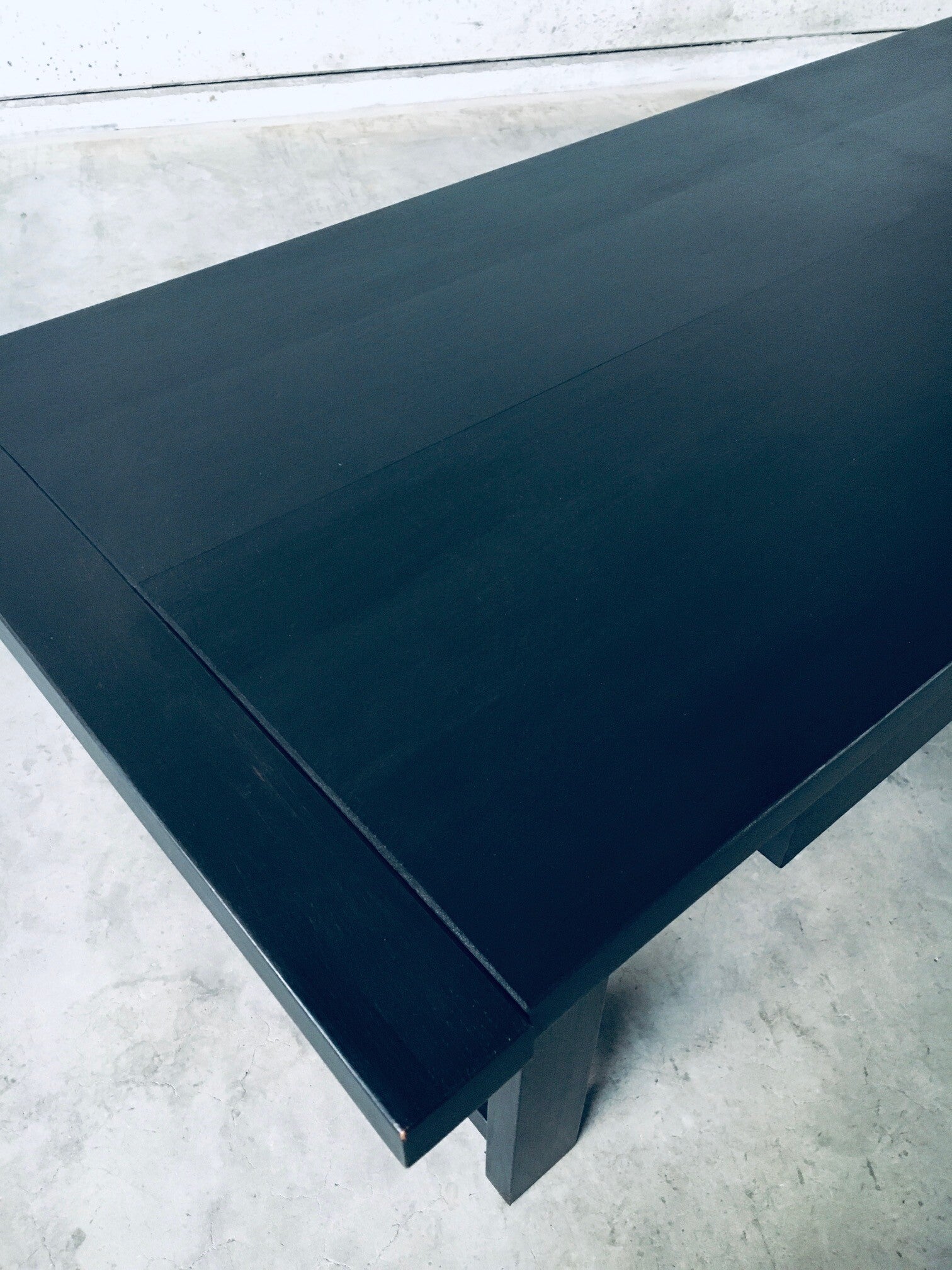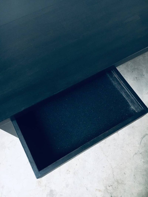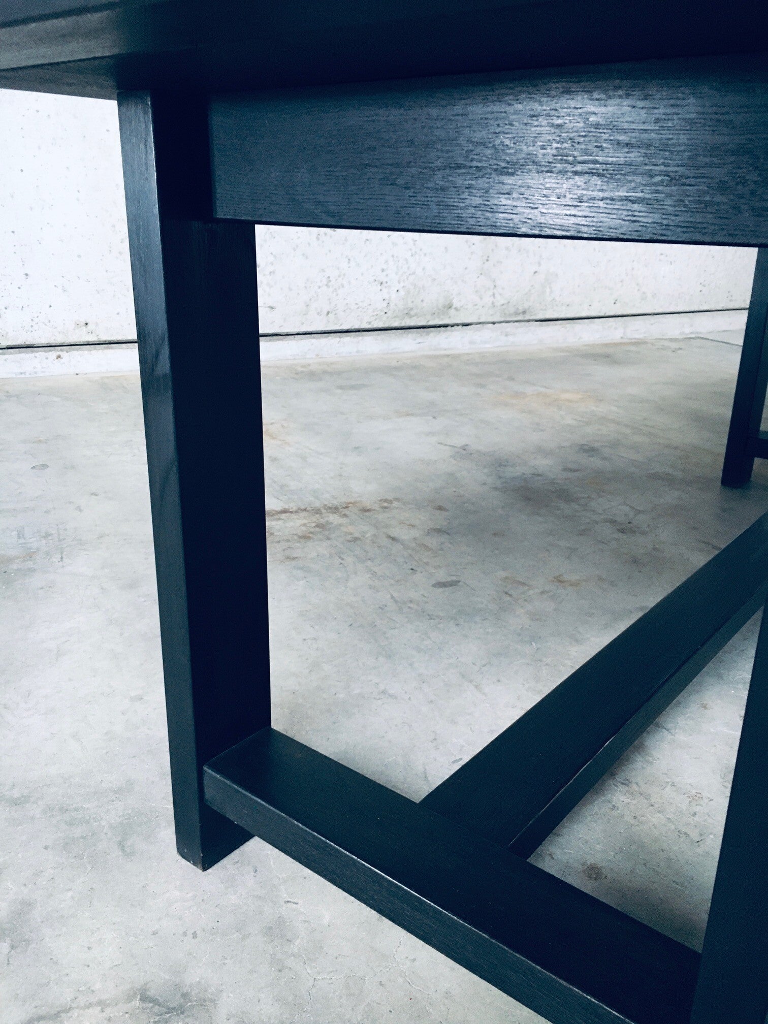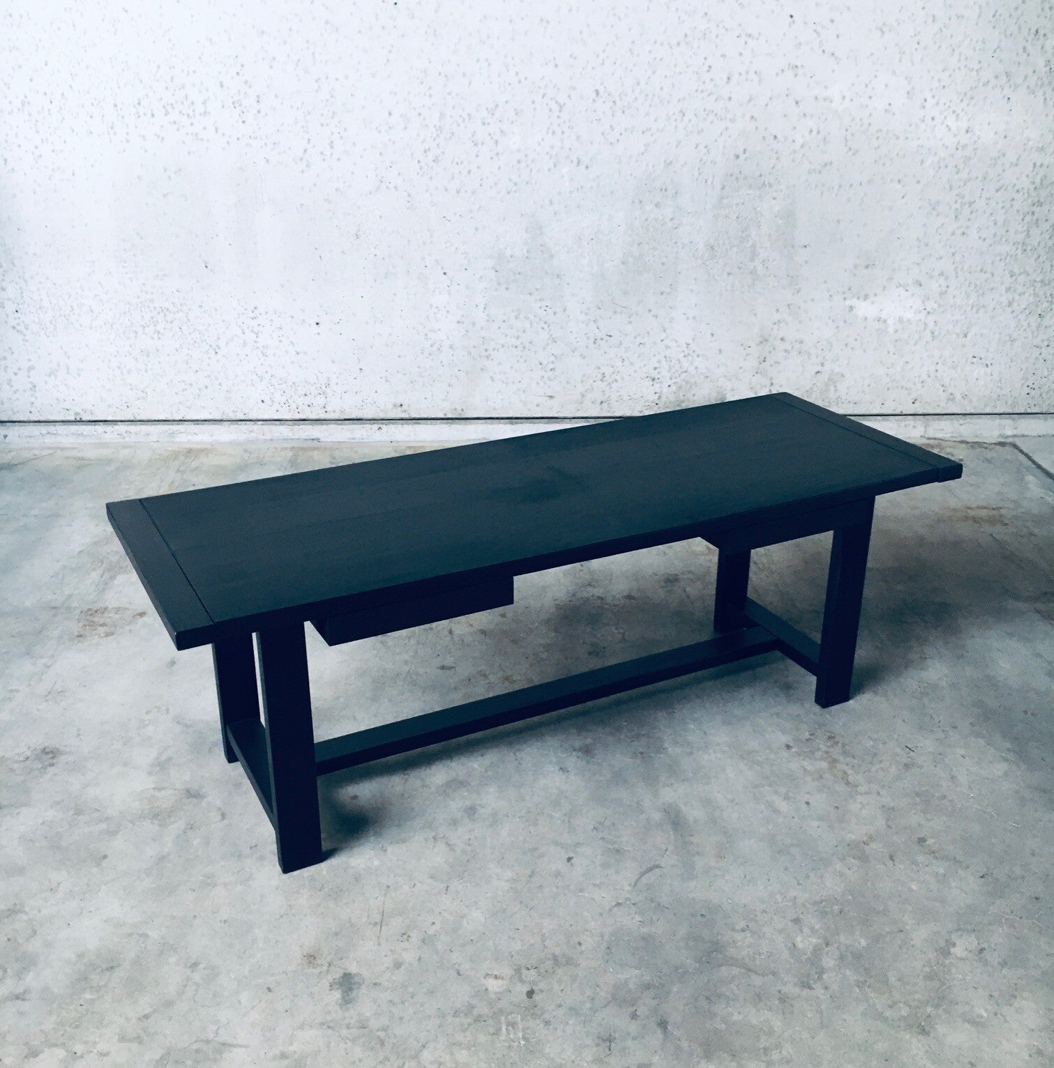 Vintage Midcentury Modern Belgian Design Dining Table / Desk designed by Jean Batenburg for MI. Made in Belgium, 1969. Mi is little known, but their furniture shows craftsmanship and quality. Black stained solid wood constructed frame with 4 drawers. This can be used for different purposes. It's original a dining table that easily seats 6 to 8 people. Or can be used as a desk due to it's slender measurements and drawers. The drawers are very nicely finished with black velvet liner. The table is in good original condition with normal wear signs of it's use and age. It has nicely aged with good patina. This measures 75cm x 210cm x 79,5cm.