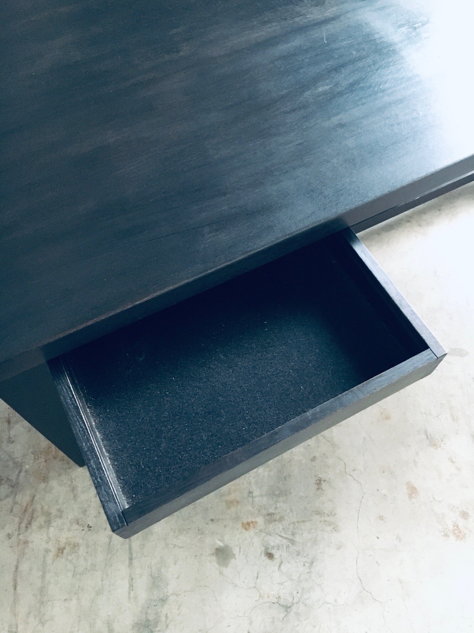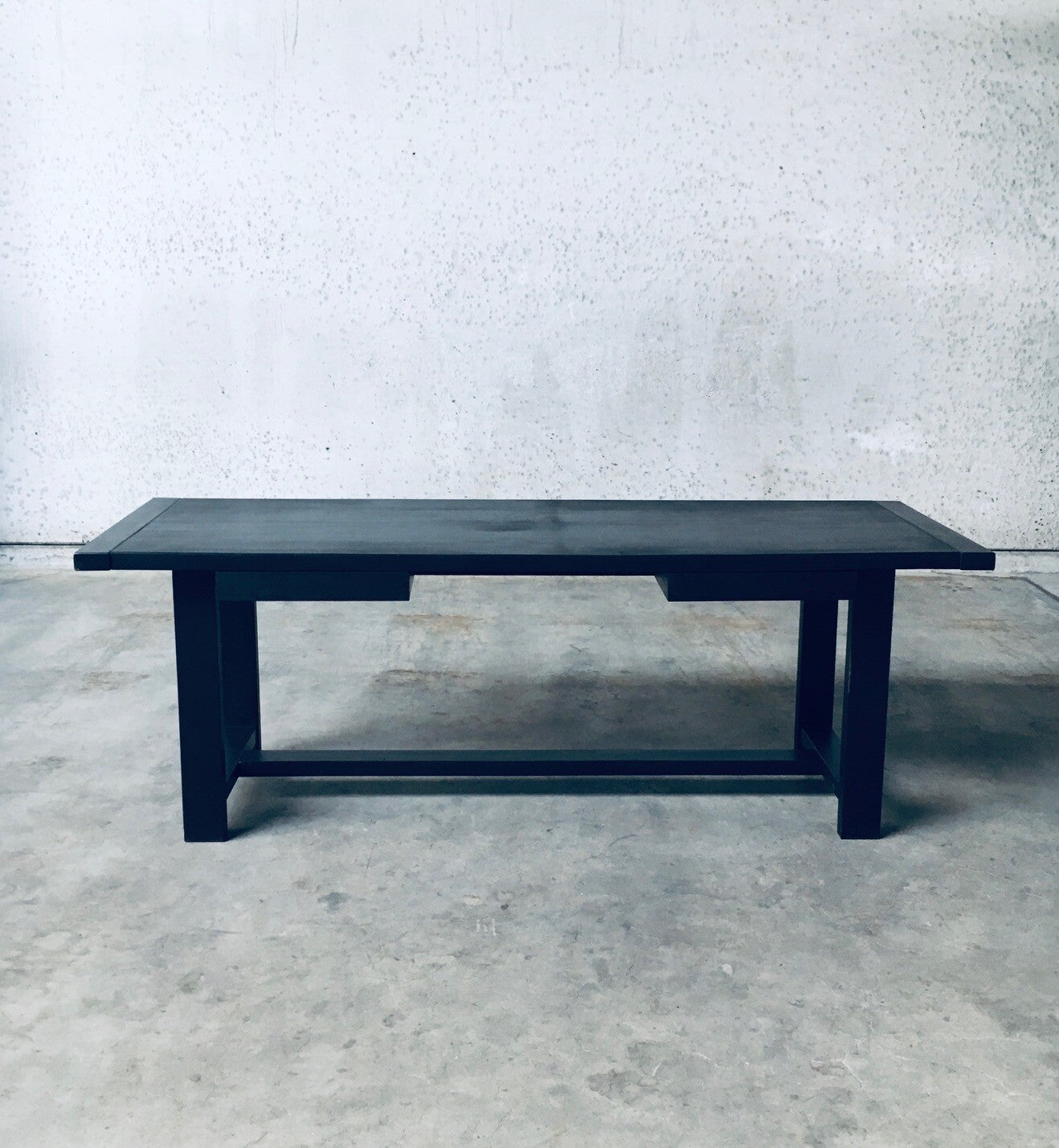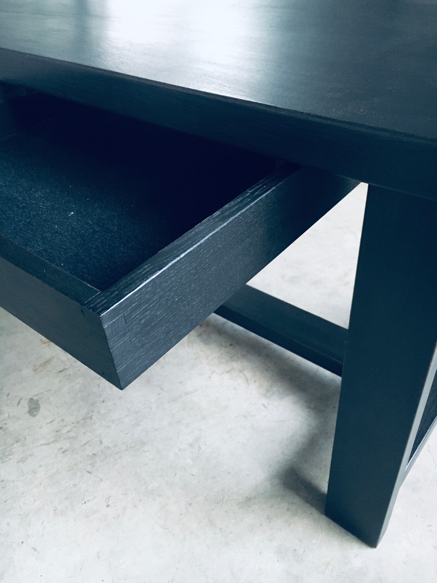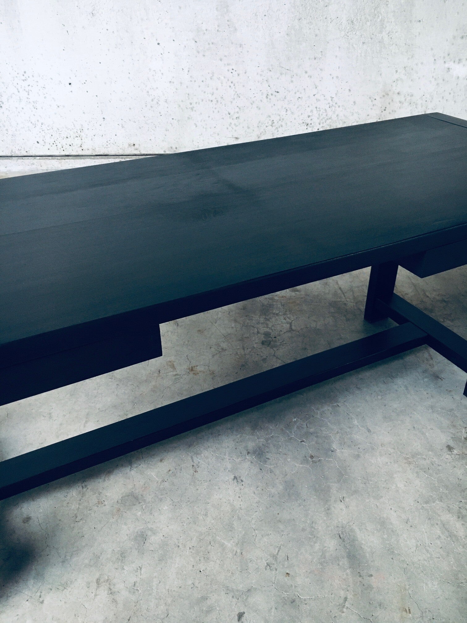 Vintage Midcentury Modern Belgian Design Dining Table / Desk designed by Jean Batenburg for MI. Made in Belgium, 1969. Mi is little known, but their furniture shows craftsmanship and quality. Black stained solid wood constructed frame with 4 drawers. This can be used for different purposes. It's original a dining table that easily seats 6 to 8 people. Or can be used as a desk due to it's slender measurements and drawers. The drawers are very nicely finished with black velvet liner. The table is in good original condition with normal wear signs of it's use and age. It has nicely aged with good patina. This measures 75cm x 210cm x 79,5cm.