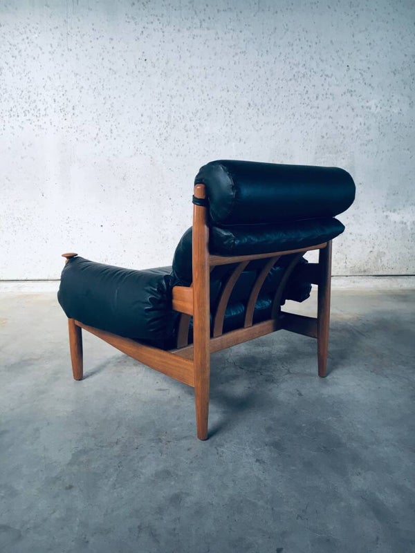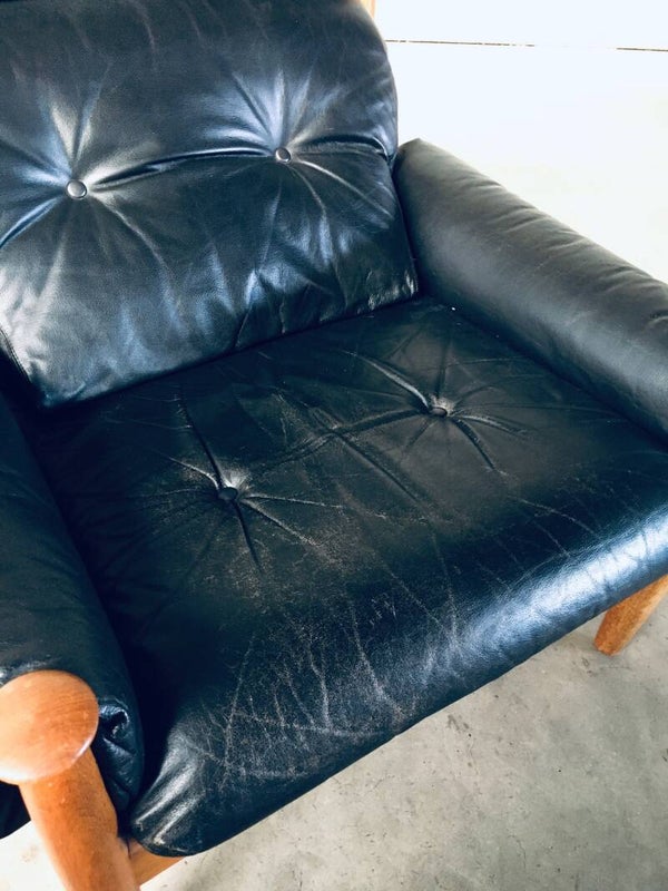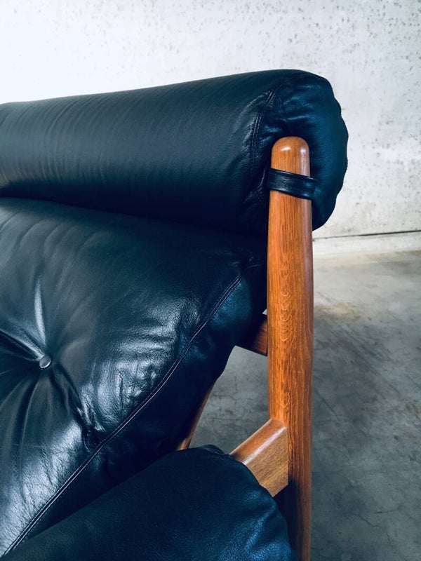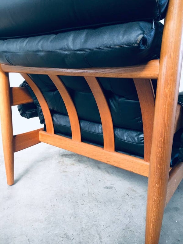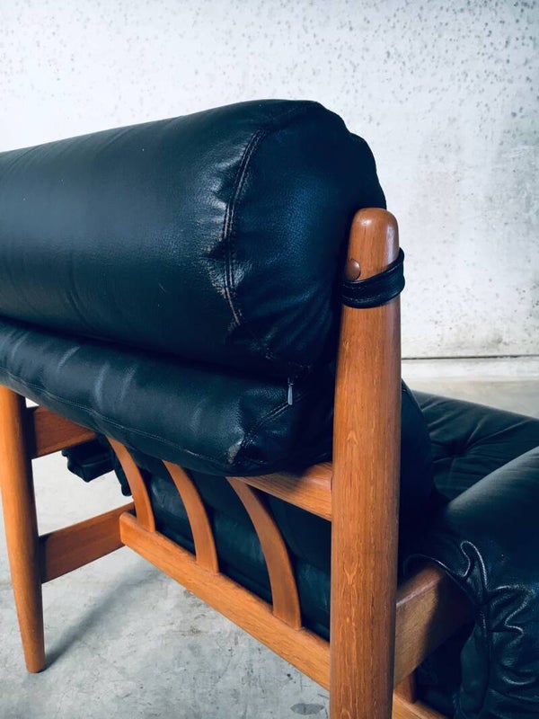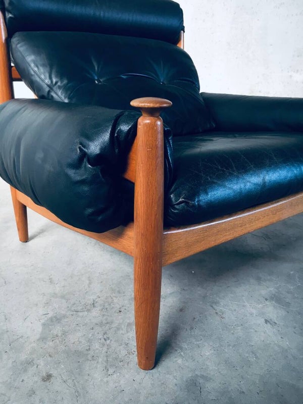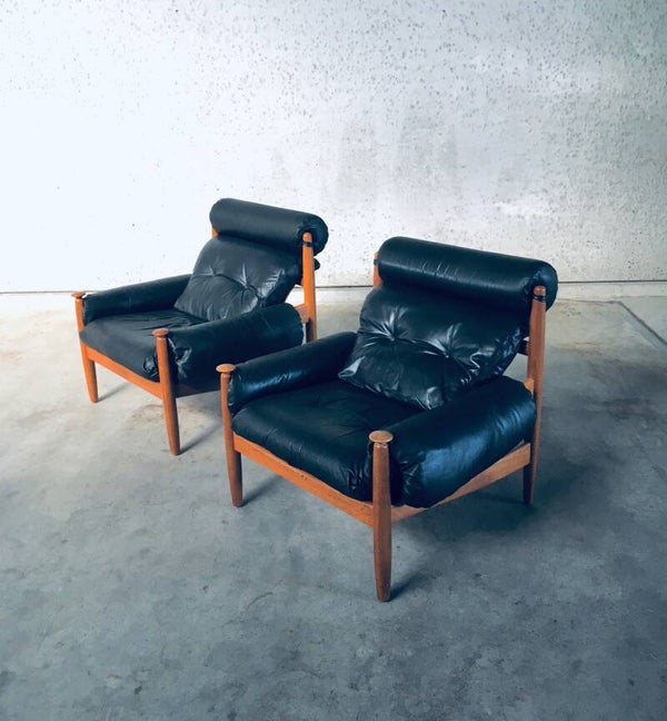 Vintage Midcentury Modern Scandinavian Design Lounge Chair set by Eric Merthen for Ire Möbler. Made in Sweden, 1960's period. Teak wood frame with black leather cushions. These come in very good, all original condition. Very well made, large and very comfortable designed armchairs. Each fauteuil measures 90cm high x 98cm wide x 93cm deep. Seat height measures 44cm.