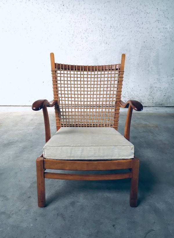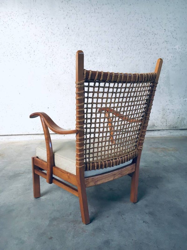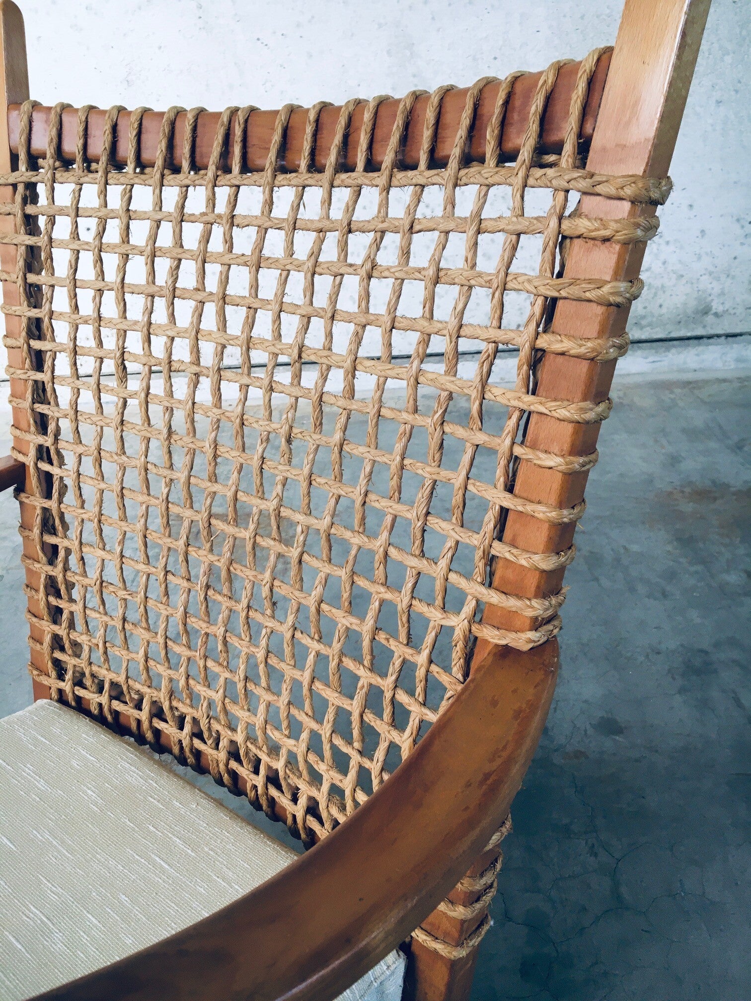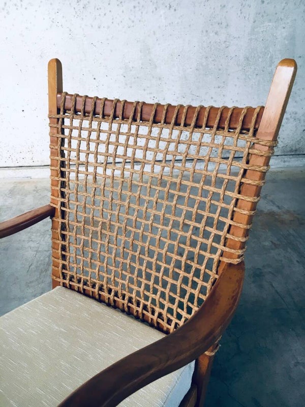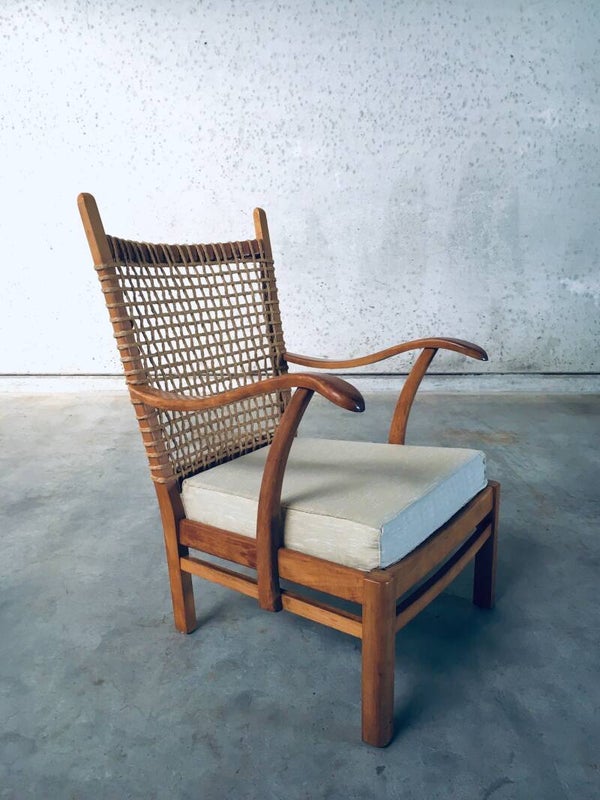 Vintage Modernist Dutch Design Easy Chair by Bas Van Pelt. Made in the Netherlands, 1930's period. Light beech or birch wood constructed frame with rope woven back and original beige fabric cushion. This comes in very good, all original condition with normal wear signs for it's use and age. Measures 96,5cm high x 67cm wide x 70cm deep. Seat height 41cm.
