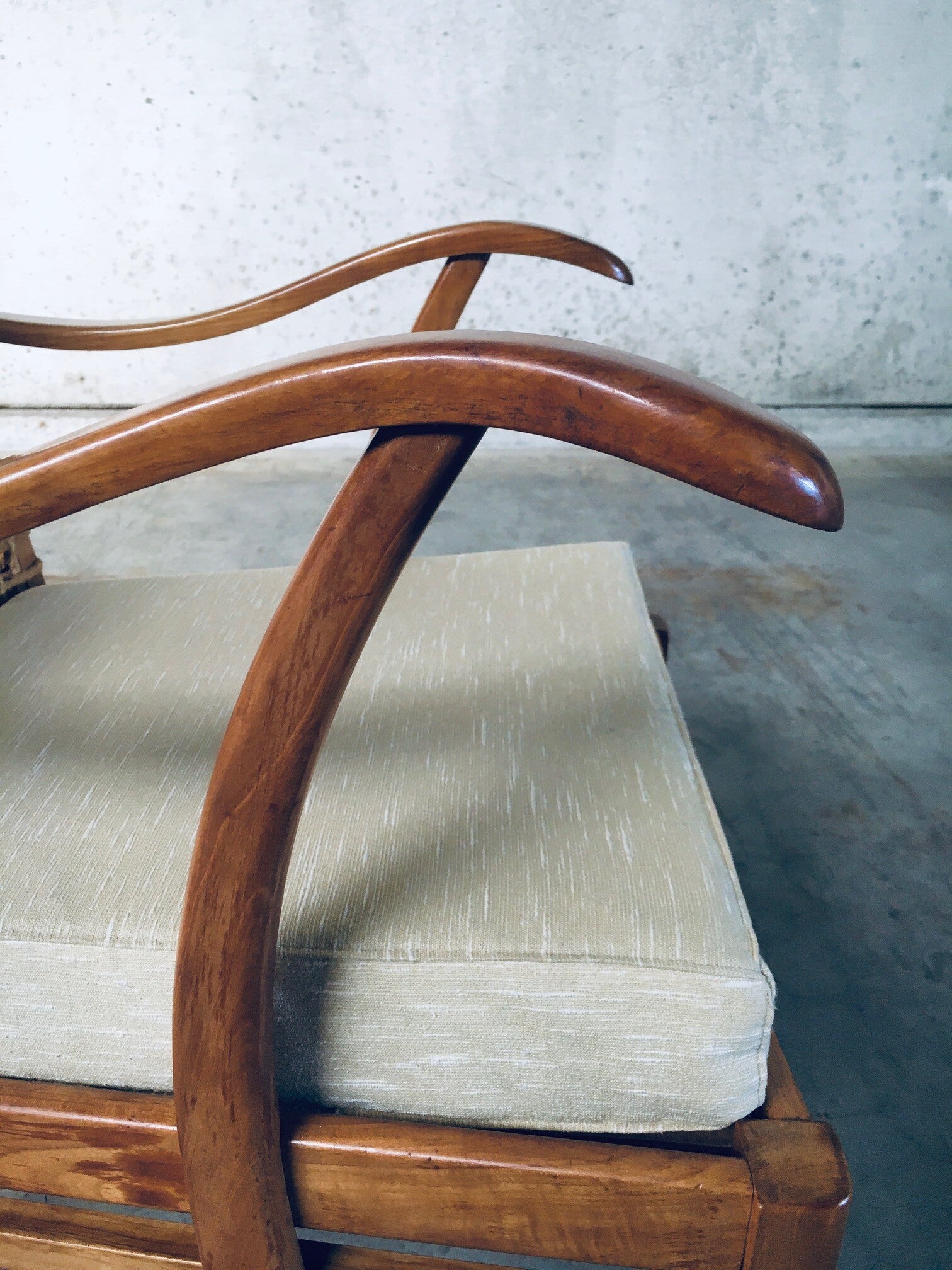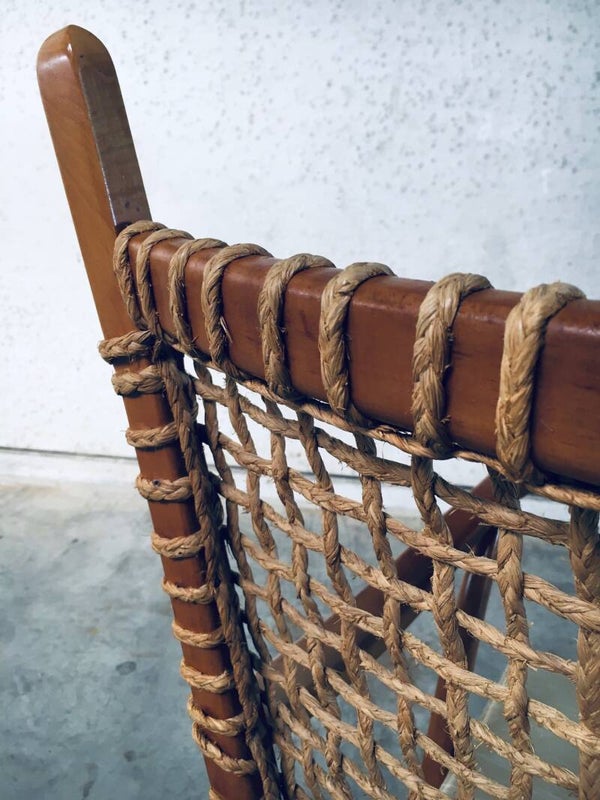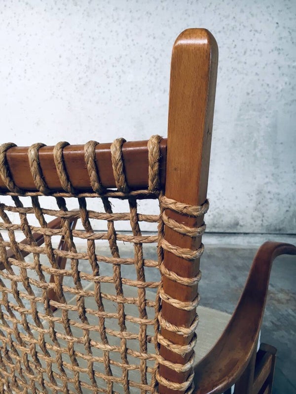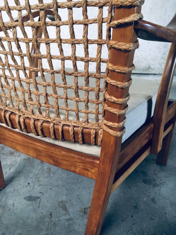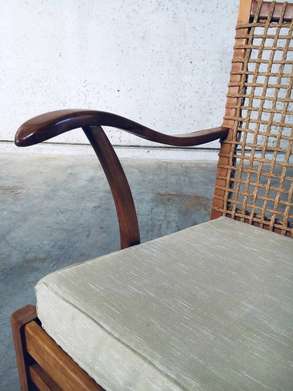 Vintage Modernist Dutch Design Easy Chair by Bas Van Pelt. Made in the Netherlands, 1930's period. Light beech or birch wood constructed frame with rope woven back and original beige fabric cushion. This comes in very good, all original condition with normal wear signs for it's use and age. Measures 96,5cm high x 67cm wide x 70cm deep. Seat height 41cm.
