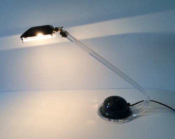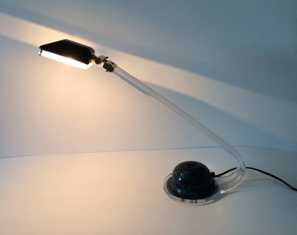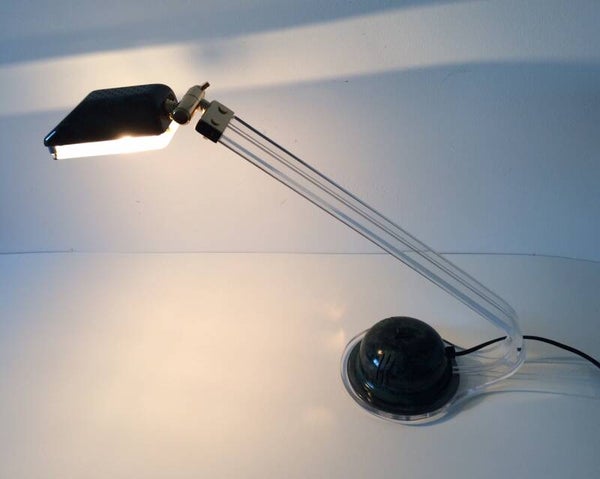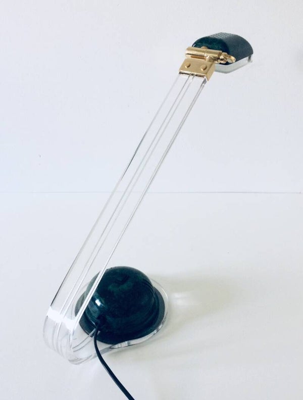 Vintage 1980's Memphis Style Design Desk lamp in clear lucite and green & black swirl plastic with brass hinge. Adjustable lamp. Small piece broken at lamp cover plate, see picture. Otherwise in very good working condition. Measures: 50cm x 16cm x 38cm.