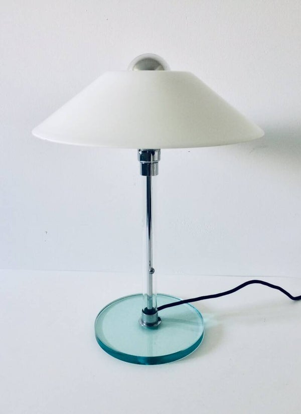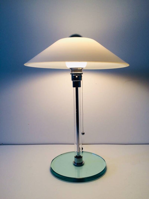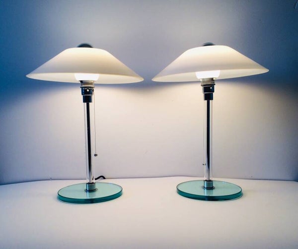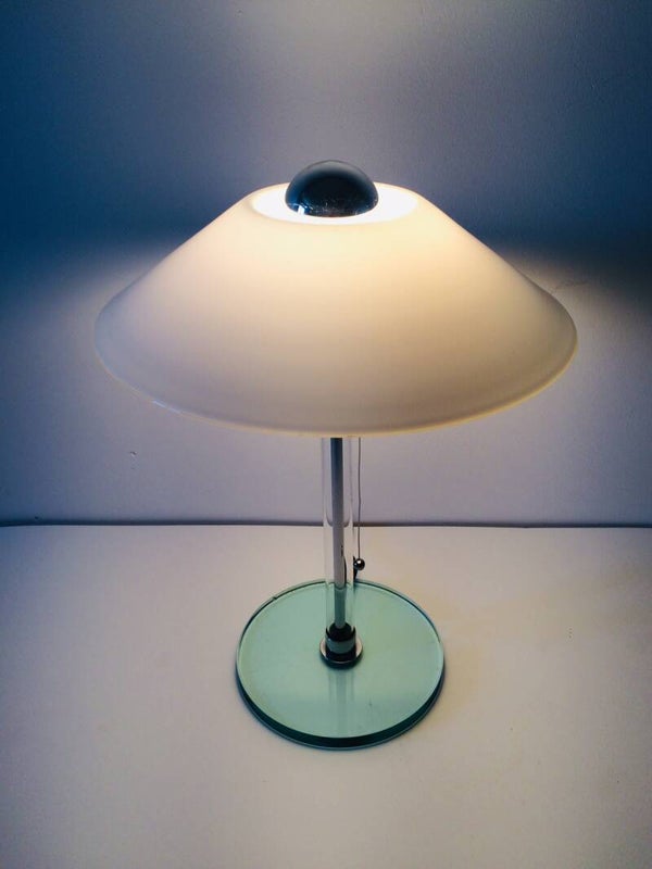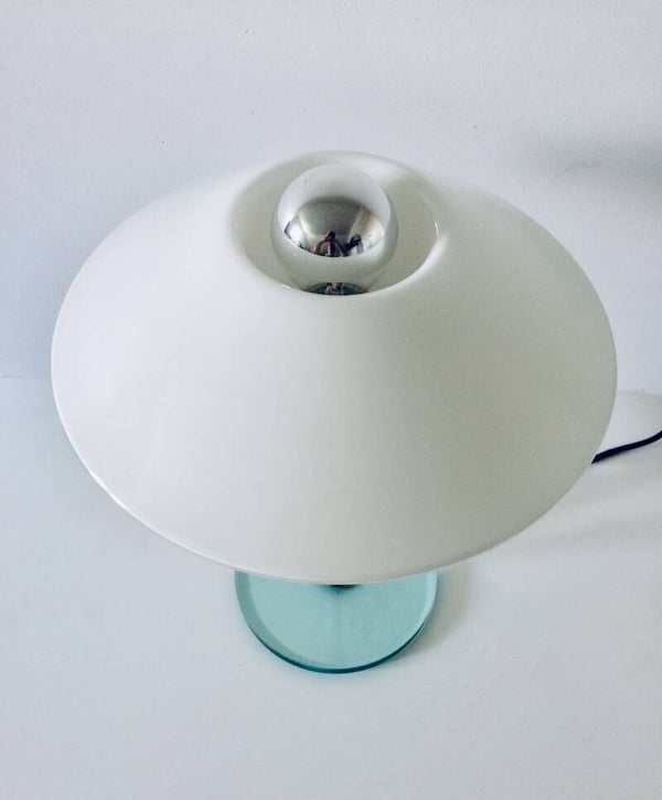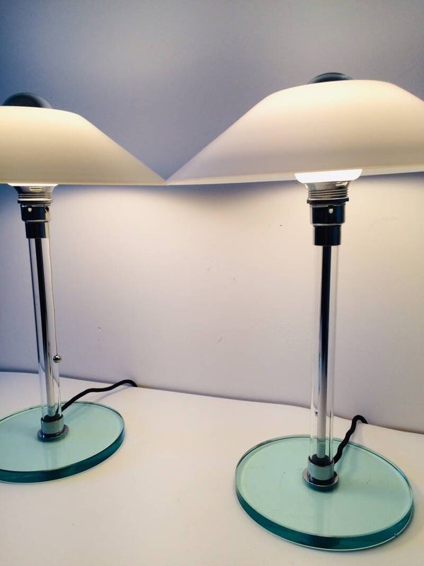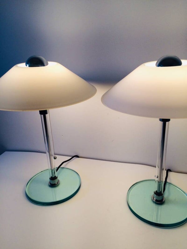 Vintage Post Modern Design set of 2 table lamp lamps in glass with metal fittings. Made in Italy, 1980's. Superb high quality design lamps. Rare model. In very good condition, minor chipping on thick glass bottom base. 46cm x 35cm x 35cm.