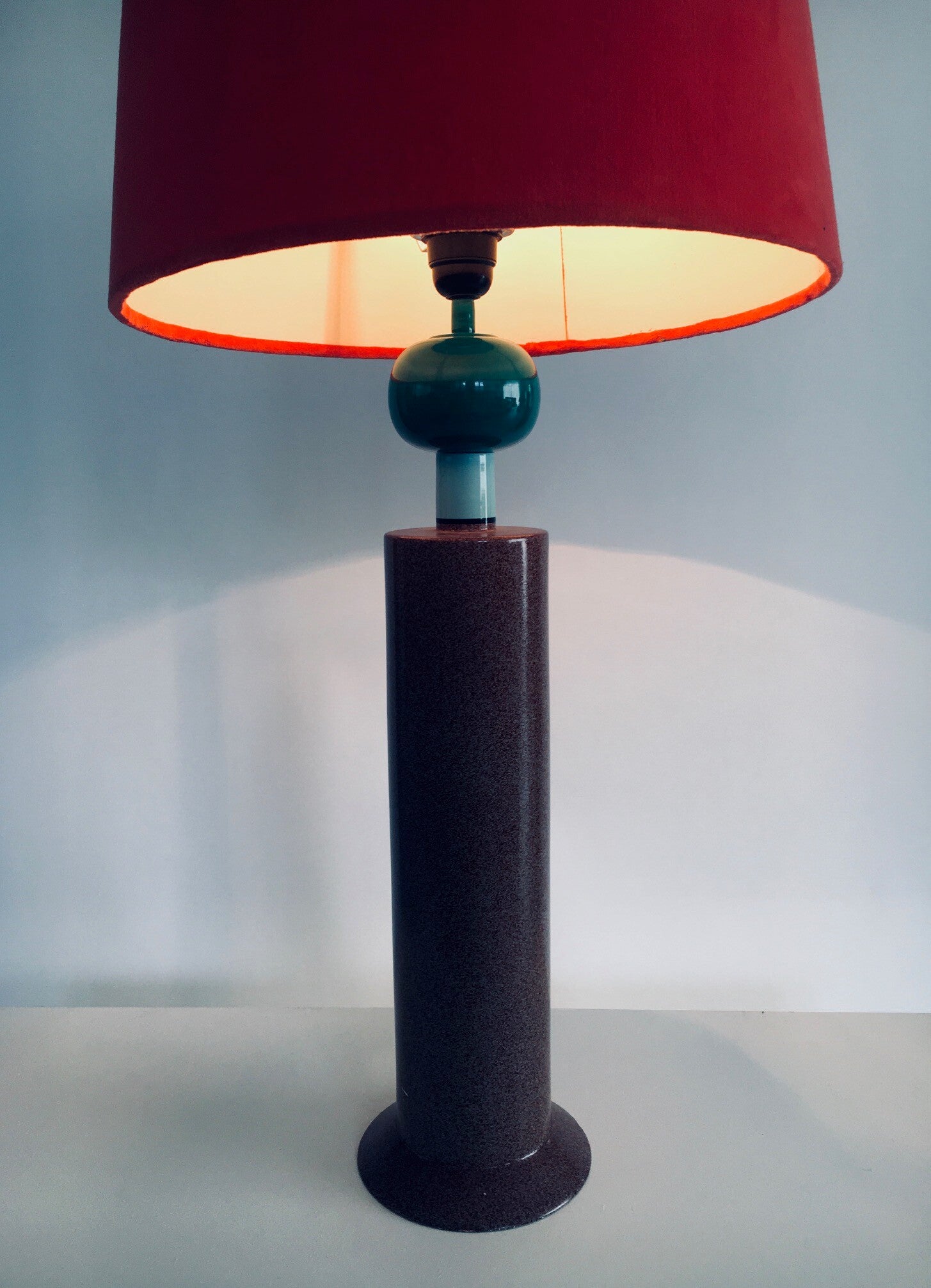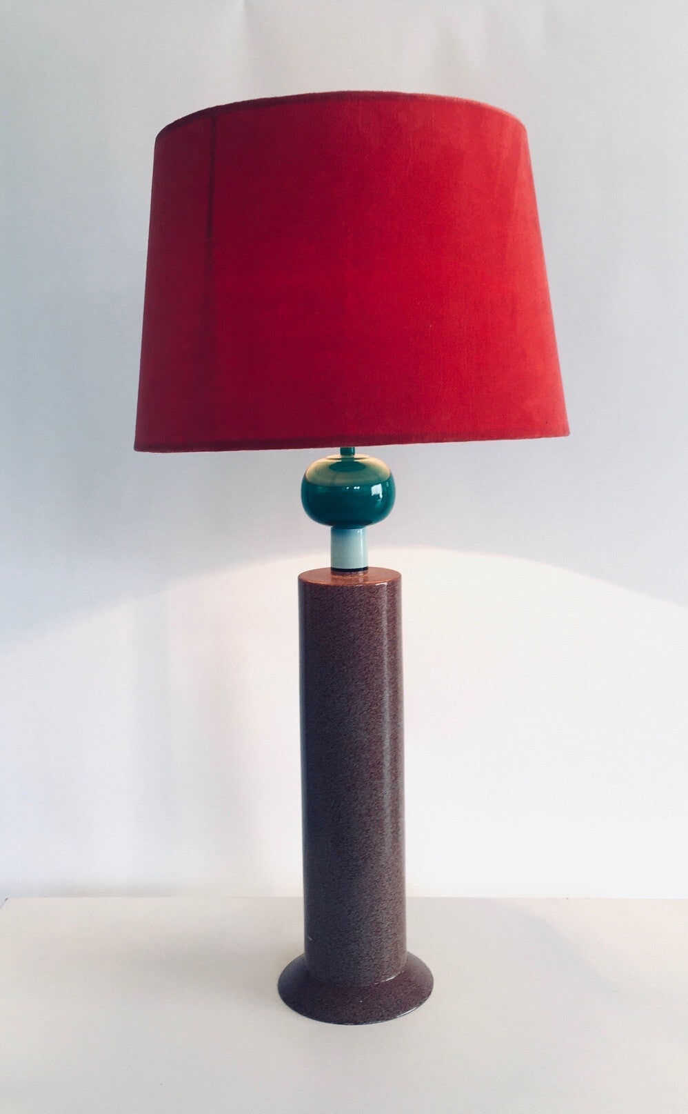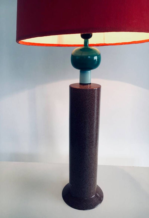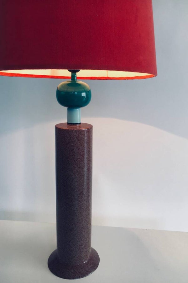 Vintage Postmodern Memphis Design Table lamp by Olivier Villatte. Made in France, 1980's period. Tower model painted wood table or desk lamp. Signed at the bottom. Sold with this red shade. Comes in good condition. Measures (not including the lamp shade) 59,5cm high x 15cm x 15cm.