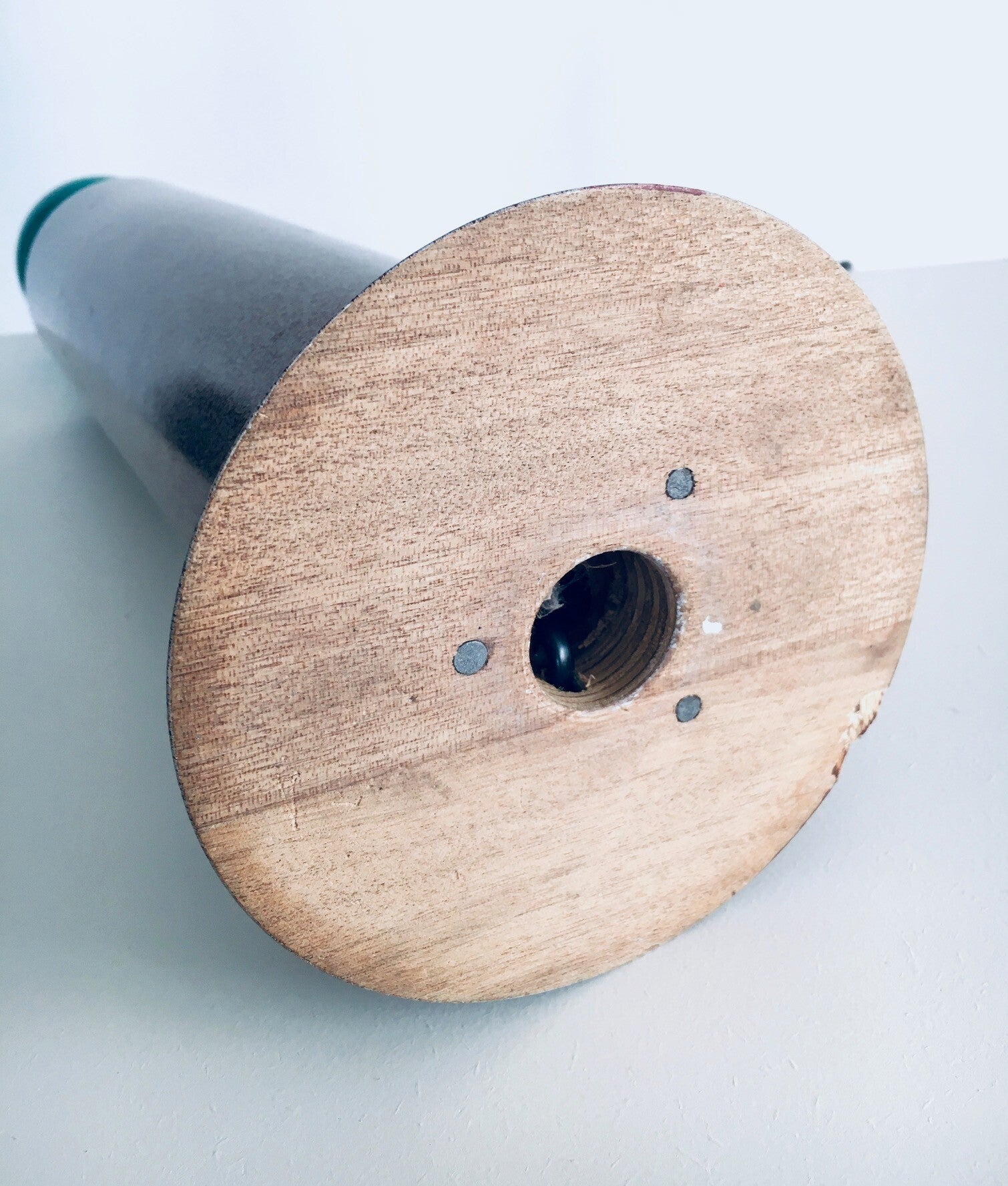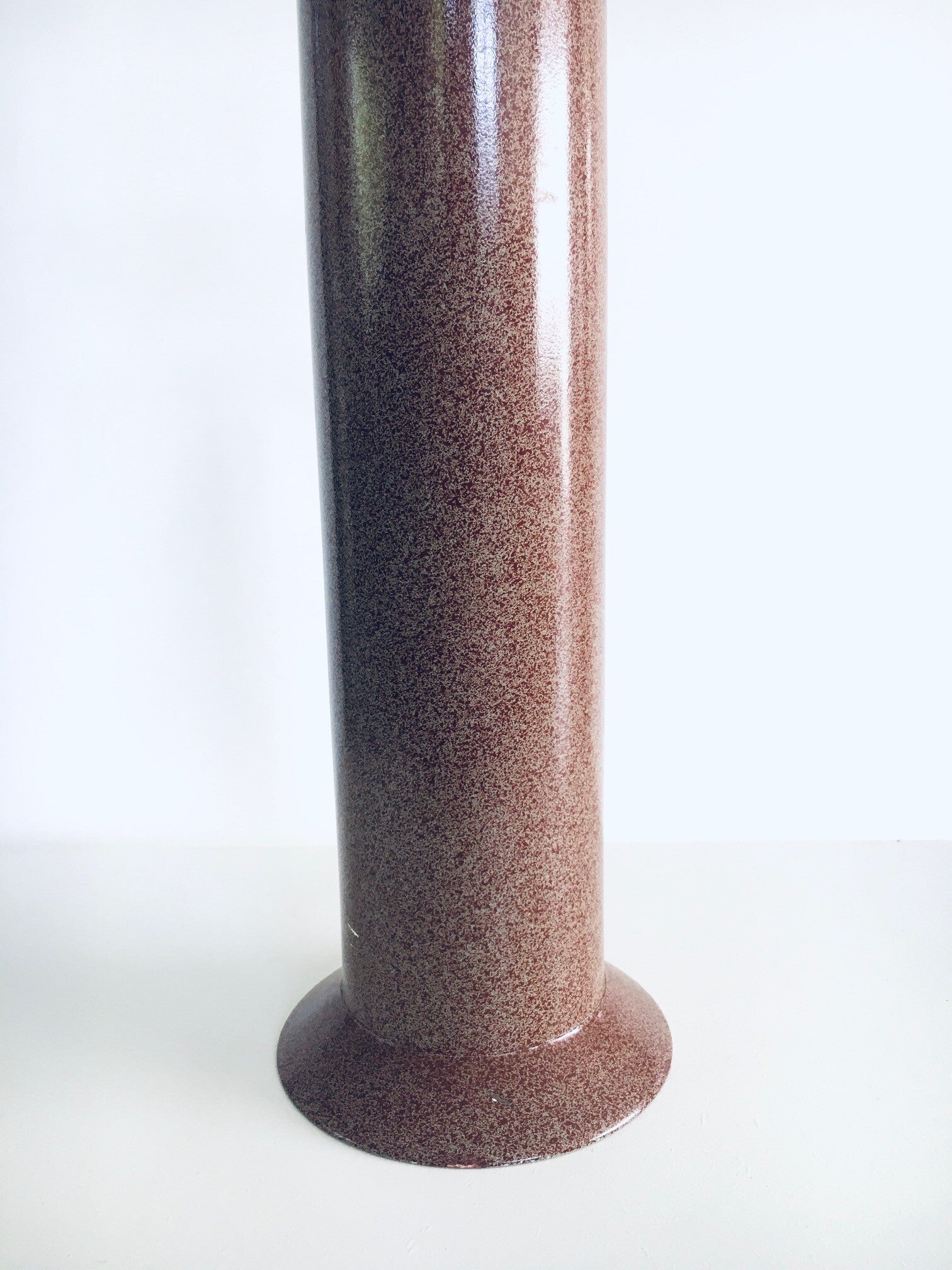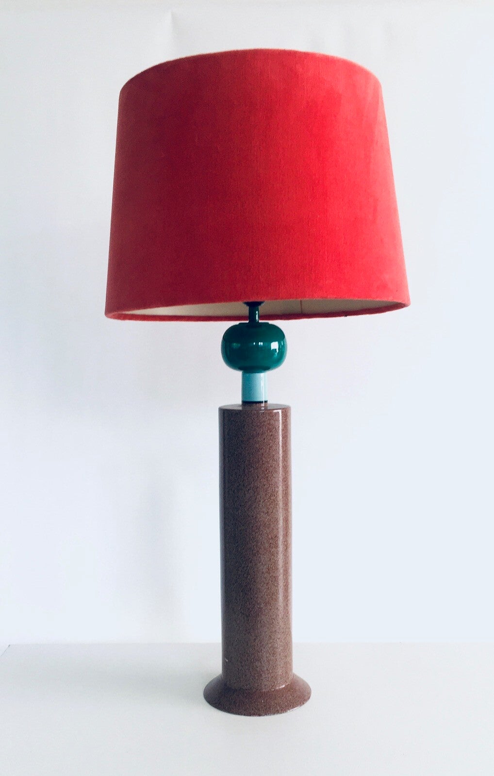 Vintage Postmodern Memphis Design Table lamp by Olivier Villatte. Made in France, 1980's period. Tower model painted wood table or desk lamp. Signed at the bottom. Sold with this red shade. Comes in good condition. Measures (not including the lamp shade) 59,5cm high x 15cm x 15cm.