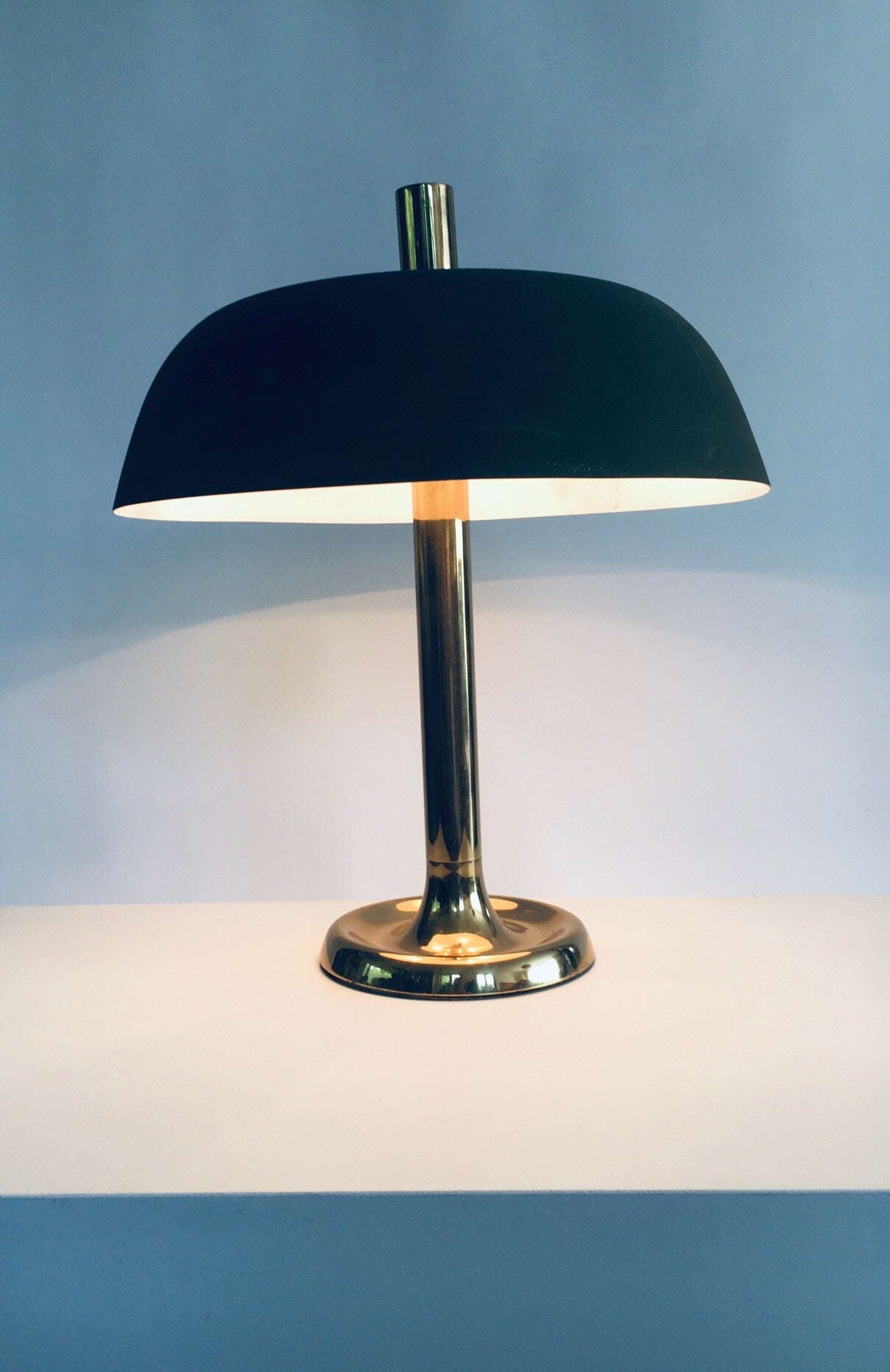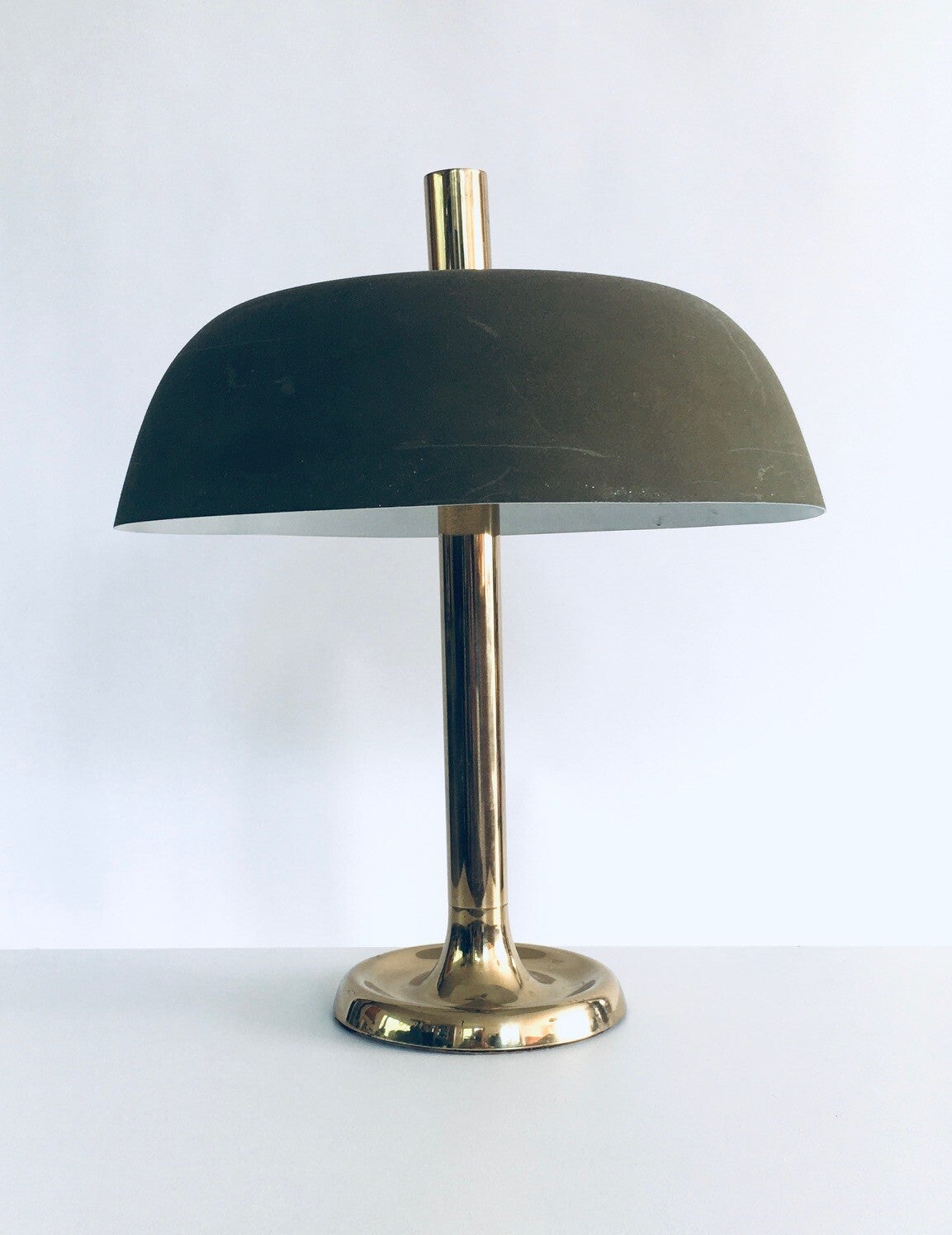 Vintage Midcentury Modern Design Mushroom Table Lamp model 7377 by Egon Hillebrand. Made in Germany, 1970's. Brass base with mat kaki colored metal shade. The lamp comes in good, working condition. Has the normal wear to the mat finished lamp shade from it's age and use. Scratches and scuff marks. Measures 55cm high x 45cm x 45cm.