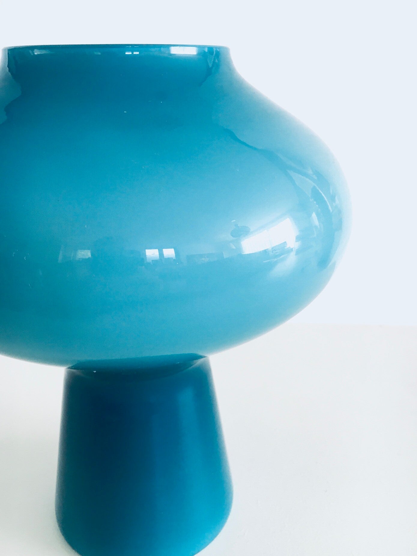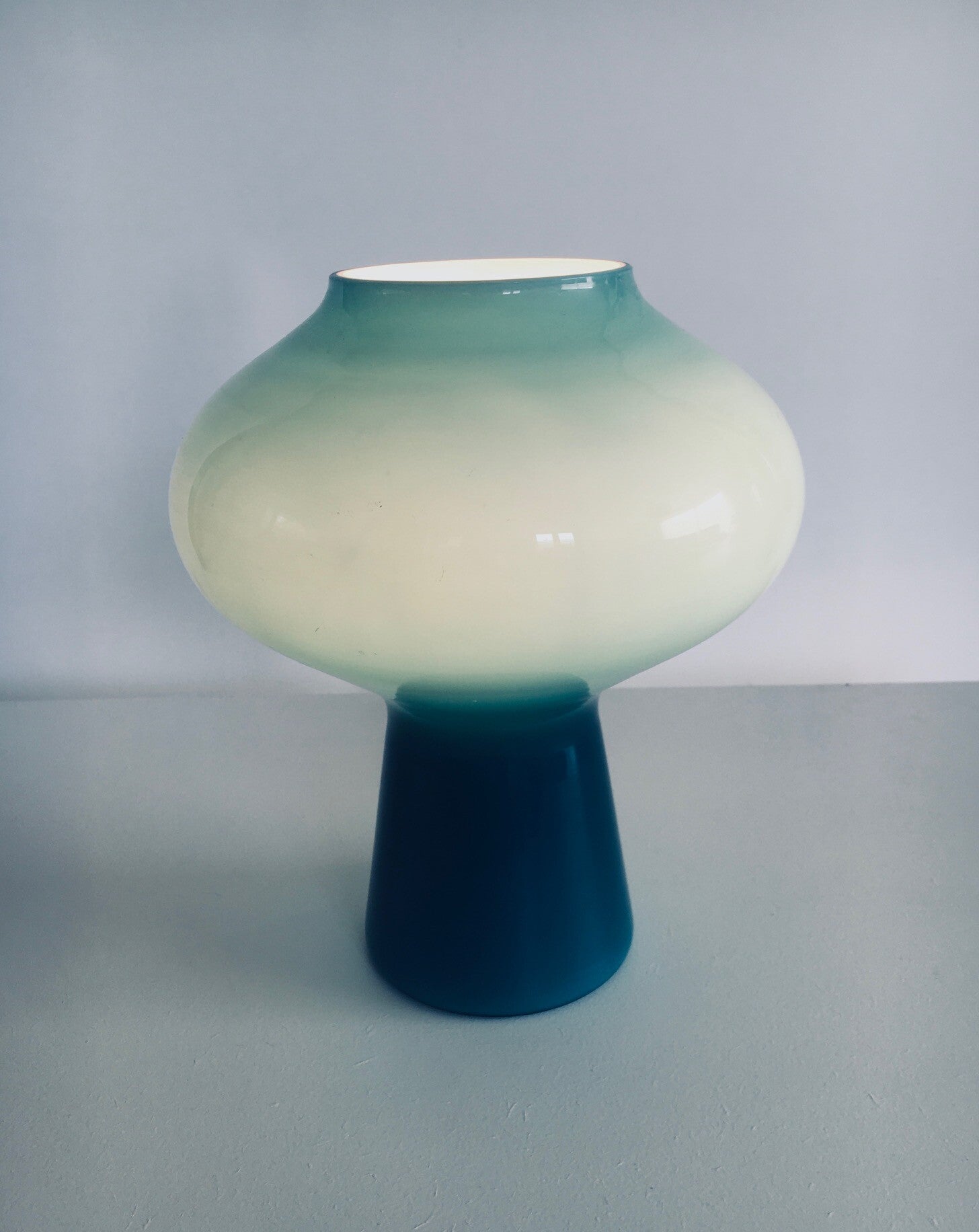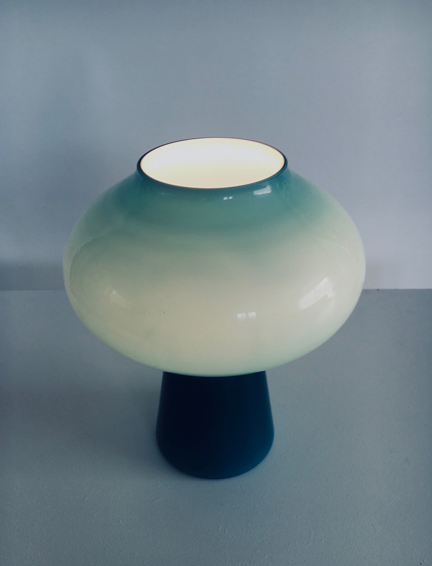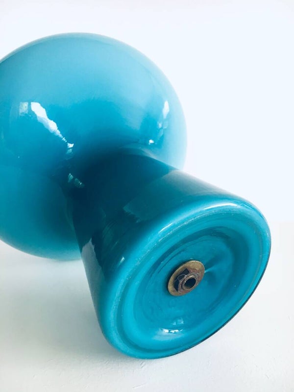 Vintage Midcentury Modern Design "FUNGO" Fungi Mushroom Blue Glass Table lamp by Massimo Vignelli for Venini. Made in Italy, Murano 1950's. Blue handblown opaline glass mushroom shape table lamp. This comes in very good working condition. Measures 25,5cm high x 22cm x 22cm.
