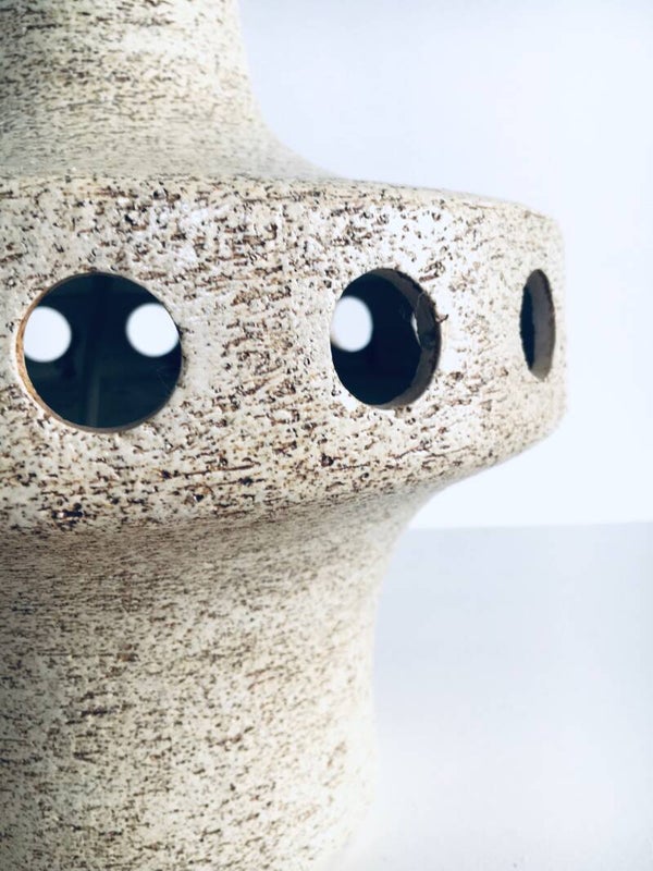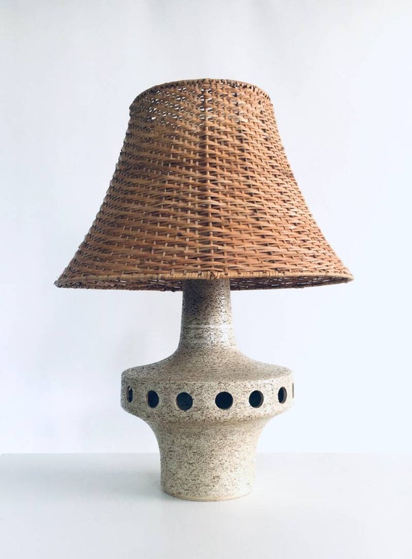 Vintage Midcentury Design Dutch Studio Art Pottery Table Lamp. Made in the Netherlands, 1960's period. Handmade pottery base in a cream color structured finish with round piercings and an original rattan lampshade. The base and shade come in very good condition. This needs a lamp fitting to work. The base measures 40cm x 28cm x 28cm. The lampshade measures 27,5cm x 42cm x 42cm.