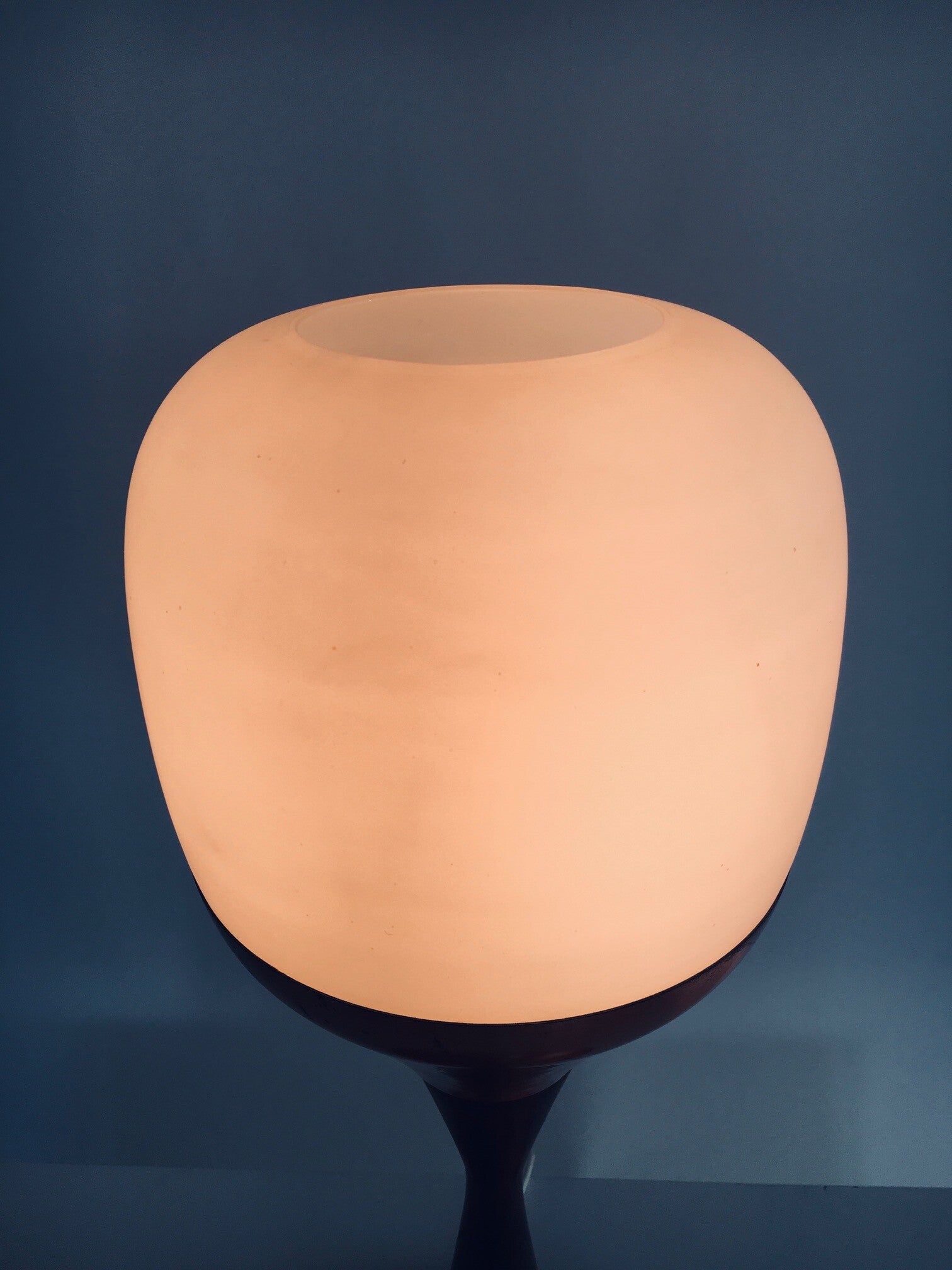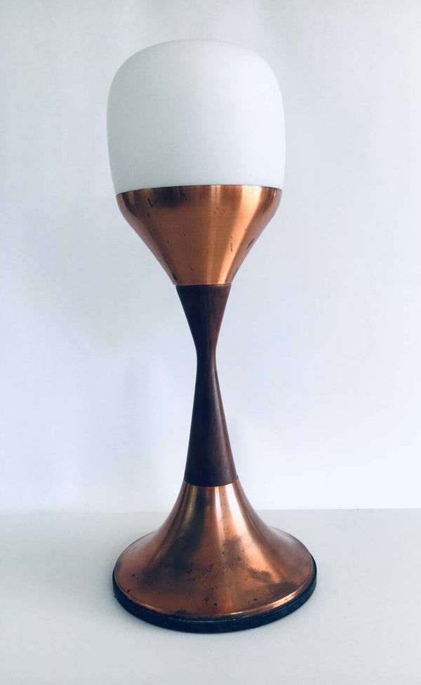 Vintage Midcentury Modern Scandinavian Design "Atomic" Low Floor Lamp. Made in Denmark, 1950's period. Low floor lamp or tall table lamp. The base is made in copper and teak wood with a milk opaline italian glass shade. This comes in very good and working condition. Measures 70cm high x 28cm x 28cm.