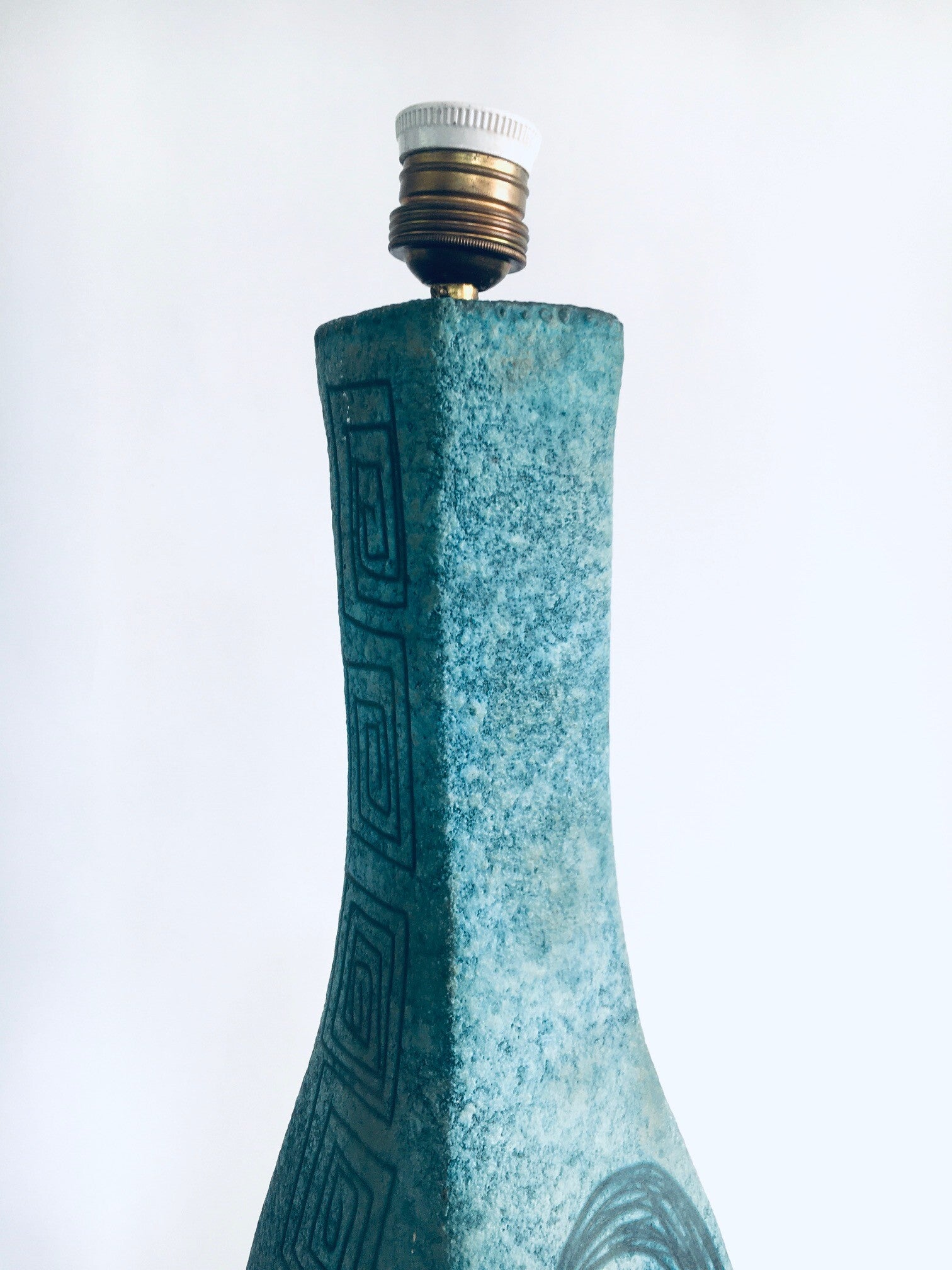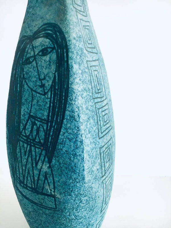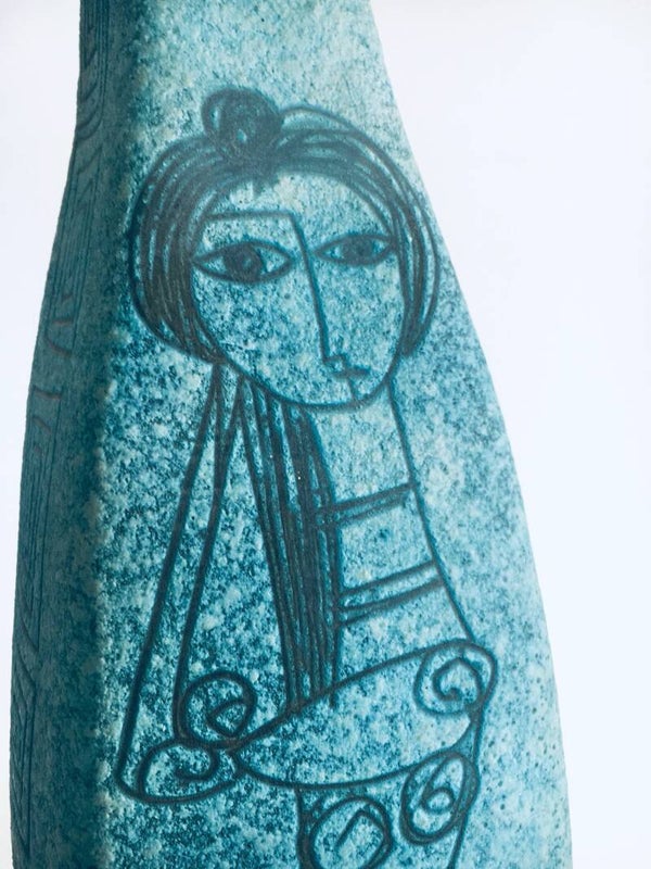 VERY RARE Vintage Midcentury Modern Design Art Ceramics Sgraffito large Table Lamp by Alvino Bagni for Raymor. Made in Italy, in the 1960's. Large and impressive tall table lamp base with lava structure glaze in turquoise green. Illustrated with an abstract female face on one side and a female figure at the back with S curls on the sides. This comes in very good and working condition. Measures 66cm x 17cm x 18cm.