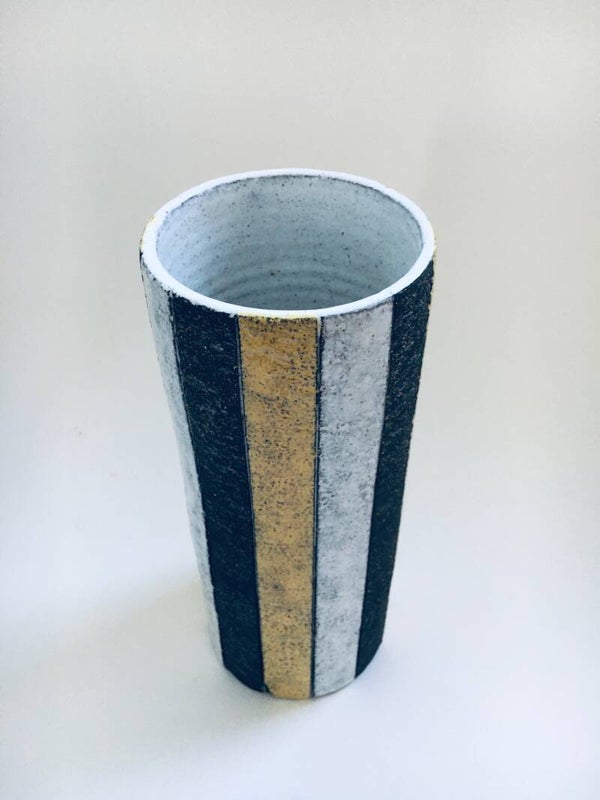 Vintage Midcentury Dutch Art Studio Pottery "Chanoir" Vase by Leendert Blok for Westraven Utrecht. Made in the Netherlands 1960's period. Marked on the bottom. Yellow and white stripe glazes on brown clay. This comes in very good condition. Measures 25,5cm x 10cm x 10cm.