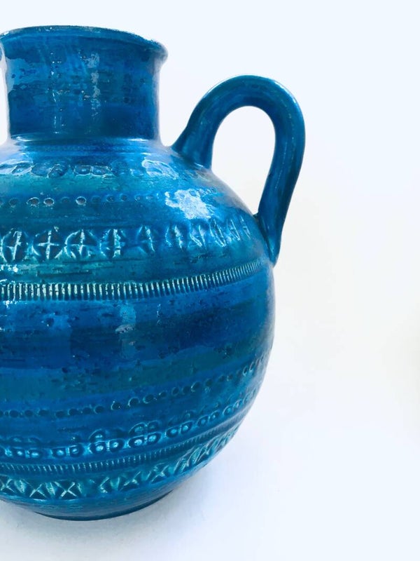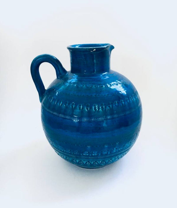 Vintage Studio Art Ceramics Rimini Blue XL Ball Decanter Vase by Aldo Londi for Bitossi. Made in Italy 1960's. Beautiful XL decanter carafe jug pitcher in the typical blue glazes and geometric stamped patterns. This has a small damage at the border edge of the spout. Otherwise in very good condition. Measures 26cm x 25cm x 24cm.