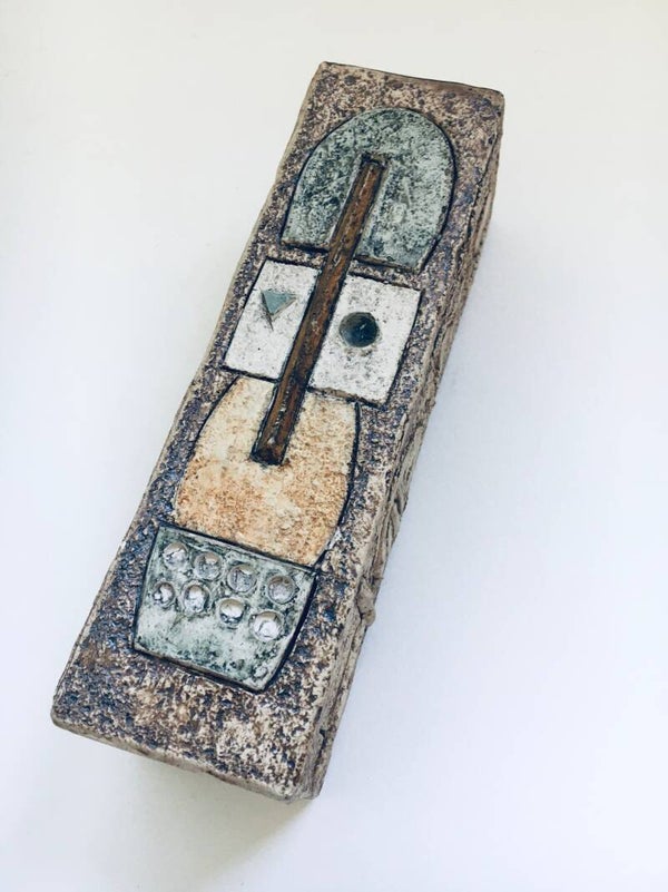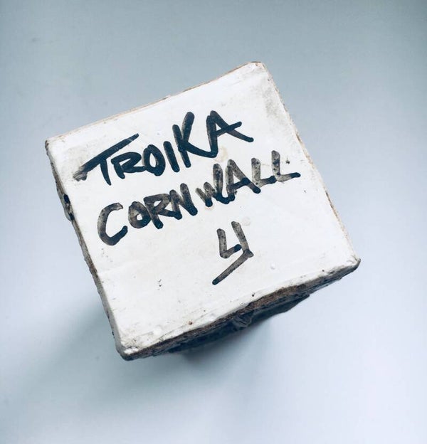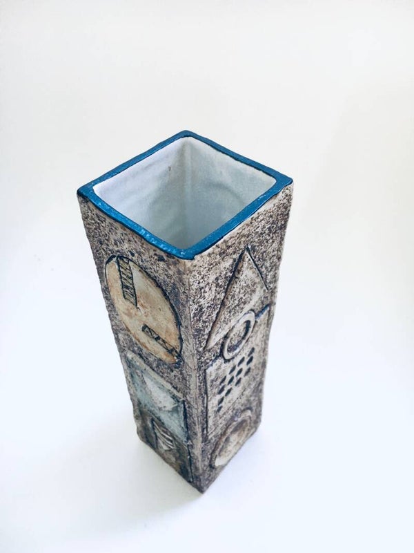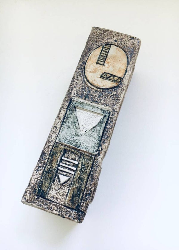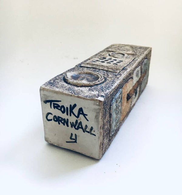 Vintage Brutalist Art Studio Pottery Rectangular Vase by Louise Jinks for Troika Cornwall. Made in the UK, Cornwall, England 1960's. Signed on the bottom; Troika Cornwall LJ, LJ stands for Louise Jinks. Beautiful abstract illustrated vase. This comes in very good condition. Measures 22,5cm x 6,5cm x 7cm.