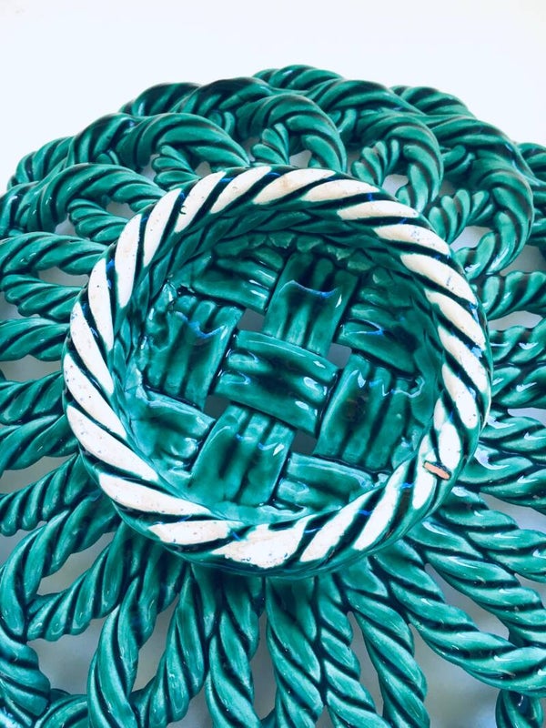 Vintage Art Ceramics Green Braided Woven Basket Bowl by Vallauris, France 1950's