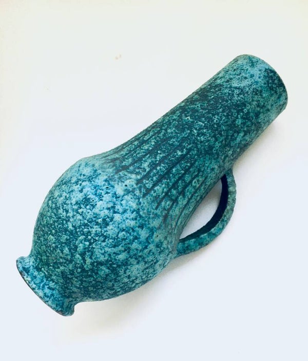 Rare Art Ceramics Sgraffito Handle Vase by Alvino Bagni for Raymor. Made in Italy 1960's period. Turquoise green lava structured handle vase carafe decanter with stripe carvings. This comes in very good condition. Measures 30,5cm x 16cm x 14cm.