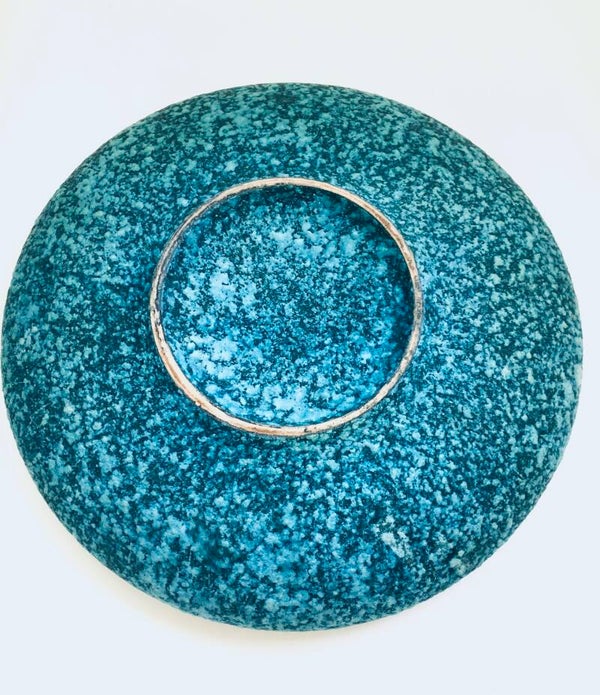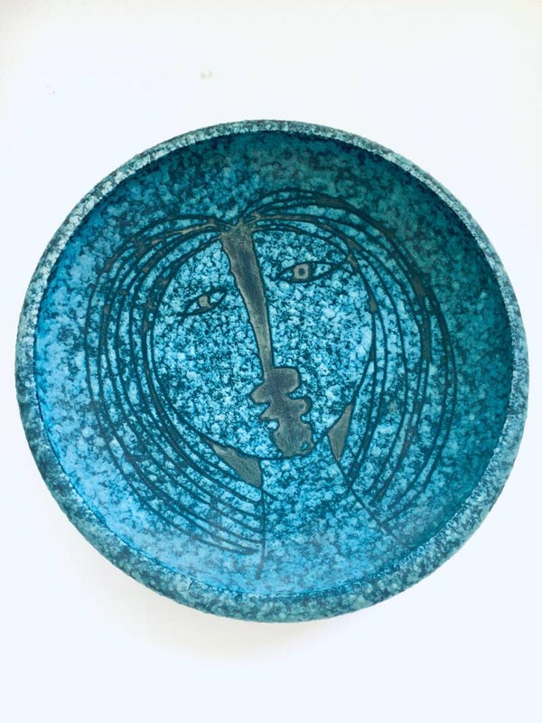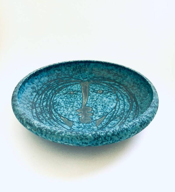 VERY RARE Vintage Midcentury Art Ceramics Sgraffito Female Face Bowl by Alvino Bagni for Raymor. Made in Italy, 1960's period. Large and impressive round shape bowl / dish with lava structure glaze in turquoise green. Illustrated with an abstract female face. This comes in very good condition. Measures 7cm x 32cm x 32cm.