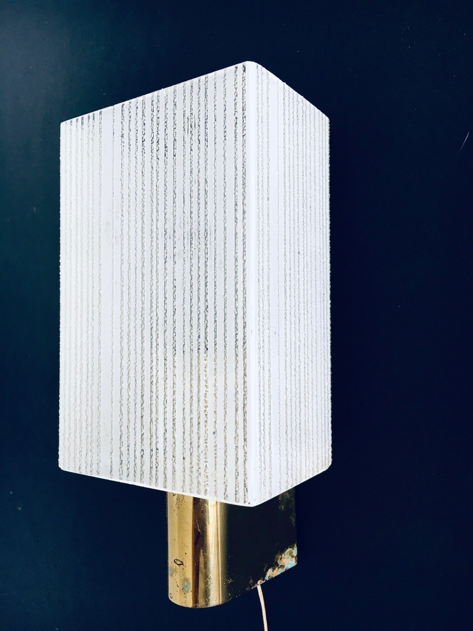 Vintage Midcentury French Design Brass & Glass Sconce Wall Lamp set of 3. Made in France, 1950's / 60's period. Brass dome base with structed and stripe pattern painted glass shade that slides in the brass fitting. Each has a cord switch mechanism. All come in good original condition. With normal wear from their age and use. Each measures 19cm high x 9cm wide x 7,5cm deep.