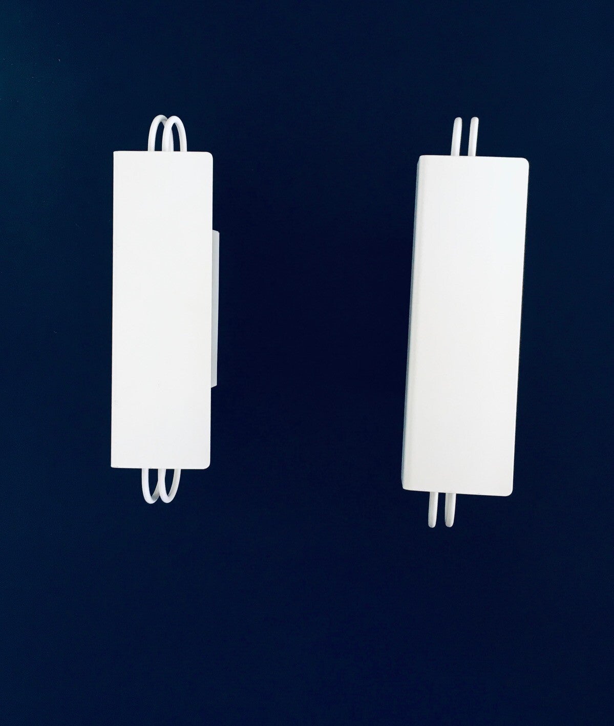 Vintage Postmodern Architectural Design Sconce Wall Lamp set of 2. Made in Belgium, 1980's period. Cream lacquered metal construction with adjustable light cover. Both are in very good condition. Each measures 31cm high x 7,5cm wide x 10,5cm deep.