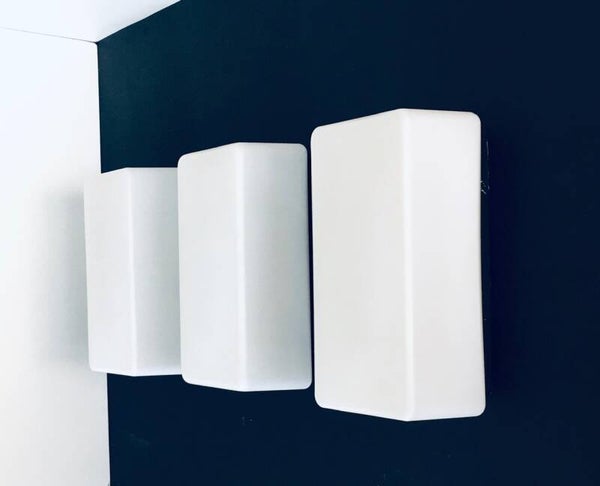 Vintage Midcentury Design Rectangular Opaline Sconce Wall Lamp set of 3 by Staff Leuchten. Made in Germany, 1950's / 60's. Marked on the inside. Beautiful rectagular mat milk opaline glass on black metal base. These come in very good condition. Each measures 23cm high x 11,5cm wide x 10,5cm deep.