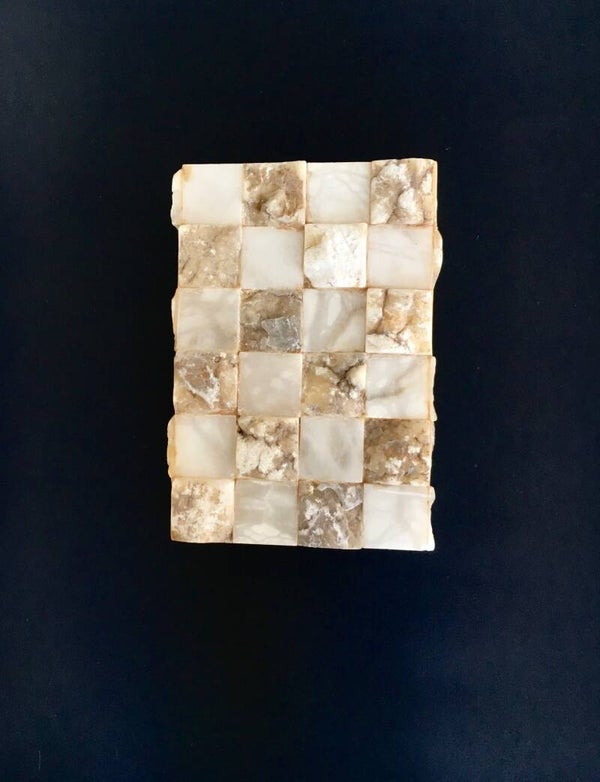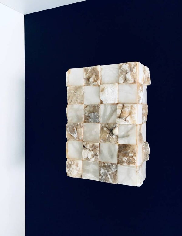 Vintage Architectural Onyx Stone Sconce Wall Lamp - model 1. Made in Italy, 1970's period. Onyx stone carved and fitted together to make this large rectangular sconce. This comes in very good condition, with lamp fitting wall plate. This takes 2 lamps. Measures 30cm high x 21cm wide x 9cm deep.