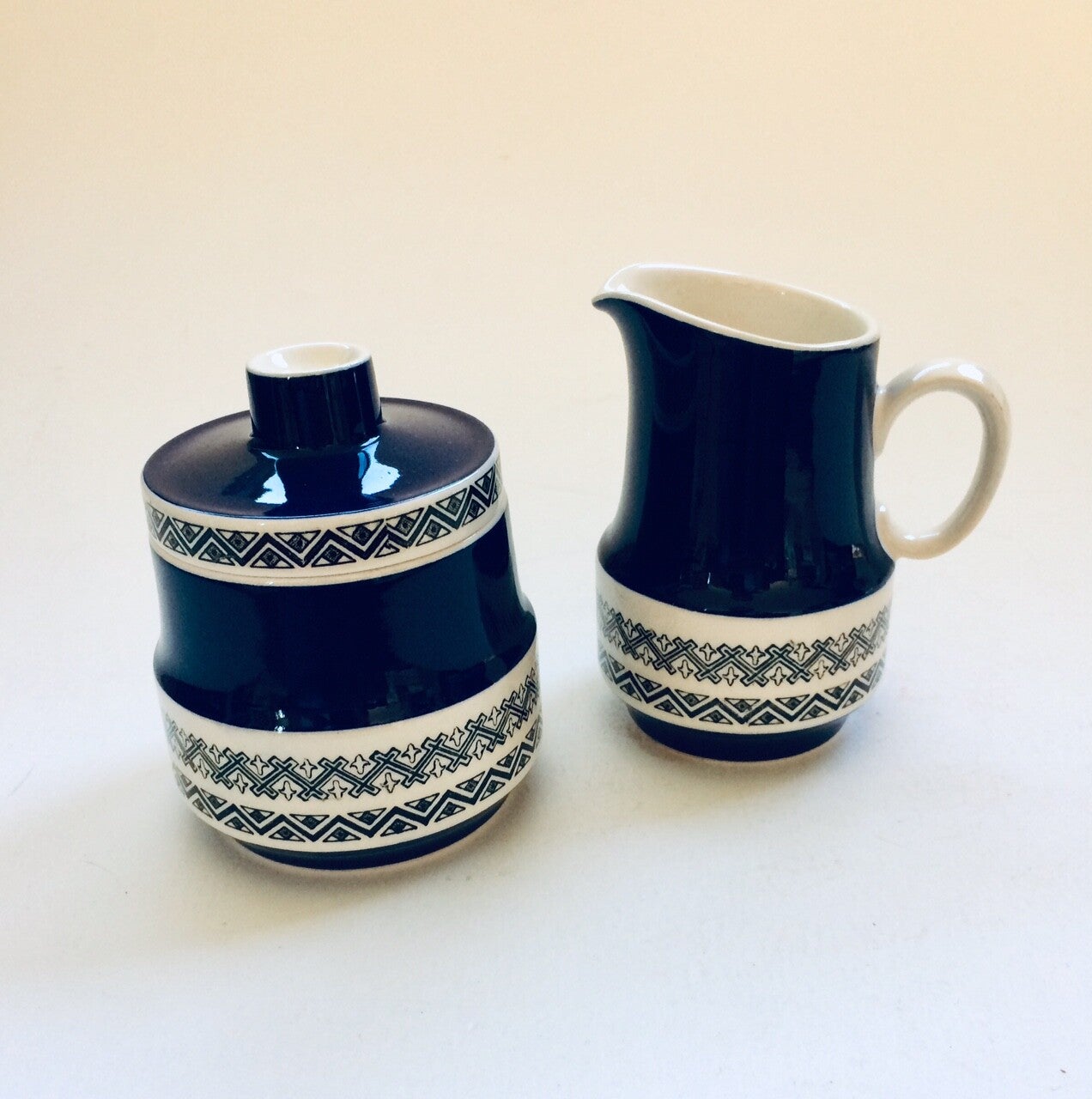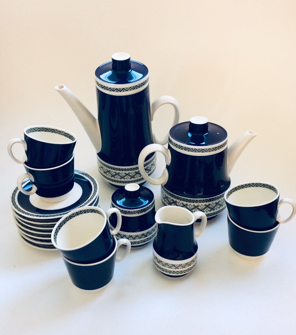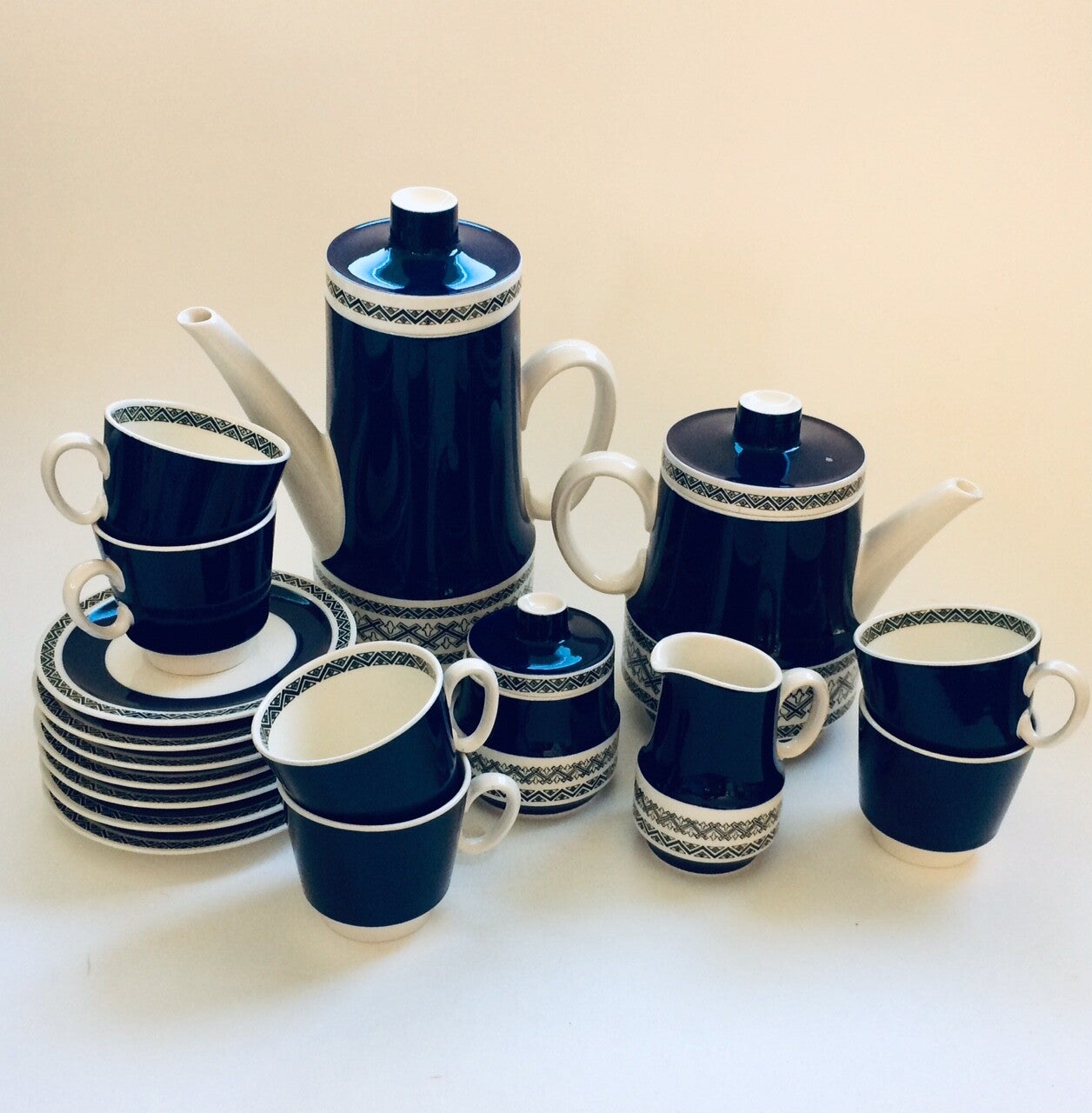 Vintage Midcentury Modern Design Ceramic Coffee & Tea service set by Villeroy & Boch, Mettlach, Germany 1960's. Saphir series. Mettlacher Kupferdruck Unterglasur. Service consist of Coffee pot, Tea pot, Milk jug, Sugar pot and 6 cups and saucers (+2 extra saucers). This set comes in good condition. Sold as a set.