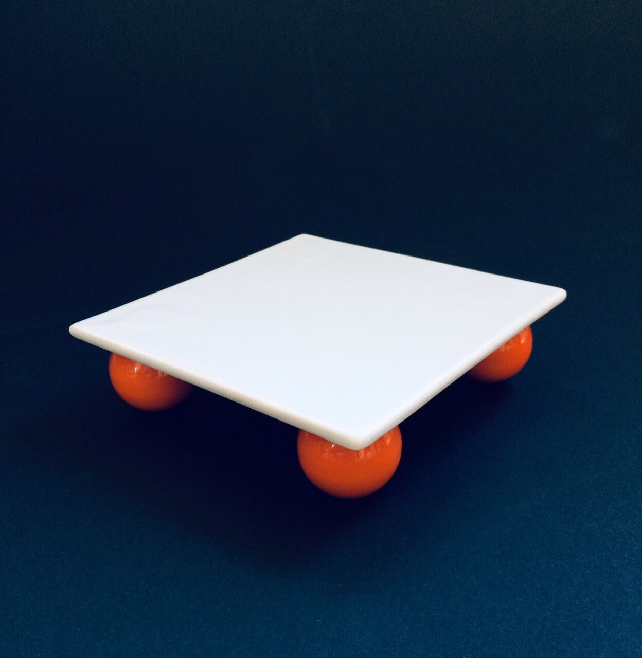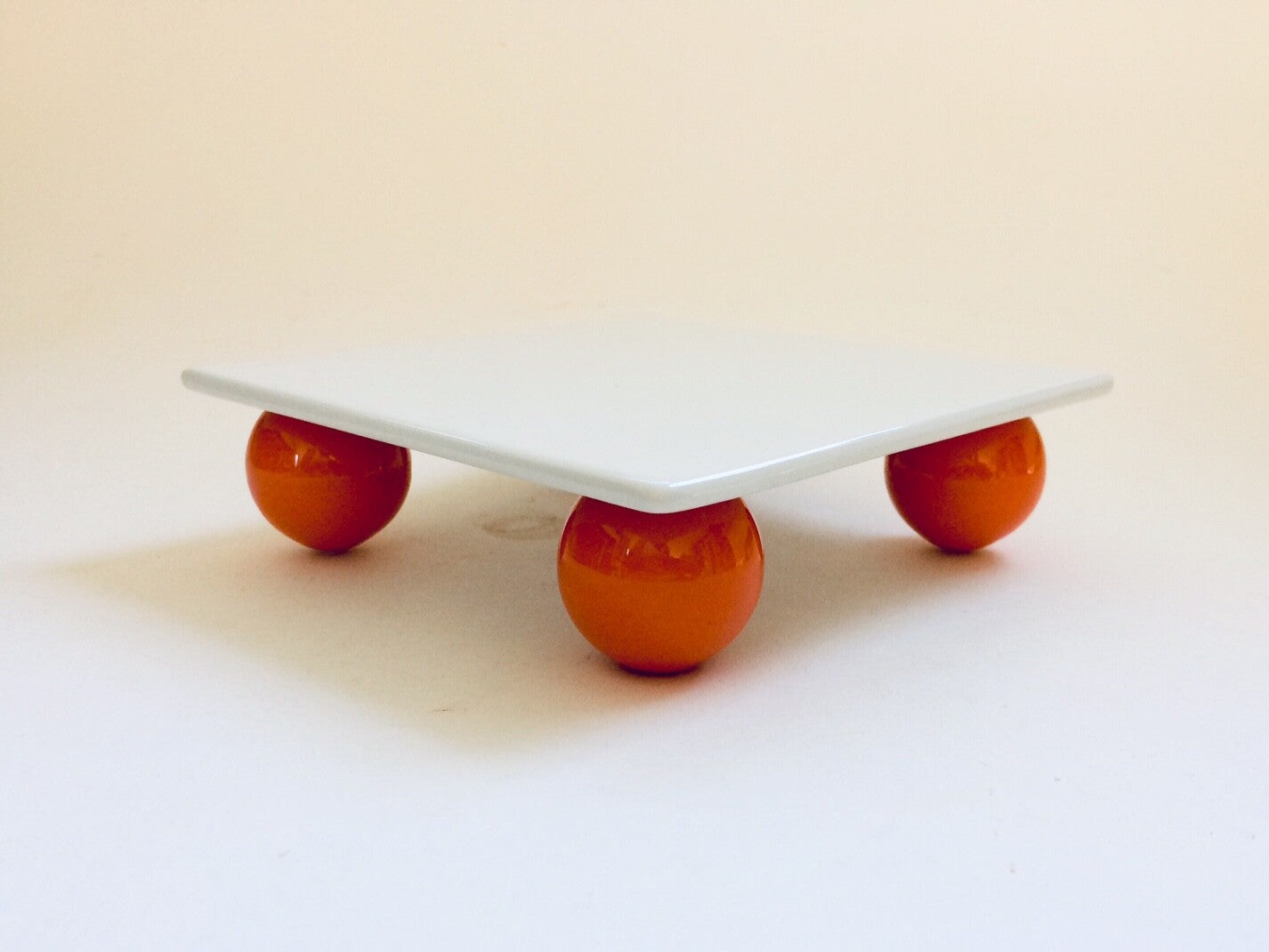 Vintage Postmodern Design in Memphis Style Ceramic Coaster, white ceramic tile with 4 orange ceramic balls as support. Made in the 1980's, no maker markings. In pristine condition. 17,5cm x 17,5cm x 5cm.