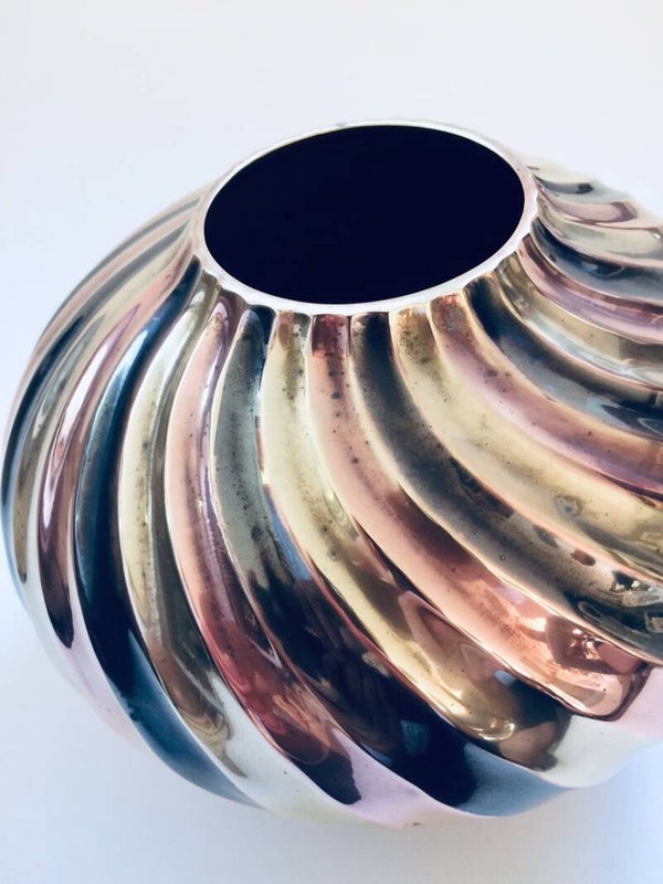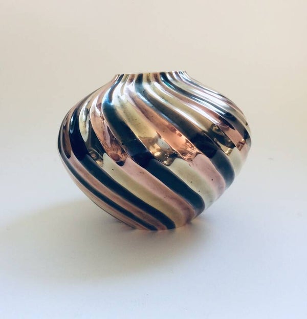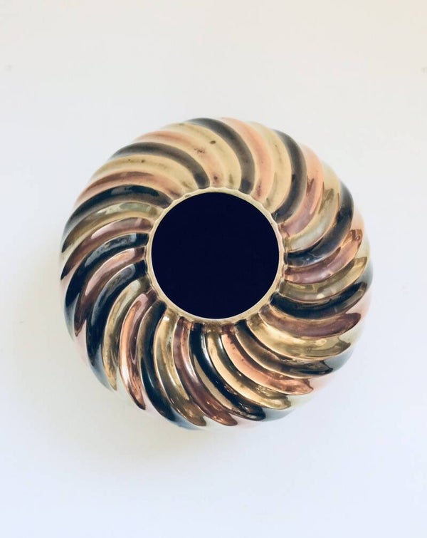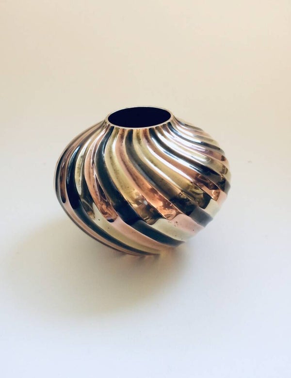 Vintage Hollywood Regency Style Design Brass Swirl Flower Vase. Made in the 1970's. 3 color swirl vase, grey, copper and brass gold. In very good condition. 20cm x 20cm x 16cm.
