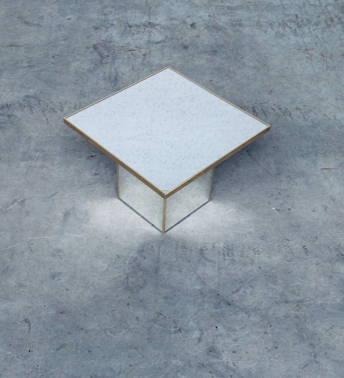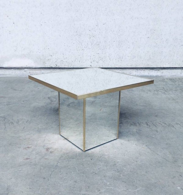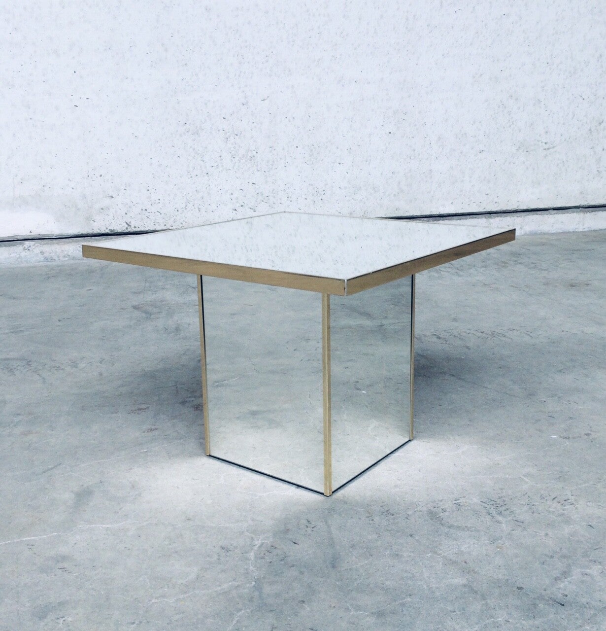 Vintage Hollywood Regency Style Design Square Mirror Side Table with brass trim. Made in Belgium, 1970's. All Mirrors on all sides. No maker markings. In very good condition. 50cm x 50cm x 37cm.