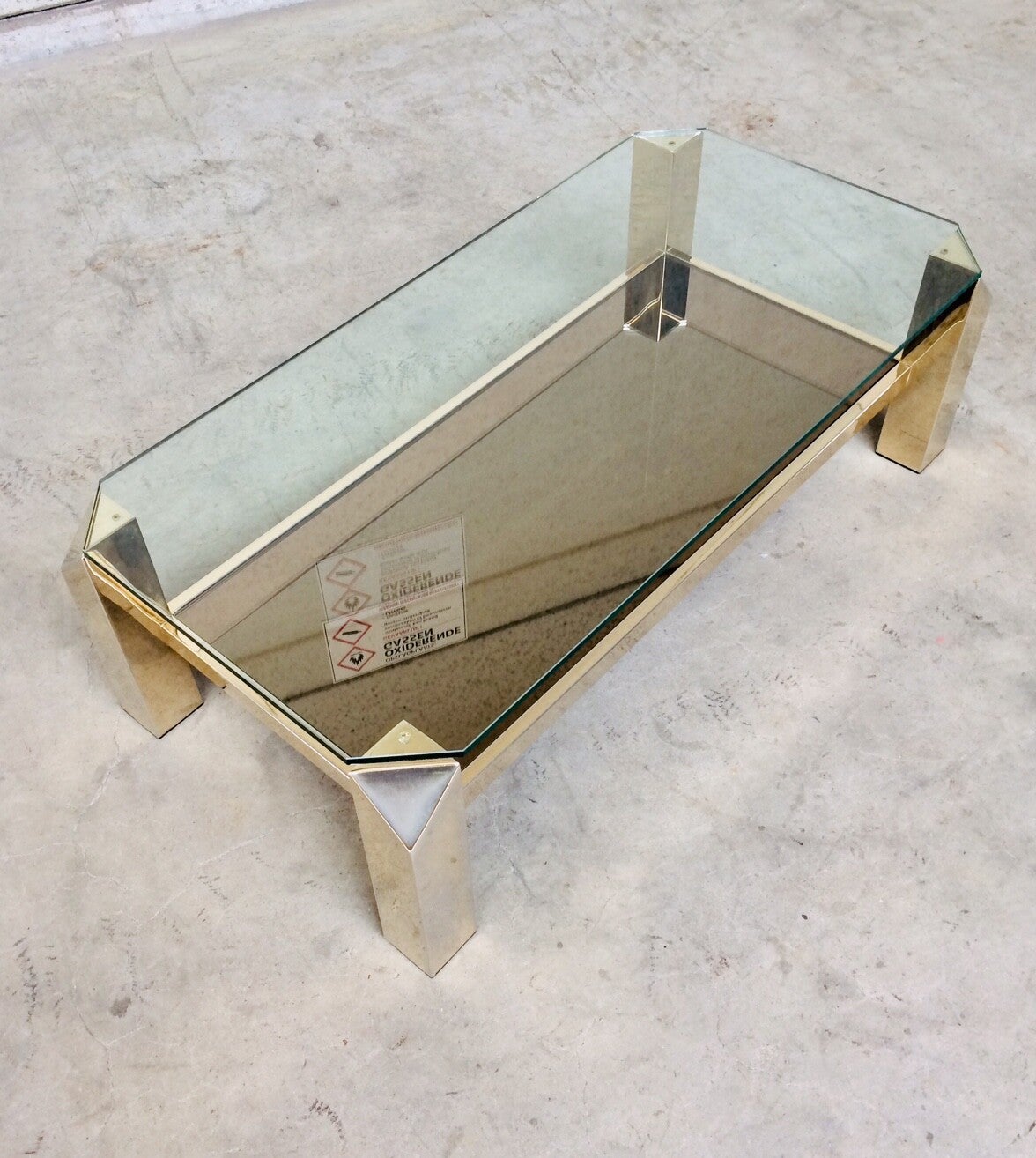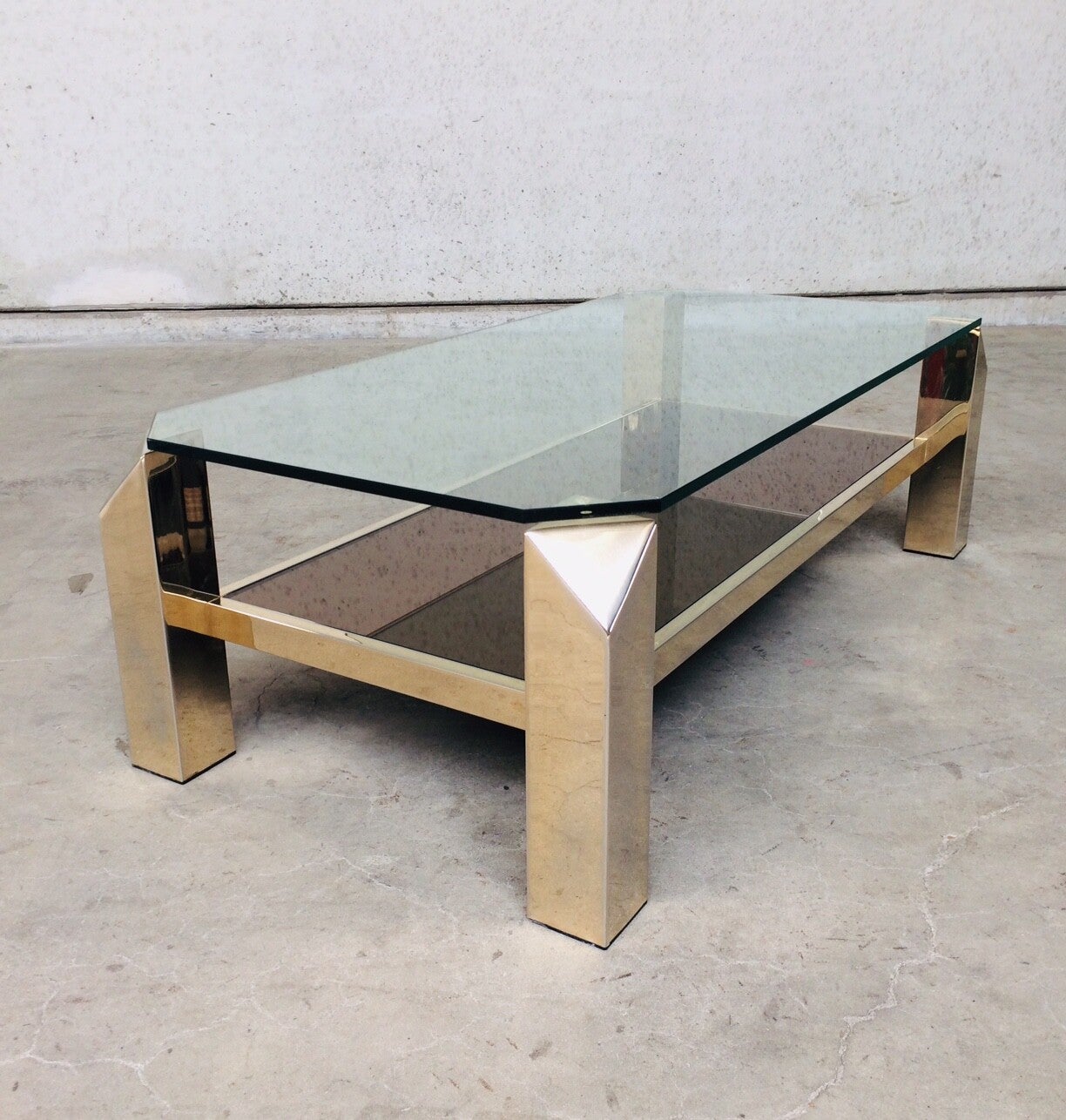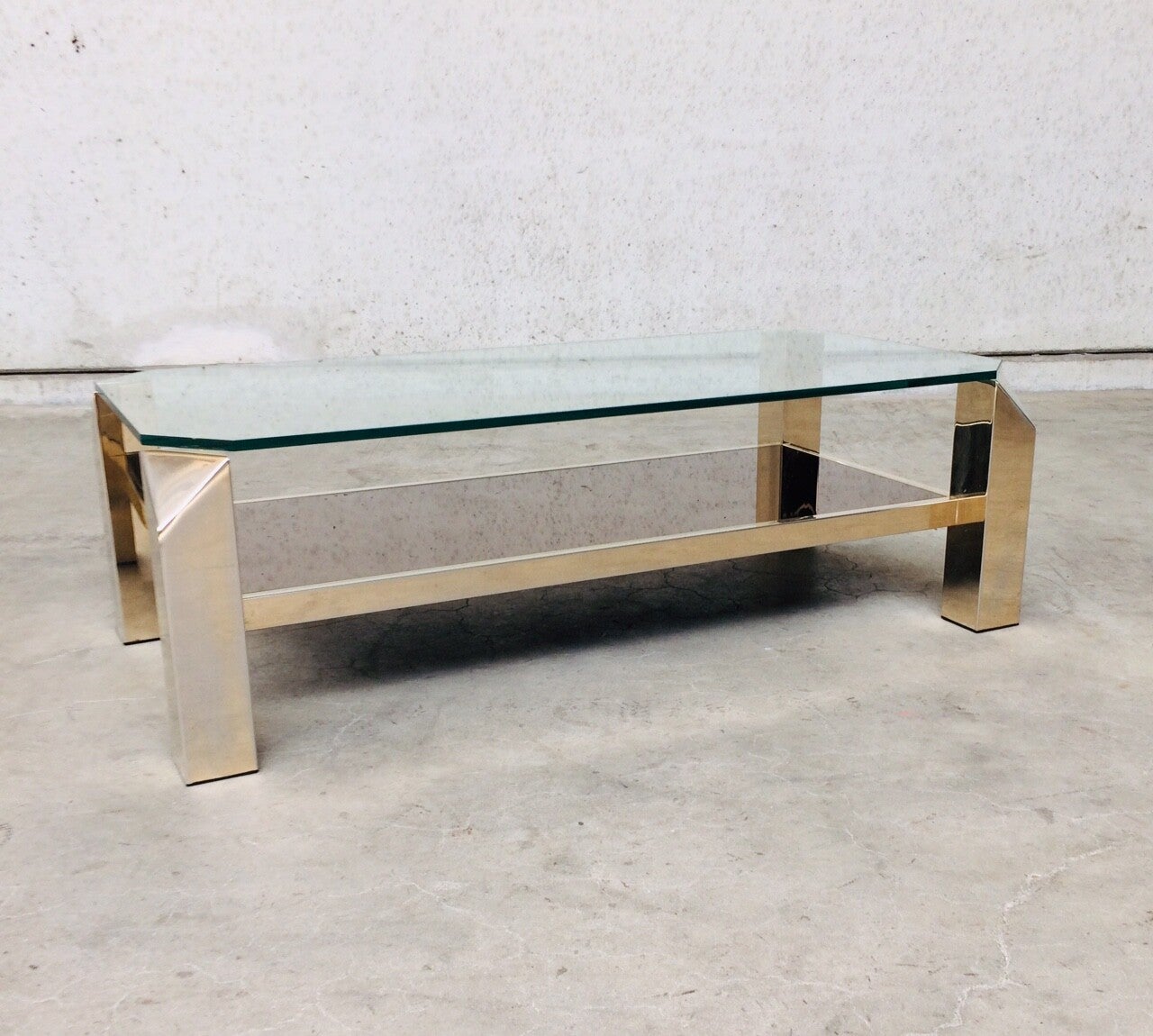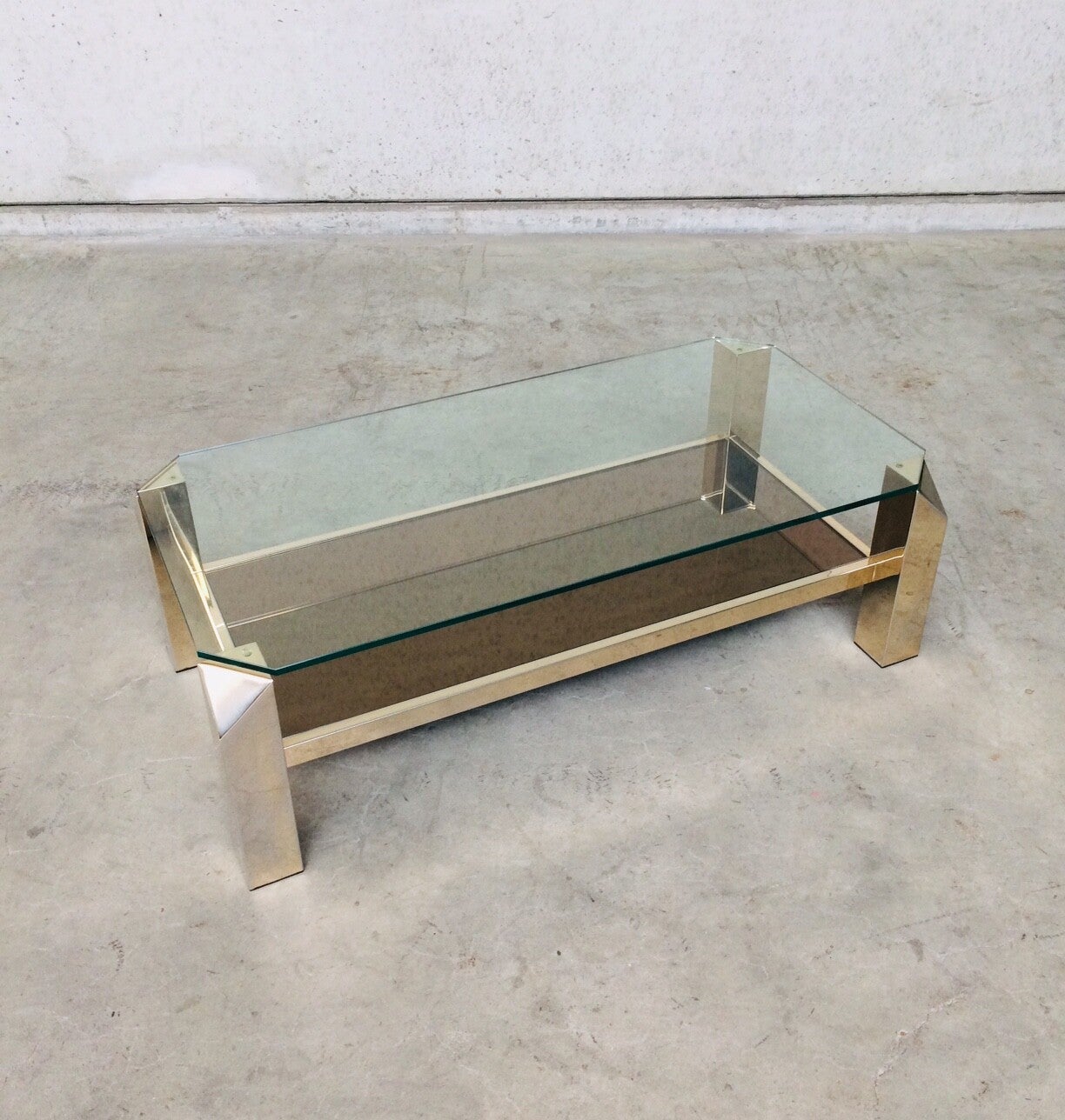 Vintage Midcentury Modern Belgian Design gold gilded metal & glass Coffee Table by Belgochrom. This is the largest version of this series tables. Made in Belgium by Belgochrom, late 1970's - early 1980's. In very good condition. Slight discoloration on gilded metal base. Clear glass top & brown mirror glass bottom inlay. 120cm x 60cm x 38,5cm.