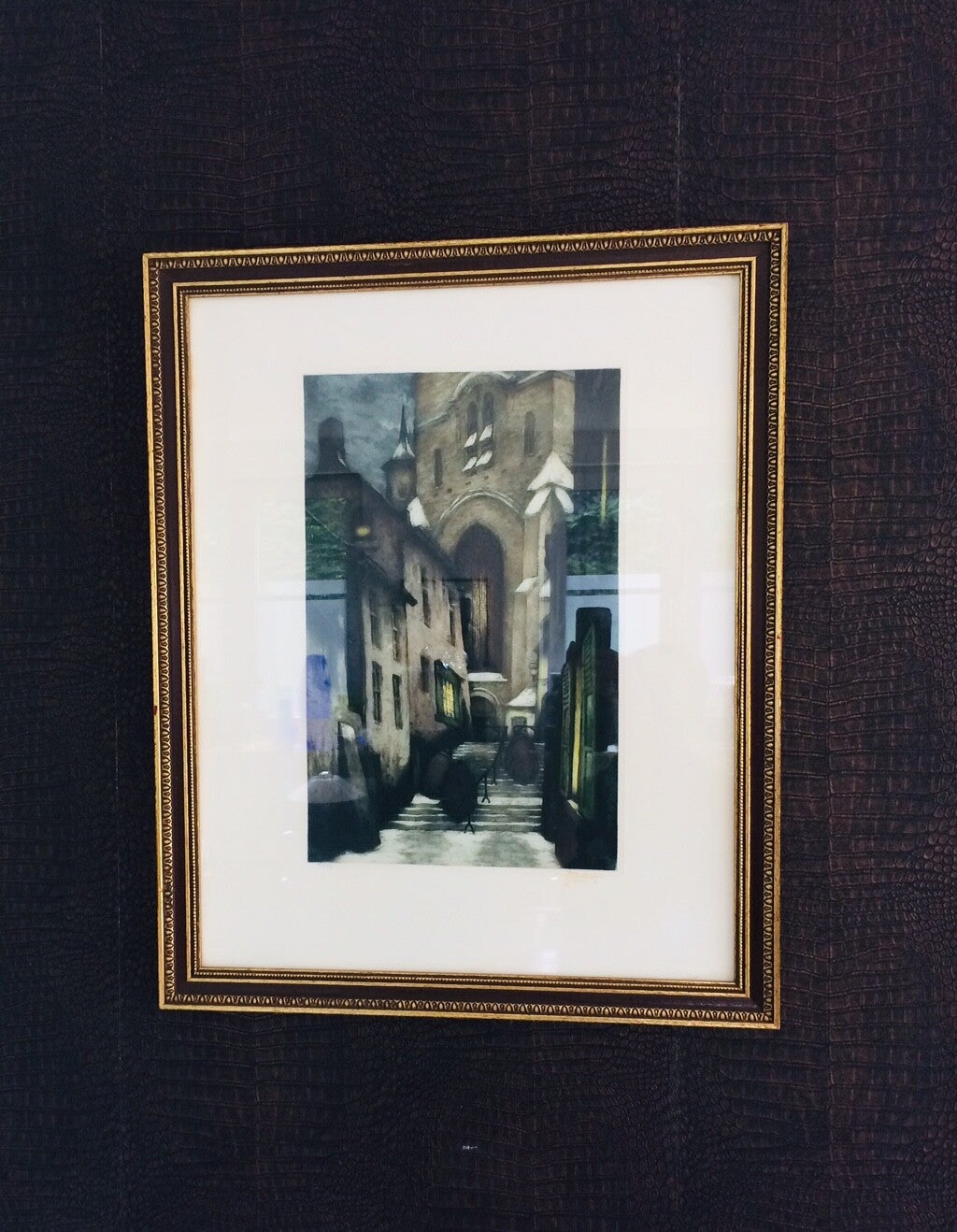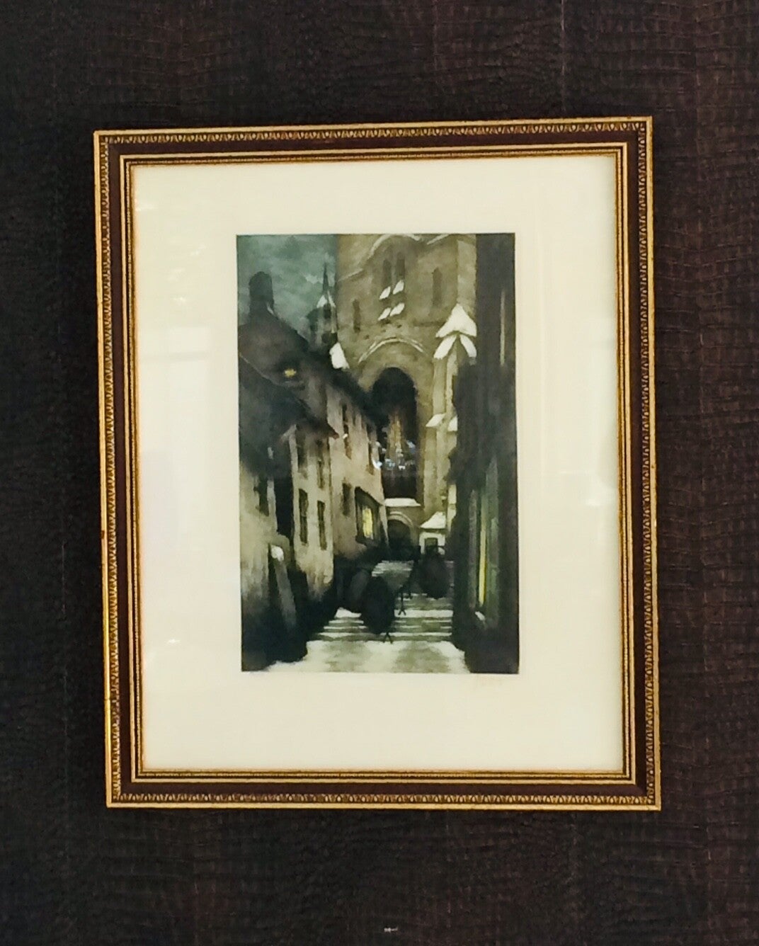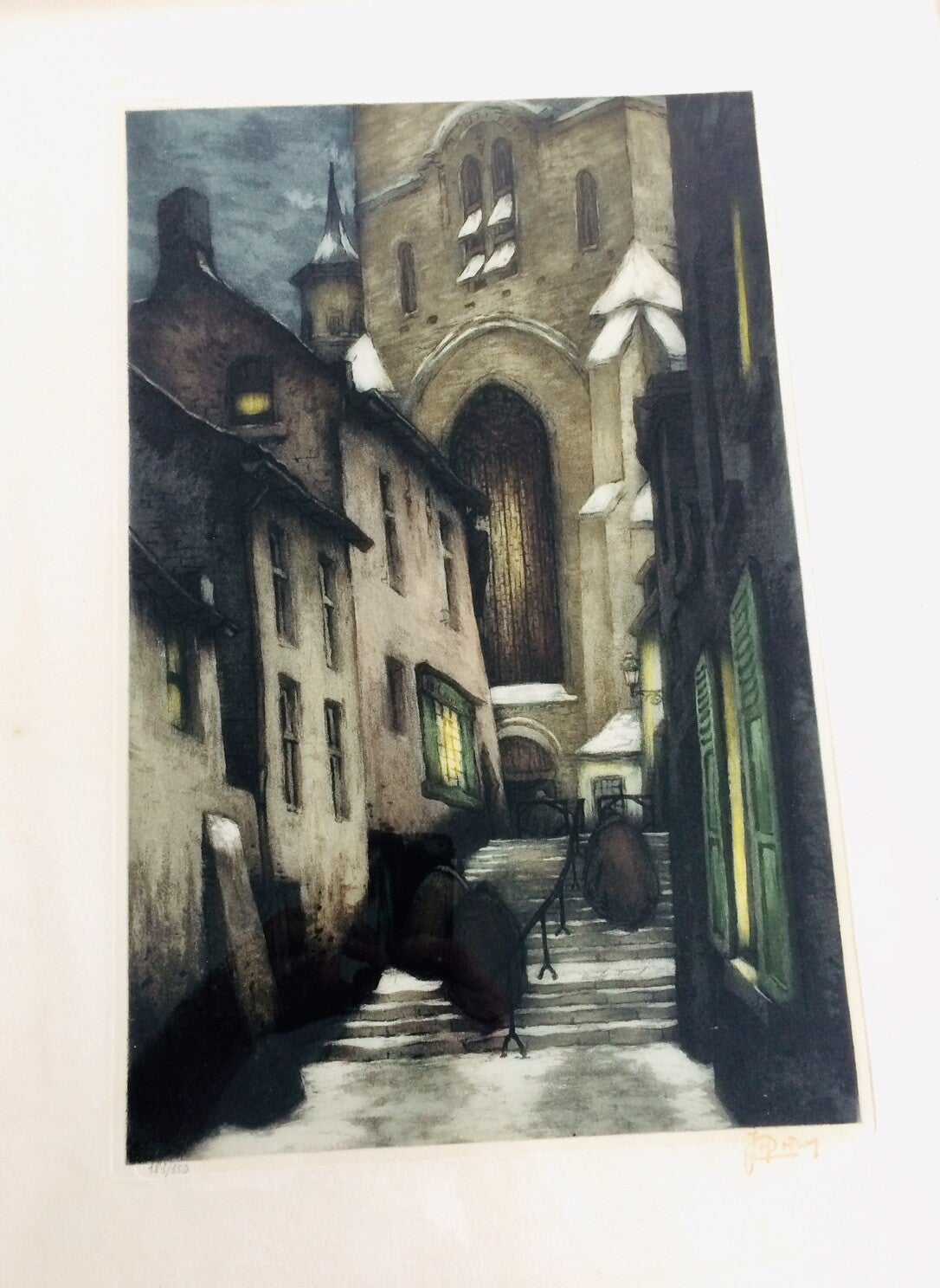 Original Art Stone Litho Print "Going to Midnight Christmas Mass". Winter night city scene with 4 people walking the stairs up to church. Signed, stamped and numbered print: 183/350. I can not make out the artist signature. Well framed in wooden frame with glass front. Print measures: 29cm x 45cm. Frame measures: 57,5cm x 70cm x 2,5cm.