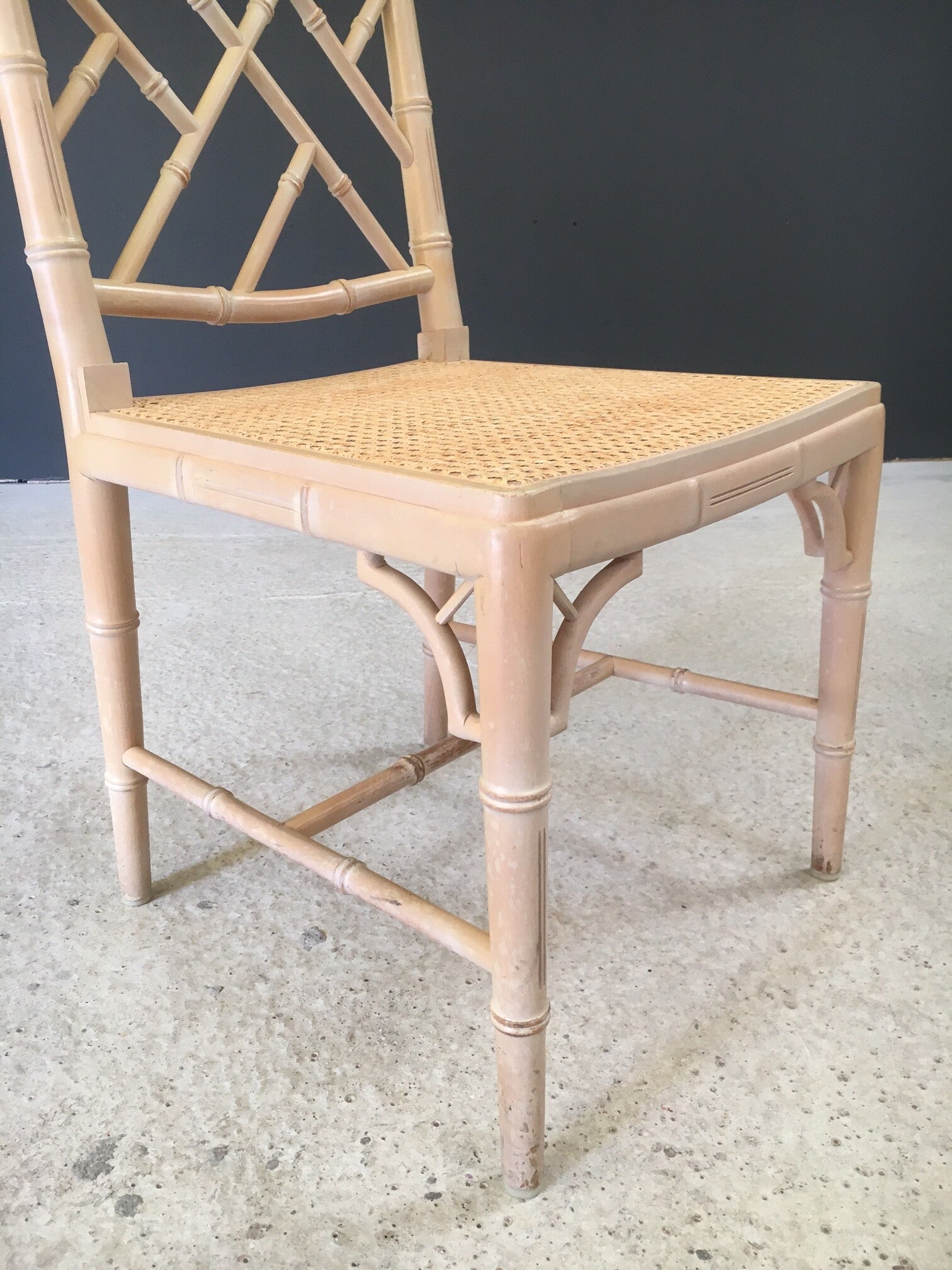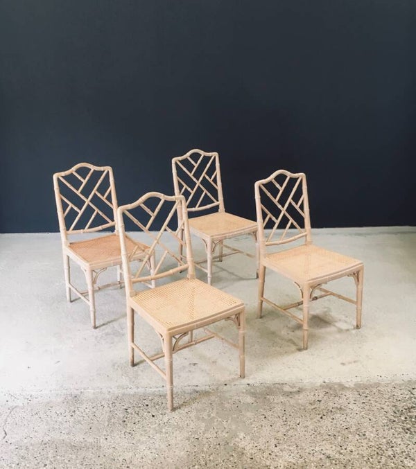 Vintage Boho Chippendale Style Design Faux Bamboo Dining Chair set of 4. Made in Italy in the 1980's. Faux bamboo wood frame with beige finish and webbing seats. The have scratches and signs of wear and use on all chairs. This wear does give them a nice well lived look. One chair has a break in the back rest (see last 2 pictures). Each chair measures 93cm x 47cm x 48cm. Seat height measures 43cm.