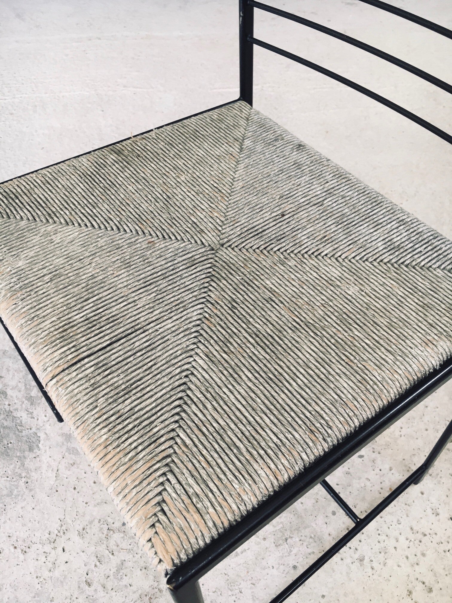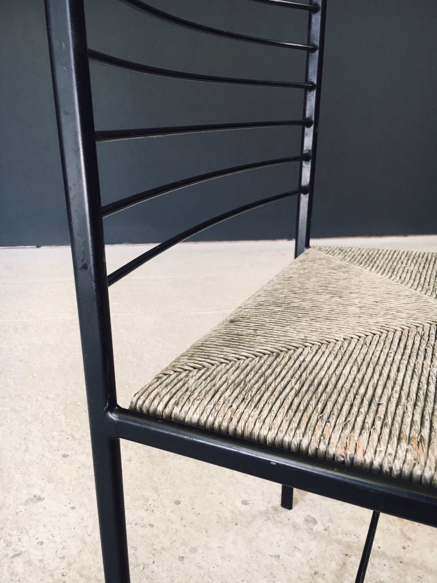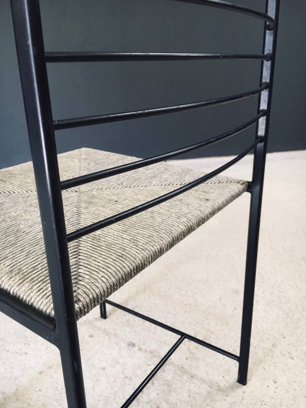Vintage Postmodern Design "Alice" Dining Chairs by Cidue. Made in the 1980's in Italy. Slender black lacquered metal frame with grey stained rush woven seats. They all shows signs of their use and age. Paint loss on the metal frame and the seats which gives these a very nice patina and more industrial look. Very nice airy designed chairs that blend in transparancy and lightness. Each chair measures 81,5cm x 44,5cm x 46cm. Seat height measures 46cm.