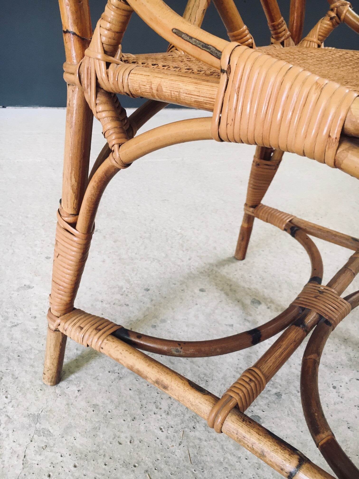 Vintage Midcentury Boho Design Chippendale Style Bamboo Dining Chair set of 4. Made in Italy, 1960's period. Bamboo constructed chairs with webbing woven seats. These comes in good overall condition with normal signs of their use and age. Each chair measures 95cm x 50,5cm x 55cm. Seat height measures 44,5cm.