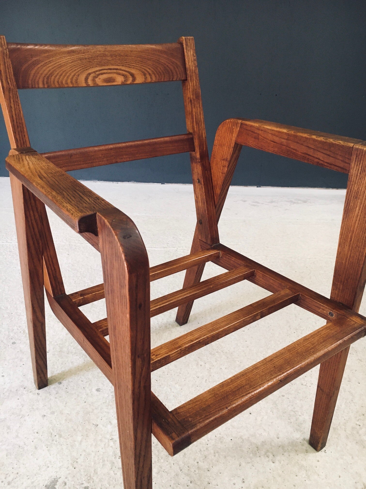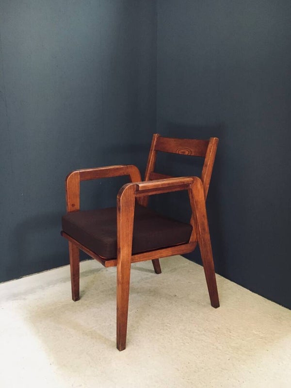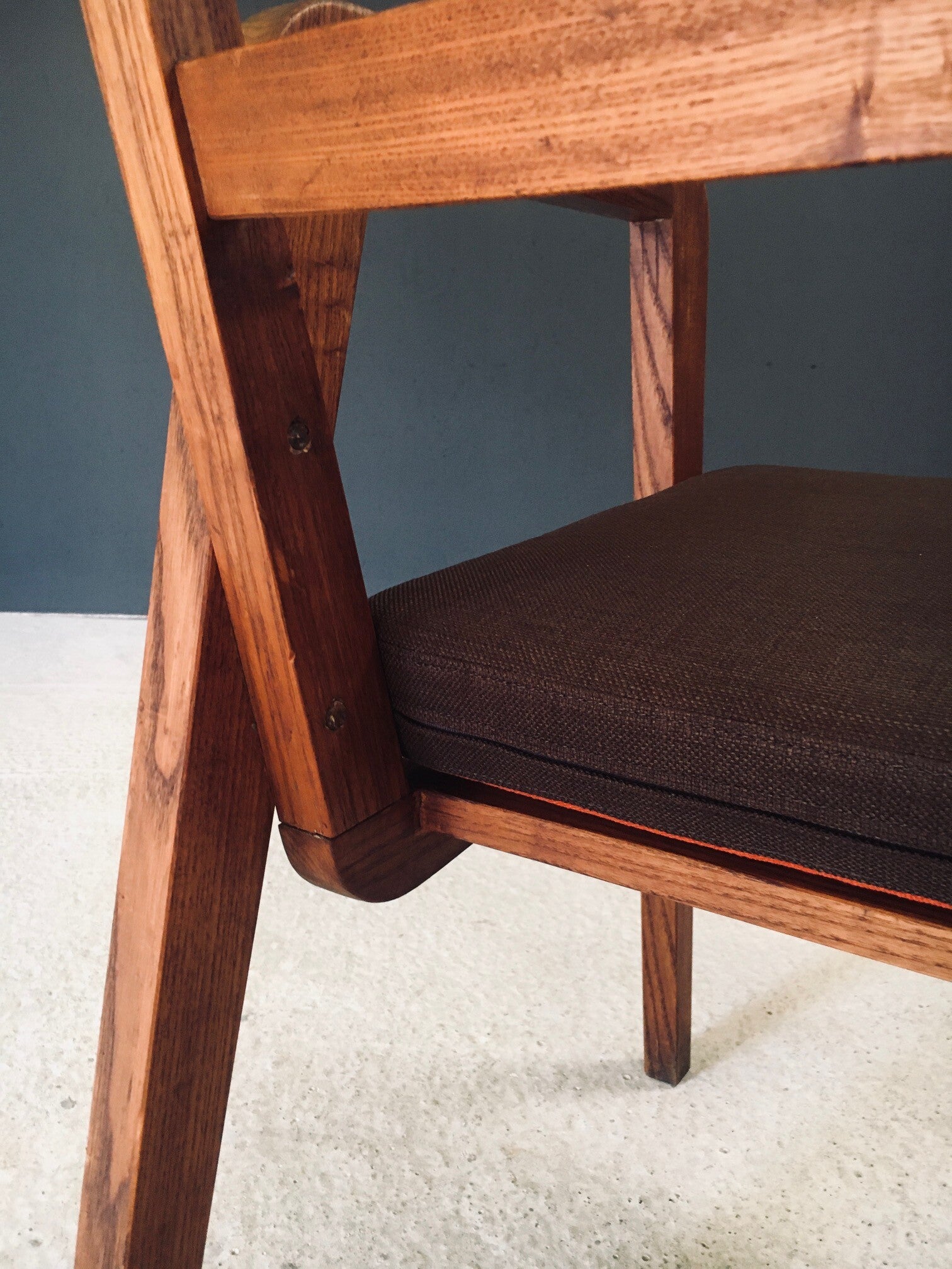 Vintage Modernist Design Armchair. Made in France, 1940's / 50's period. Beautiful open design on this side arm chair. Solid oak constructed chair with newly made cushion in brown and orange woolen fabric. The chair comes in good condition for it's age and past use. This measures 87,5cm x 56cm x 65cm. Seat height is 49cm.