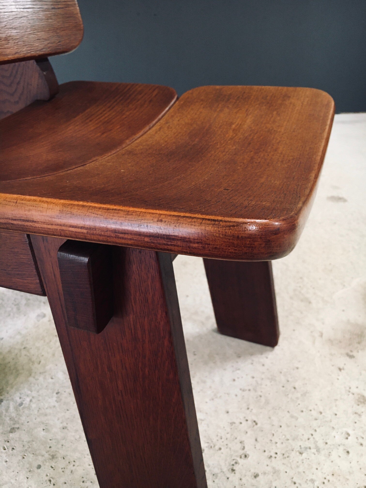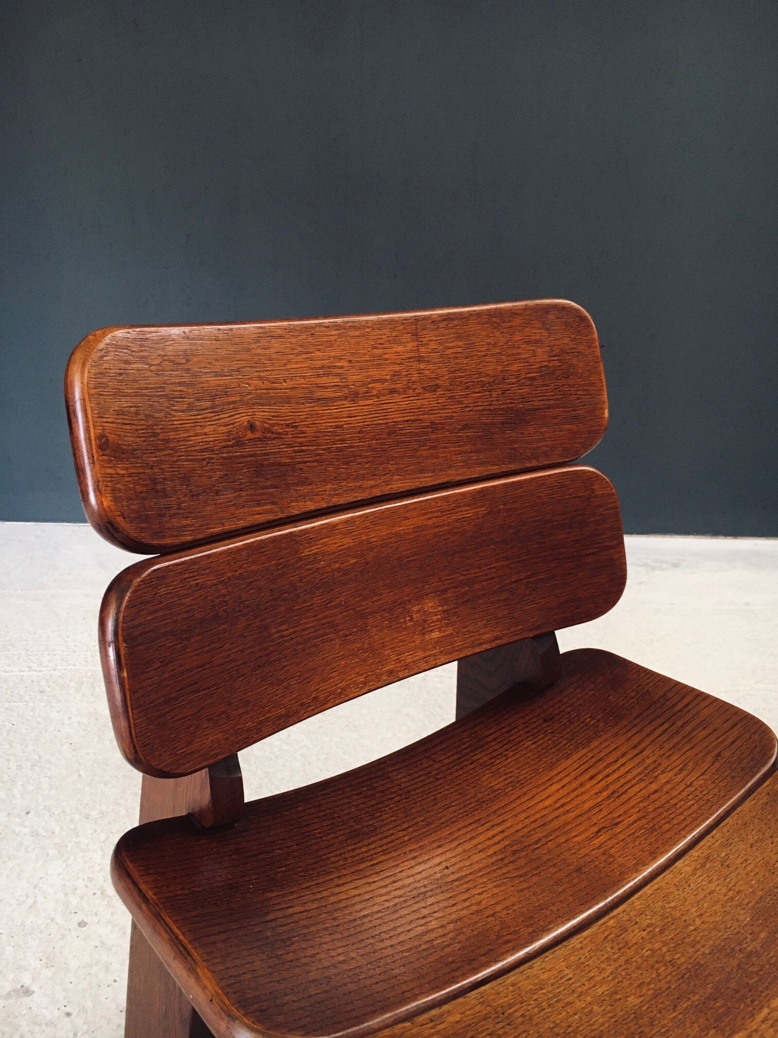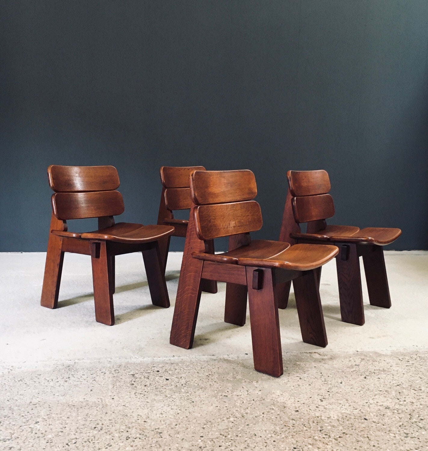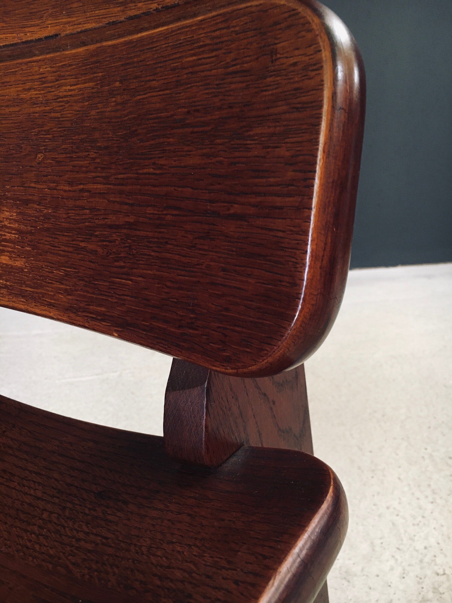 Vintage Constructivist / Brutalist Design Oak Dining Chair set of 4. Made in Belgium, 1960's period. Heavy solid oak constructed Chairs with beautiful construction details. These come in very good, original condition with normal wear from their age and use. Each chair measures 79cm x 52cm x 63cm. Seat height measures 43cm.