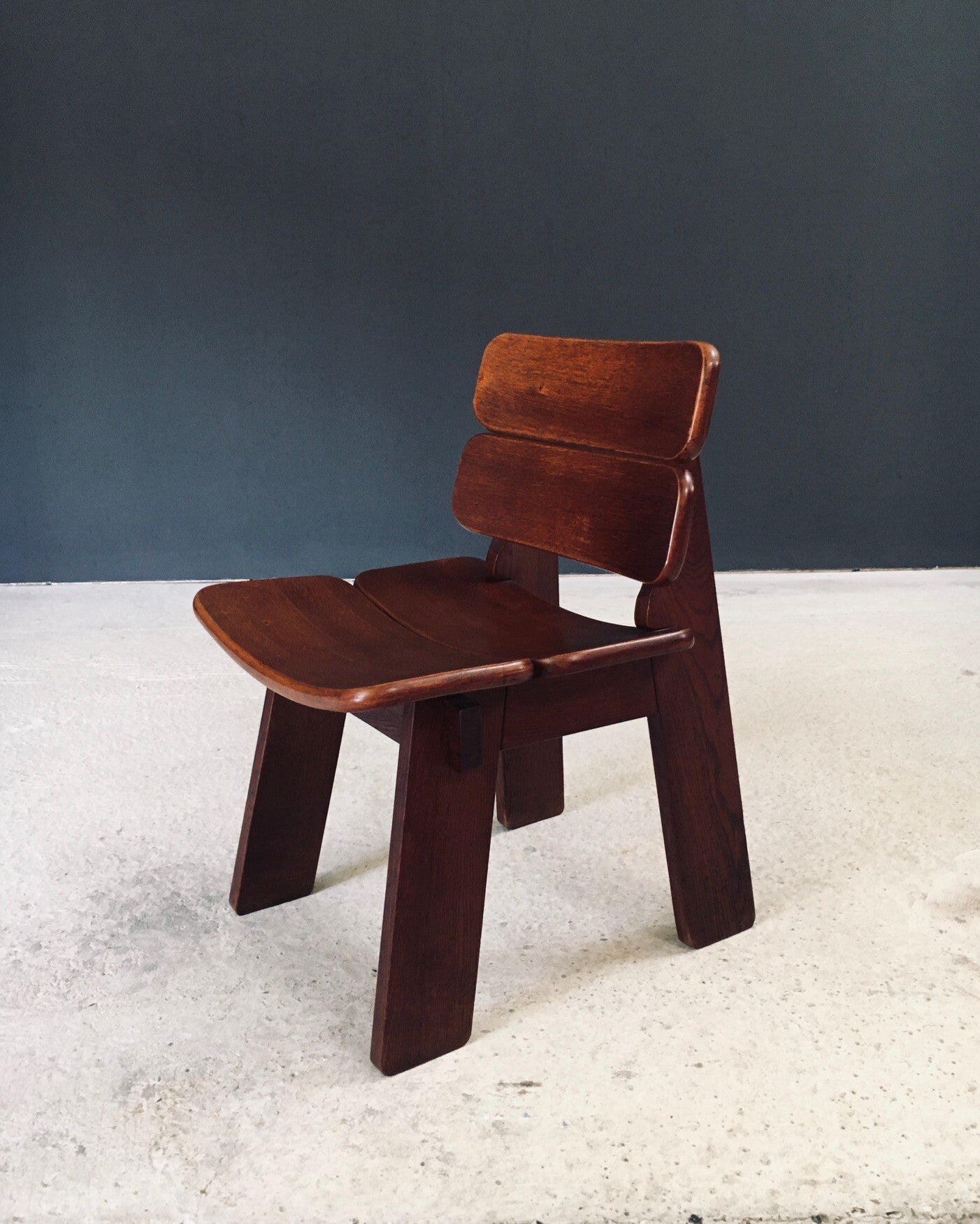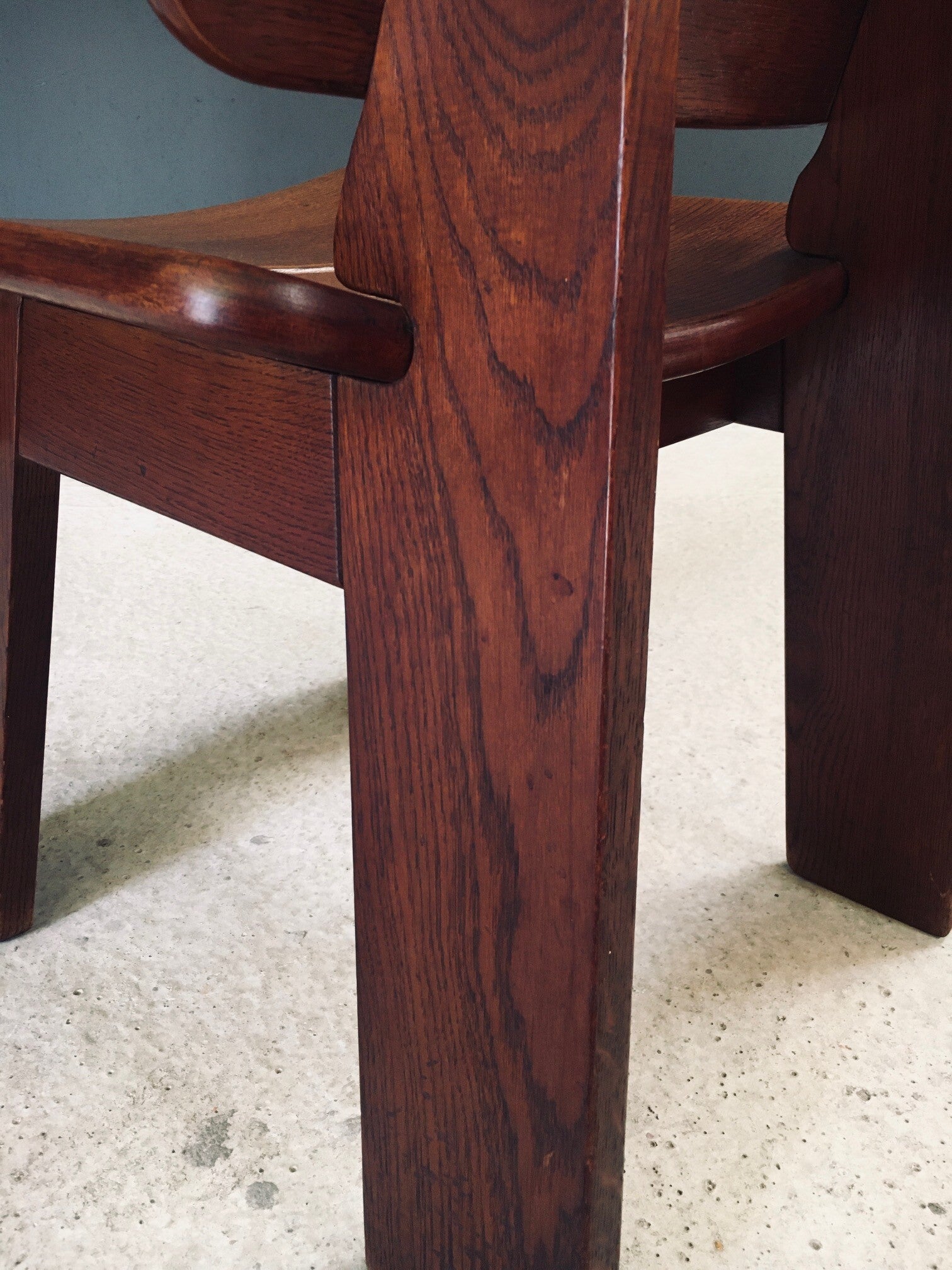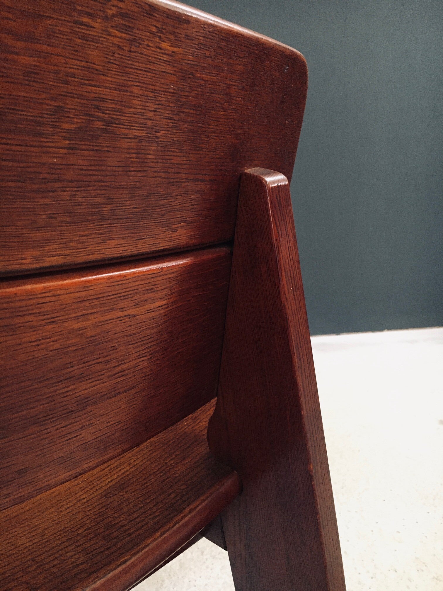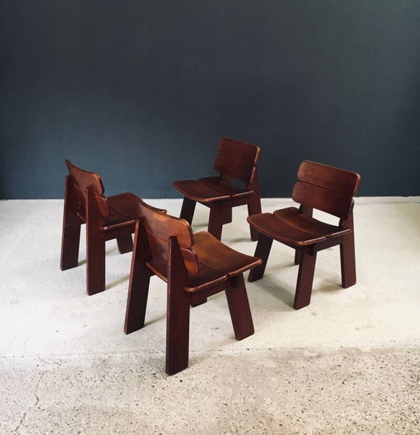 Vintage Constructivist / Brutalist Design Oak Dining Chair set of 4. Made in Belgium, 1960's period. Heavy solid oak constructed Chairs with beautiful construction details. These come in very good, original condition with normal wear from their age and use. Each chair measures 79cm x 52cm x 63cm. Seat height measures 43cm.