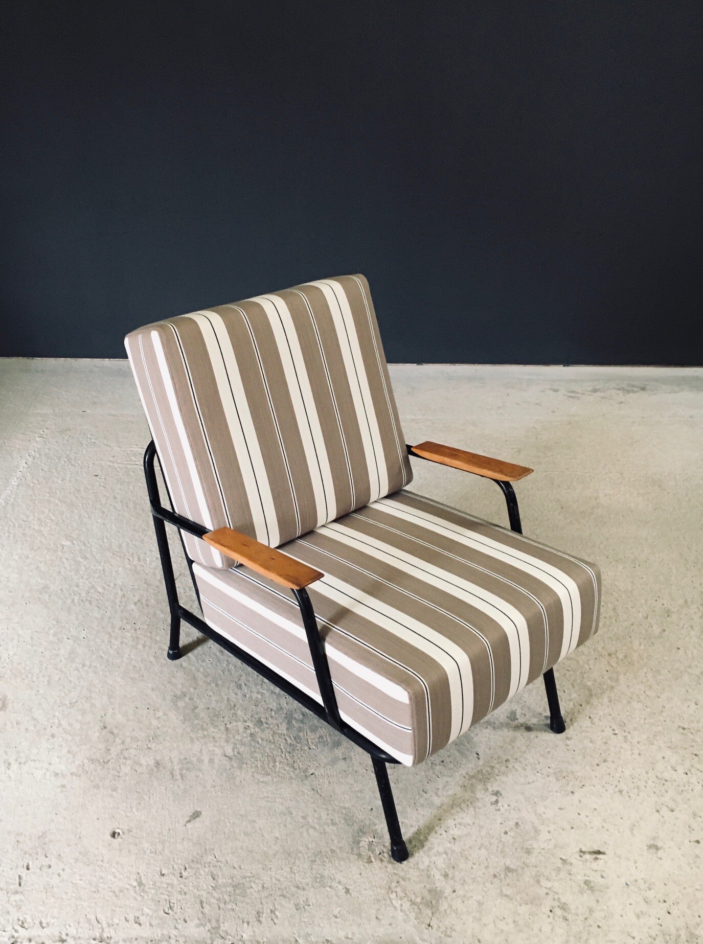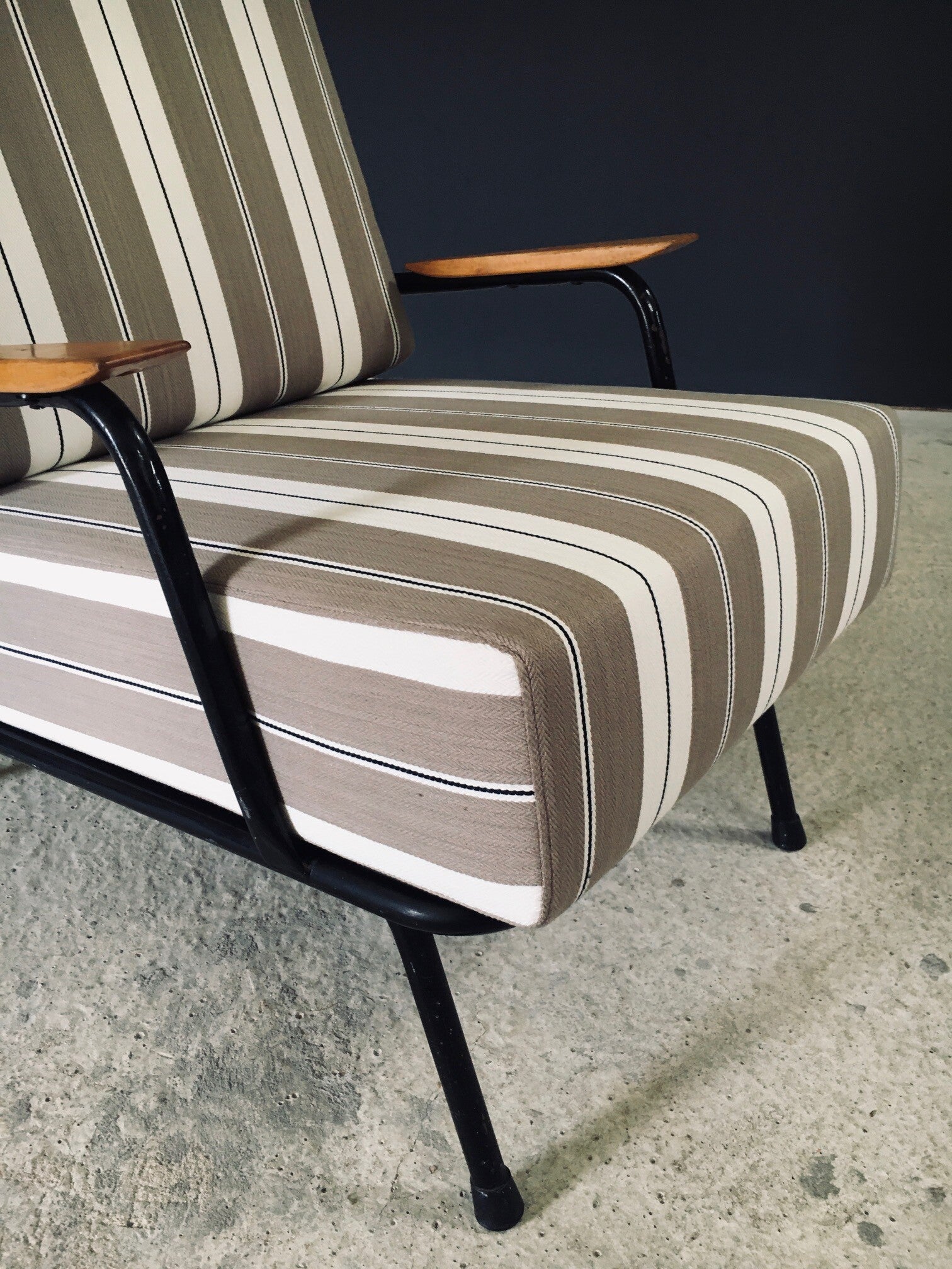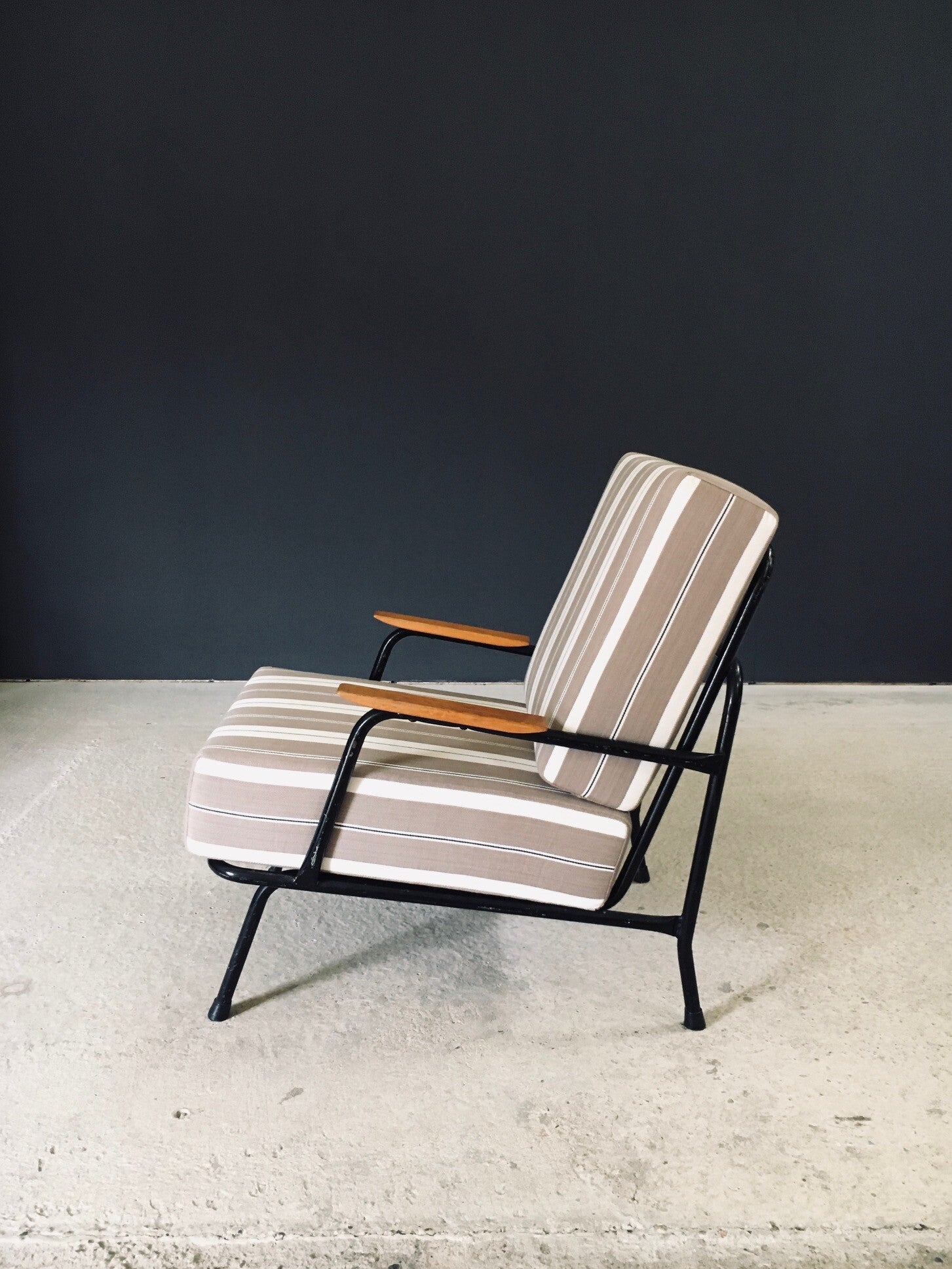 Vintage Midcentury Modern Design Lounge Chair in the manner of Pierre Guariche. Made in France, 1950's period. Black lacquered metal frame with thick all new reupholstered cushions and beech wood armrests. This comes in very good condition. Signs of wear to the black metal frame from it's age and use which gives a nice contrast with the new quality fabric on the cushions. This measures 83cm x 62cm x 86cm. Seat height measures 43cm.