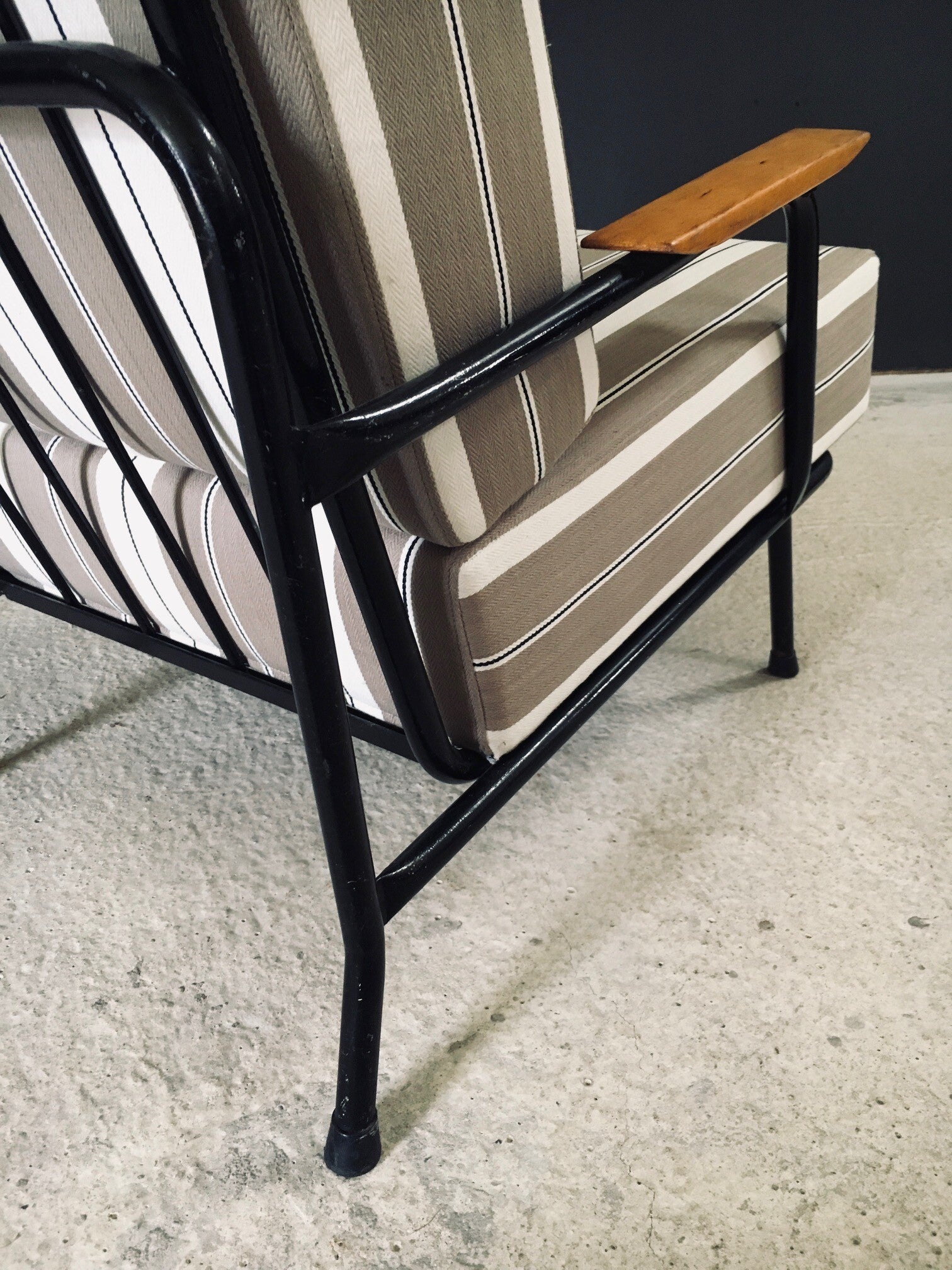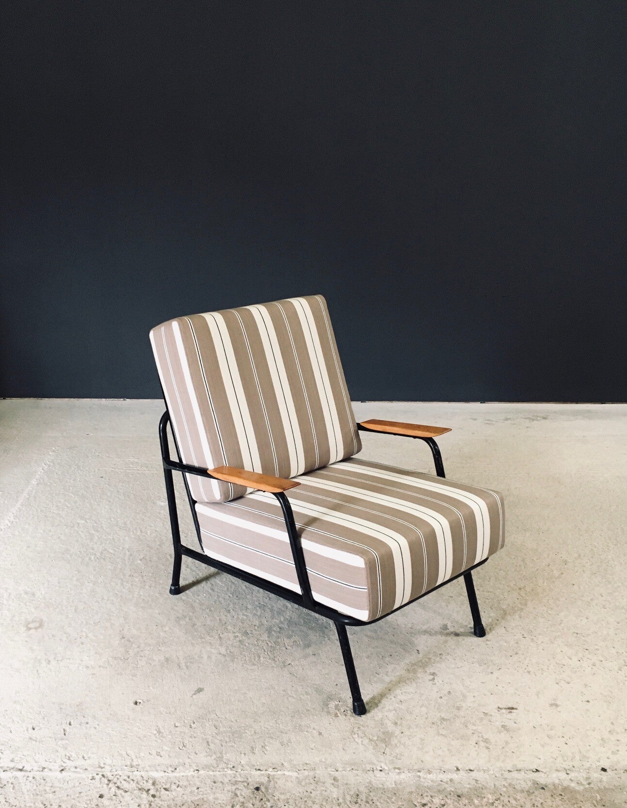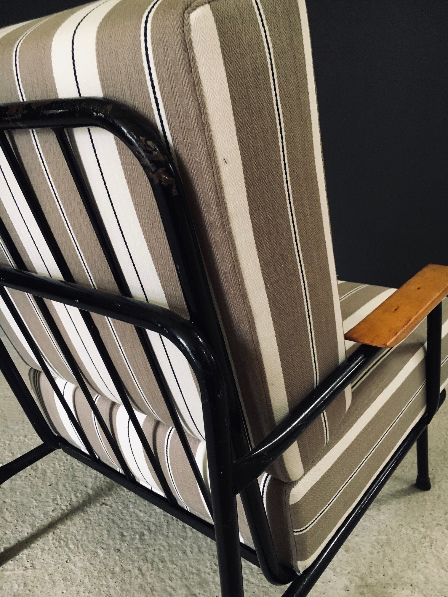 Vintage Midcentury Modern Design Lounge Chair in the manner of Pierre Guariche. Made in France, 1950's period. Black lacquered metal frame with thick all new reupholstered cushions and beech wood armrests. This comes in very good condition. Signs of wear to the black metal frame from it's age and use which gives a nice contrast with the new quality fabric on the cushions. This measures 83cm x 62cm x 86cm. Seat height measures 43cm.