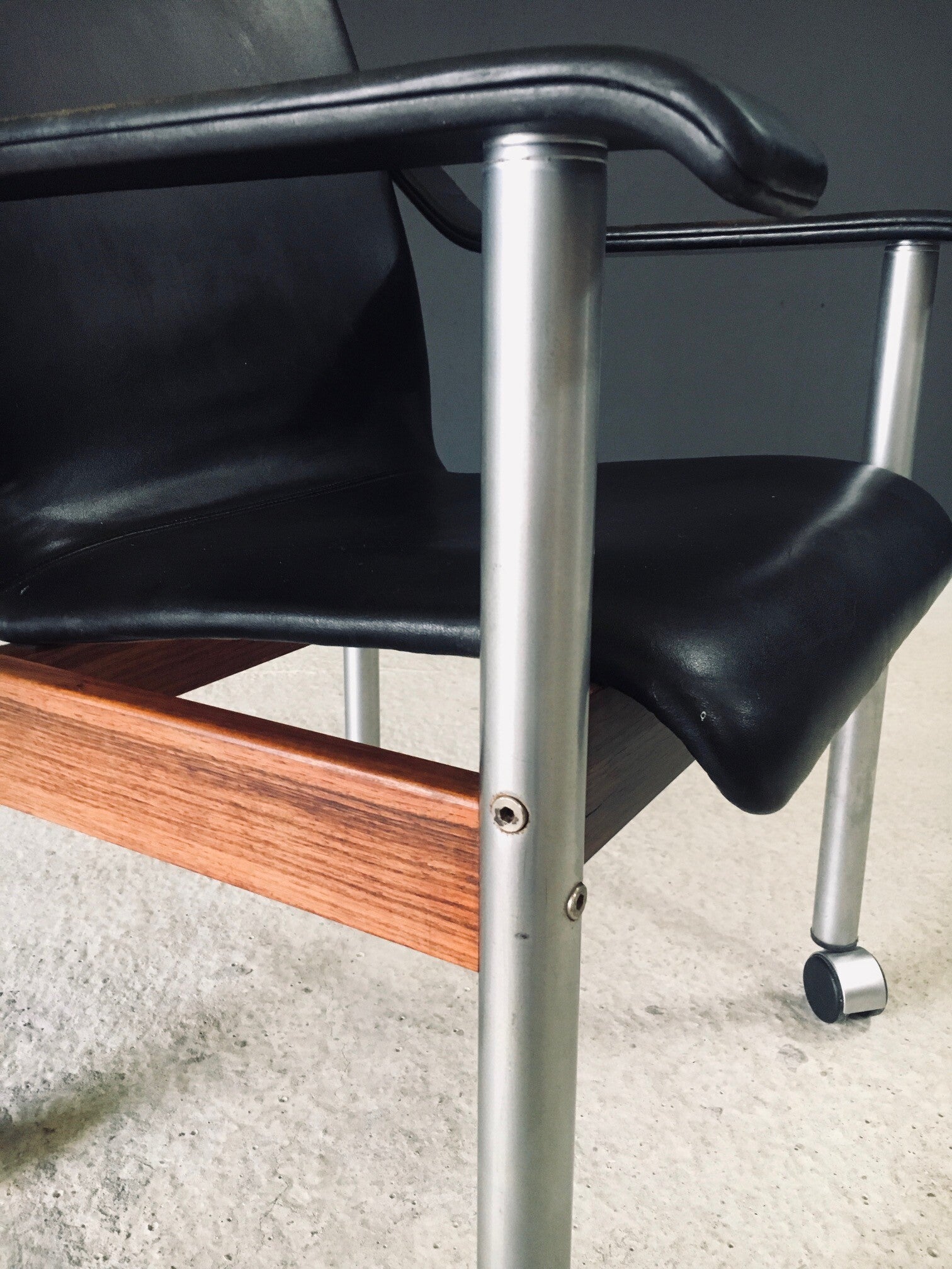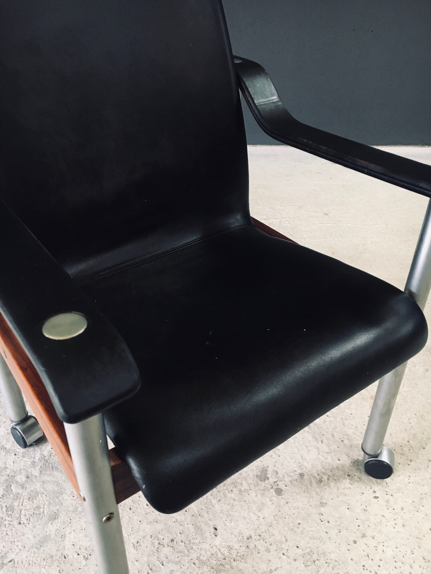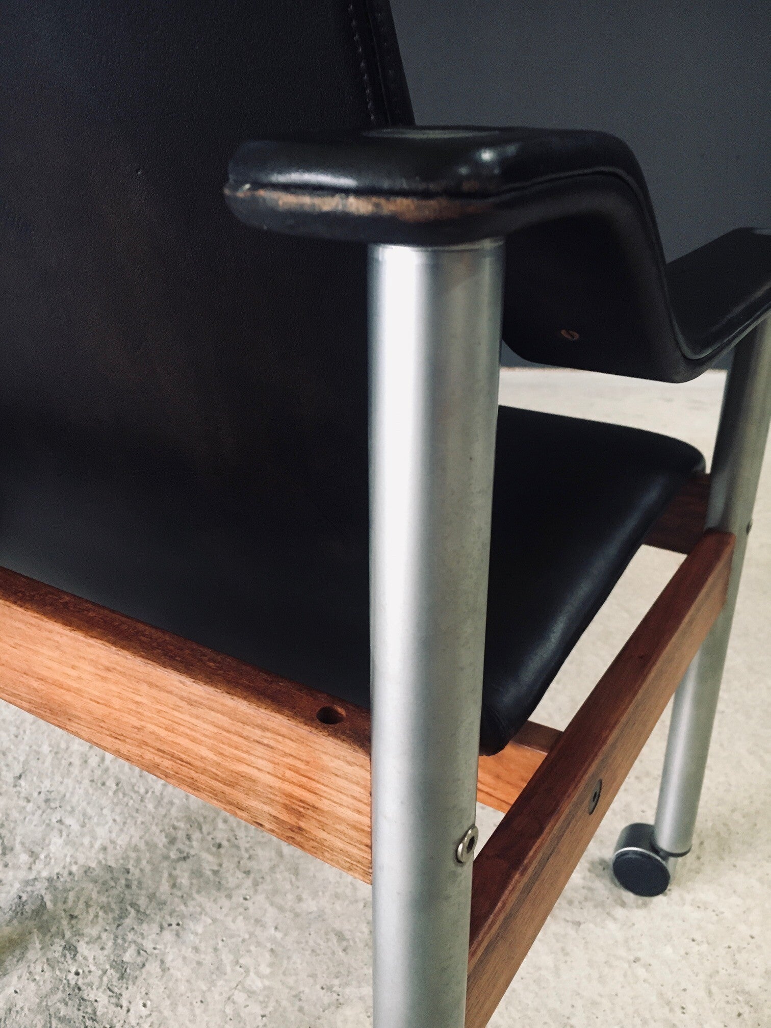 Vintage Midcentury Modern Scandinavian Design Office Chair by Dyrlund. Made in Denmark, 1960's period. Marked with label underneath. Office armchair on wheels/casters. Leather seat and armrests on aluminum and teak wood base. This comes in good, original condition with signs of wear from it's use and age. This measures 85cm x 59cm x 58cm. Seat height measures 42cm.