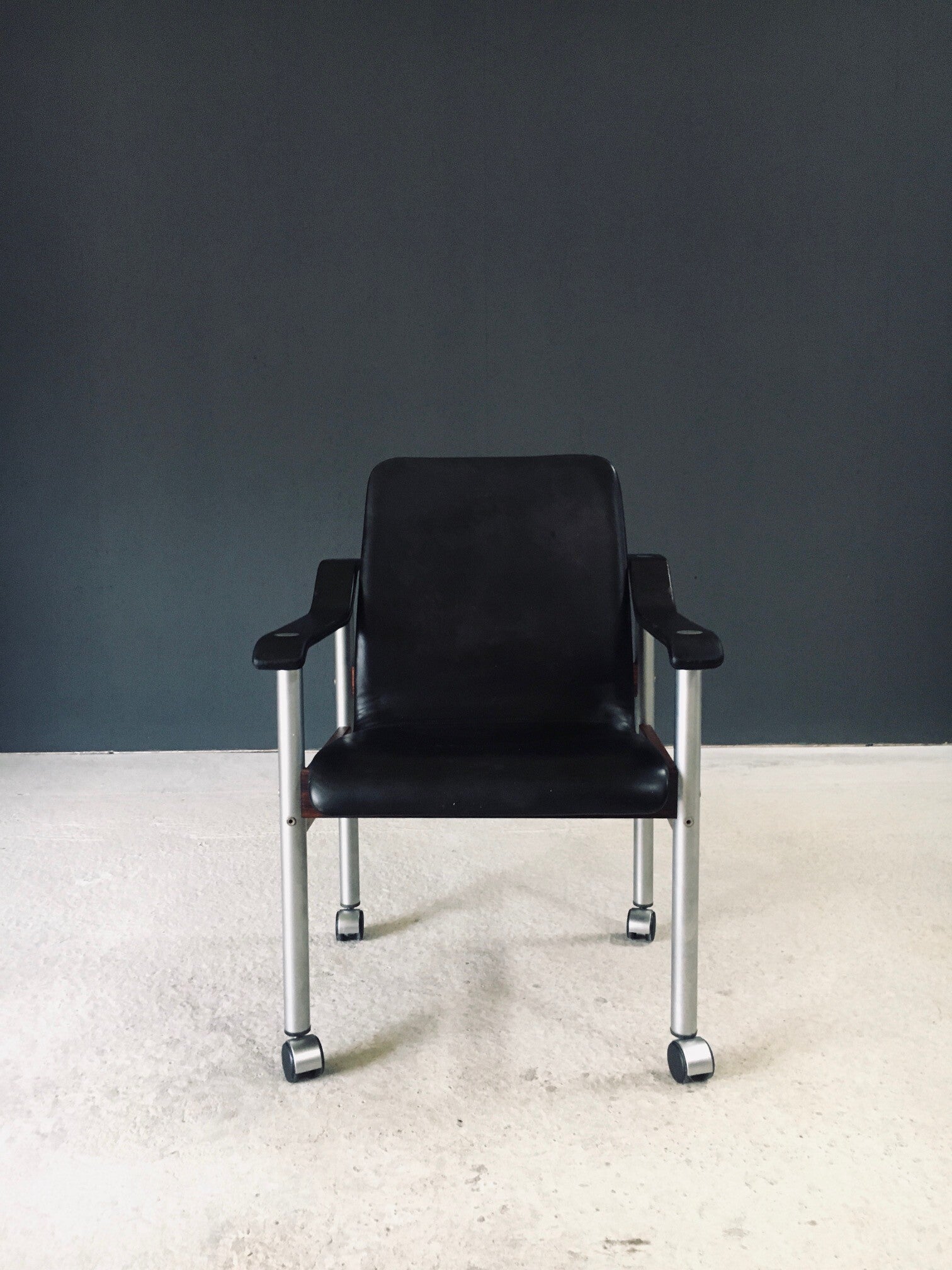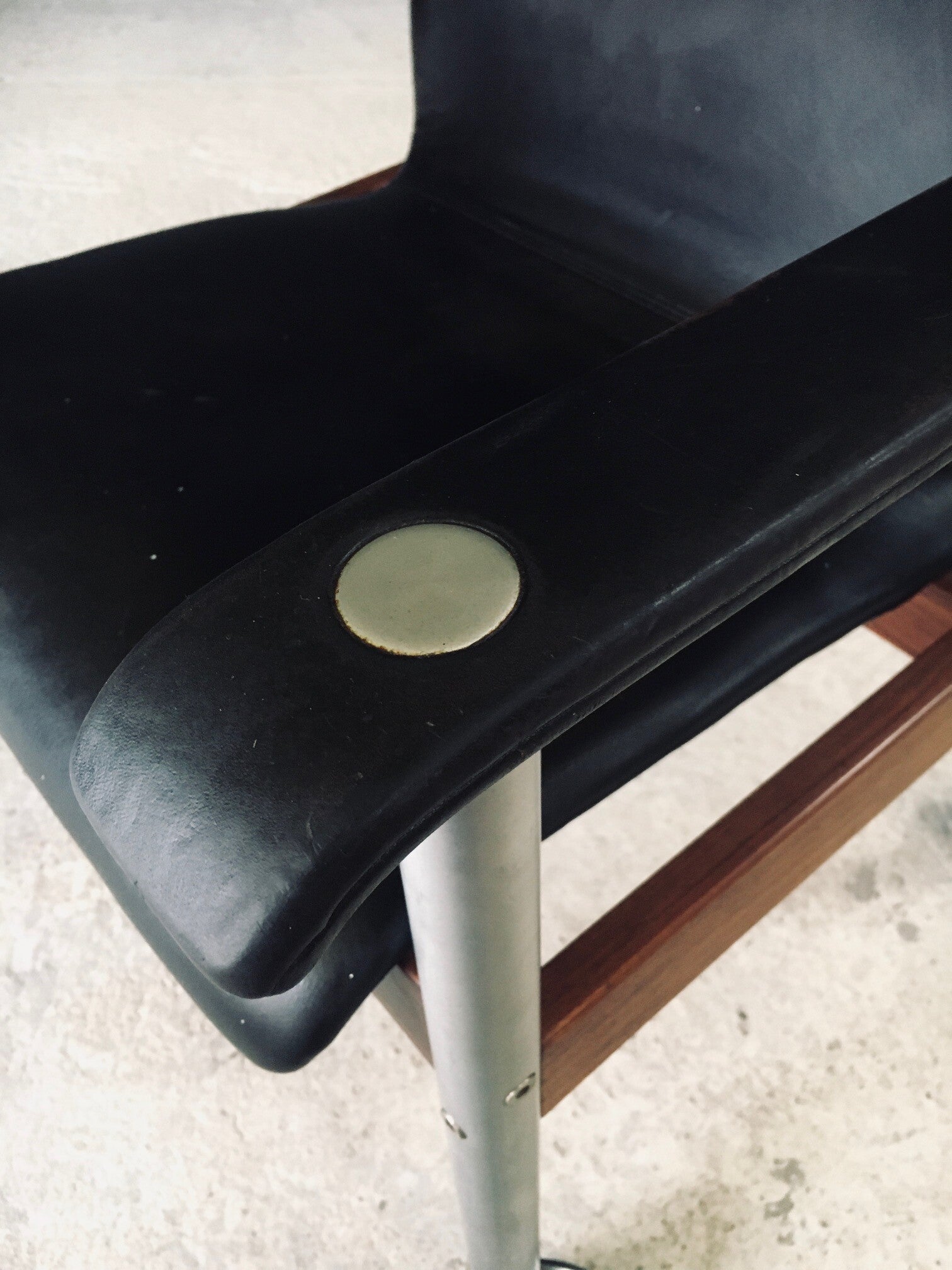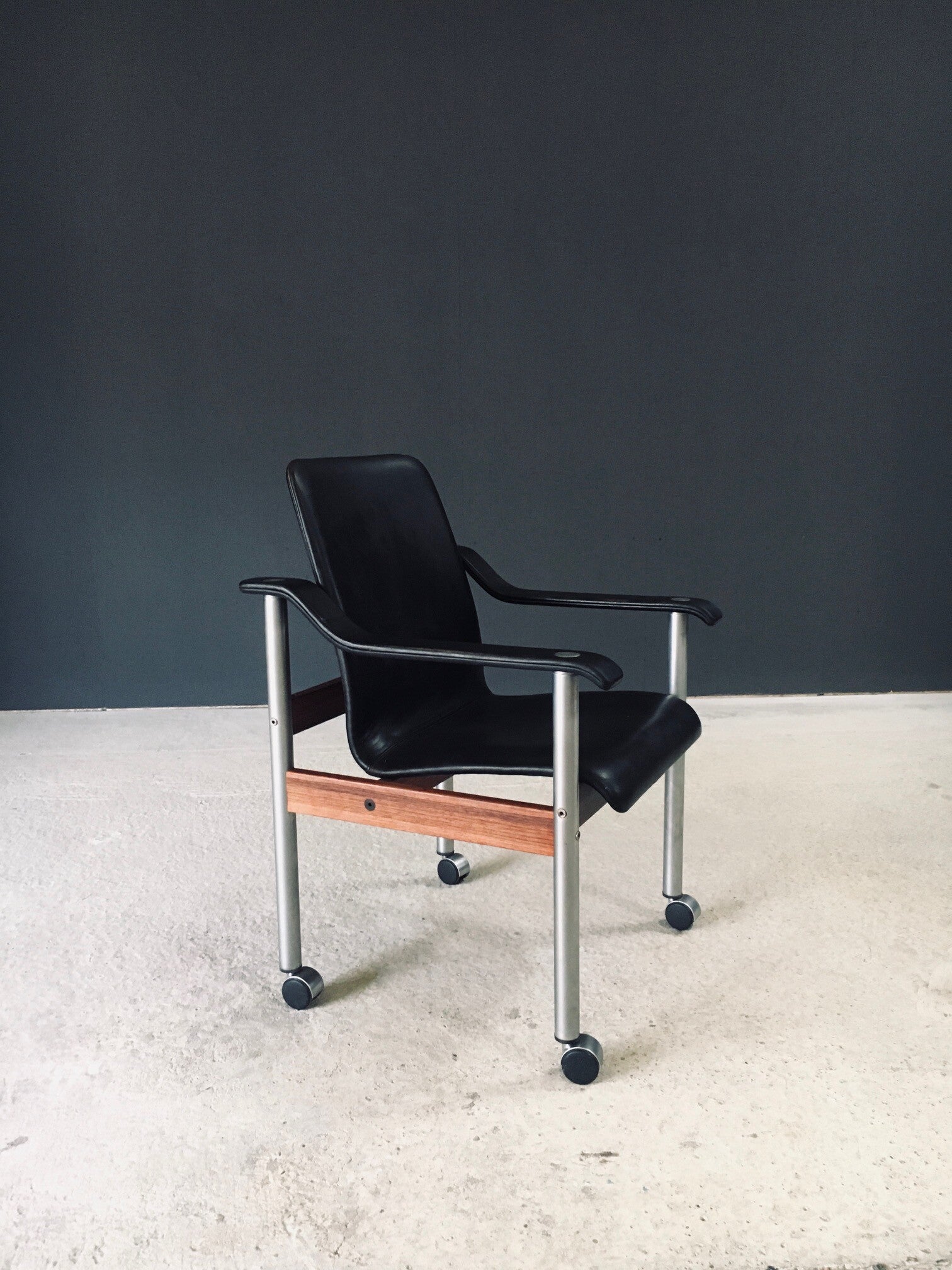 Vintage Midcentury Modern Scandinavian Design Office Chair by Dyrlund. Made in Denmark, 1960's period. Marked with label underneath. Office armchair on wheels/casters. Leather seat and armrests on aluminum and teak wood base. This comes in good, original condition with signs of wear from it's use and age. This measures 85cm x 59cm x 58cm. Seat height measures 42cm.