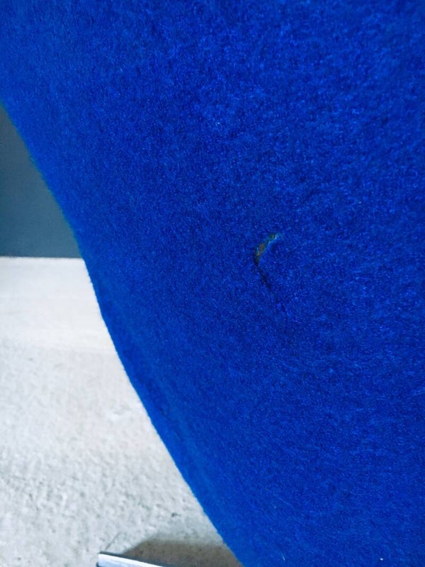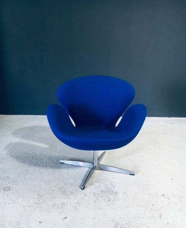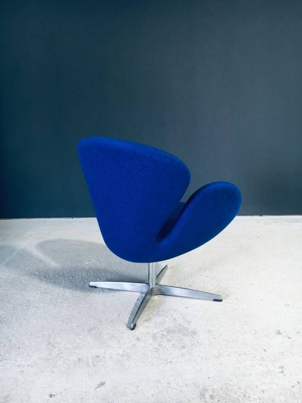 Vintage Midcentury Modern Scandinavian Design "SWAN" Arm Chair by Arne Jacobsen. Made in Denmark, 1960's / 70's period. Swan lounge chair model in electric blue wool fabric. This comes in good, all original condition with normal signs of wear from it's use and age. It's missing one black base support and has 2 punctures in the blue woolen fabric (see pictures). This measures 76,5cm x 74cm x 60cm. Seat height measures 40cm.